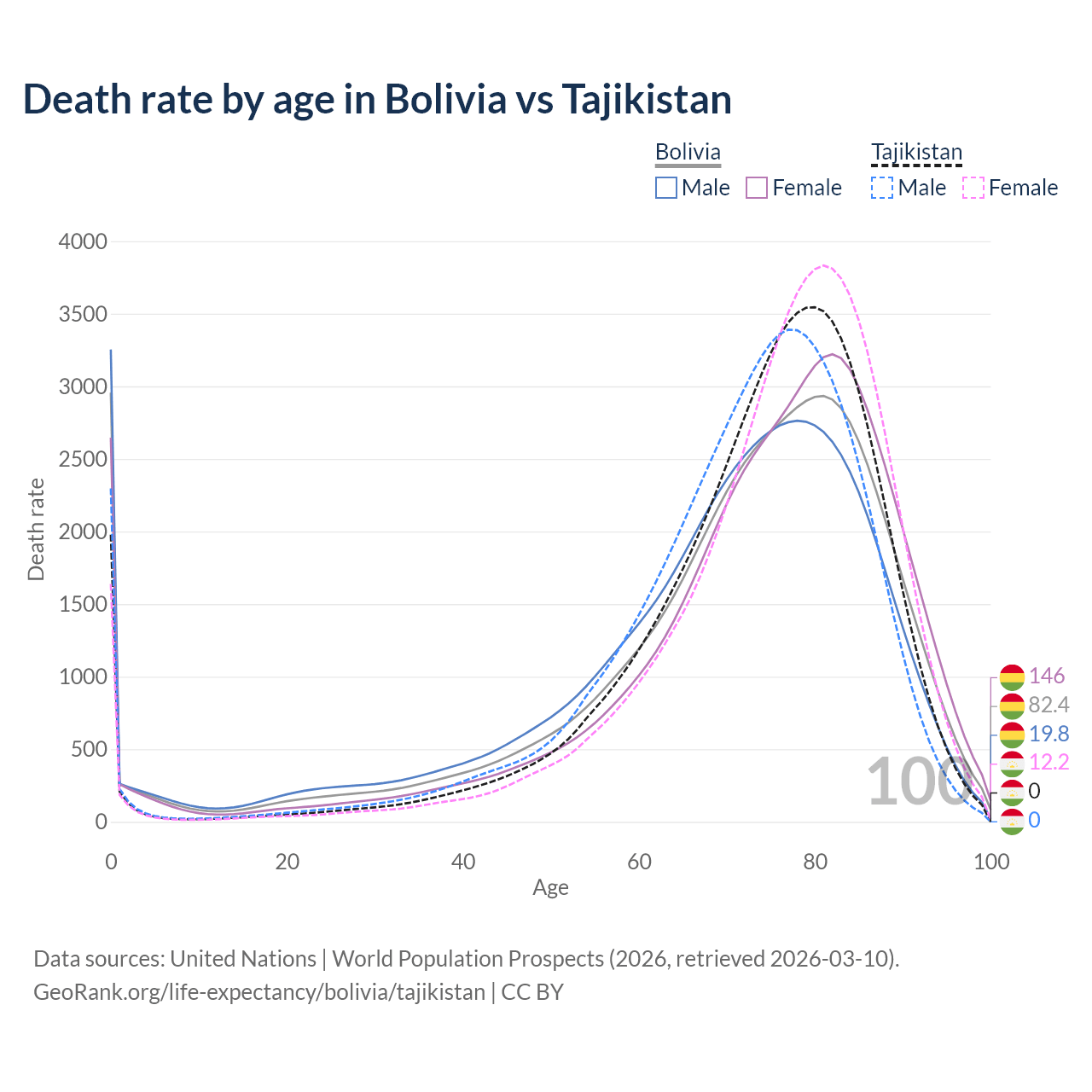 In Bolivia, the most common age of death is 0, compared to 80 in Tajikistan. The median age of death is 74.5 in Bolivia and 76 in Tajikistan, meaning only half of each cohort is expected to live past that age.