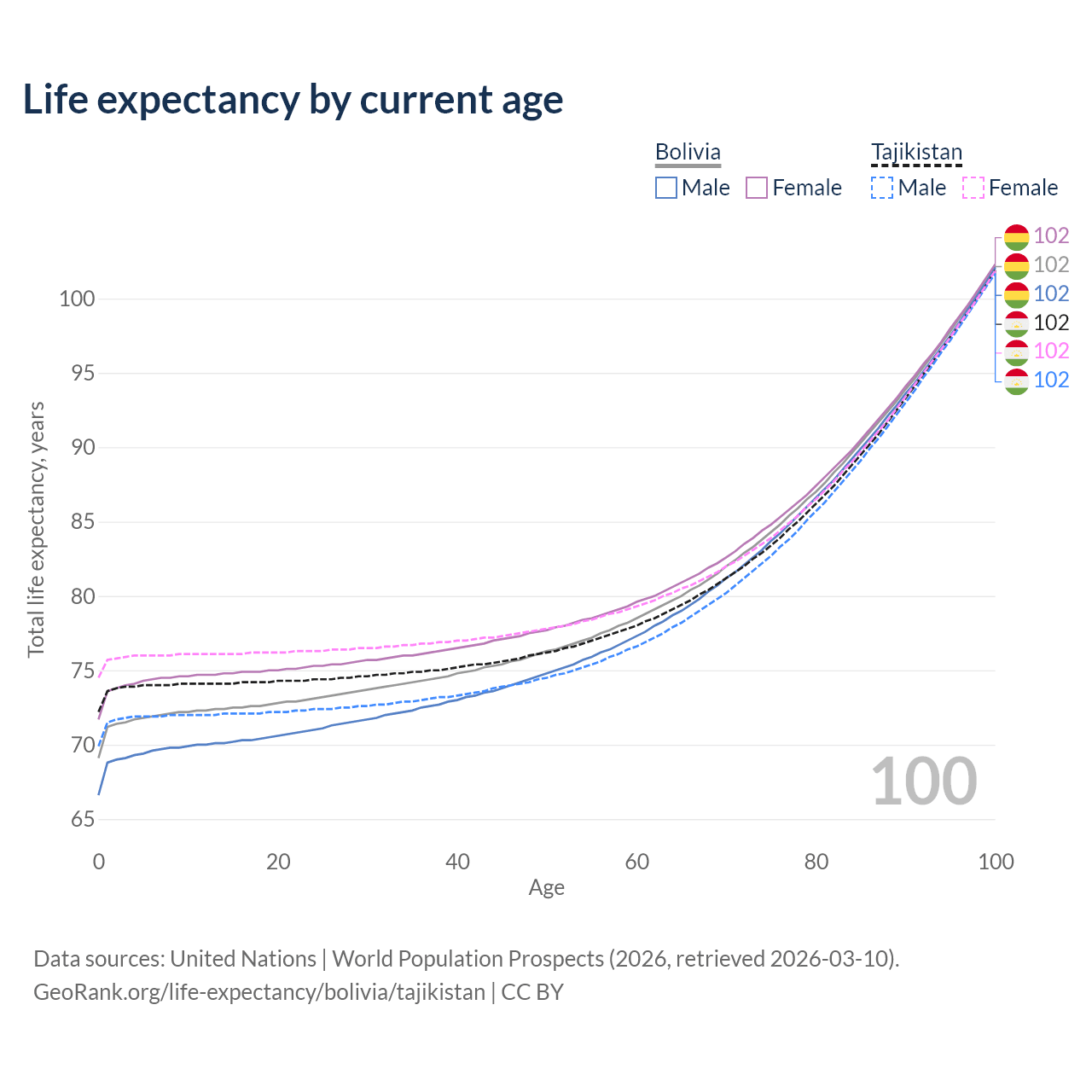 This life expectancy calculator shows the odds of living to 100, 95, 90, and below based on current age for both males and females in Bolivia and Tajikistan, along with mean and median age of death. The calculations are based on the 2026 life tables (actuarial tables) from the UN World Population Prospects.