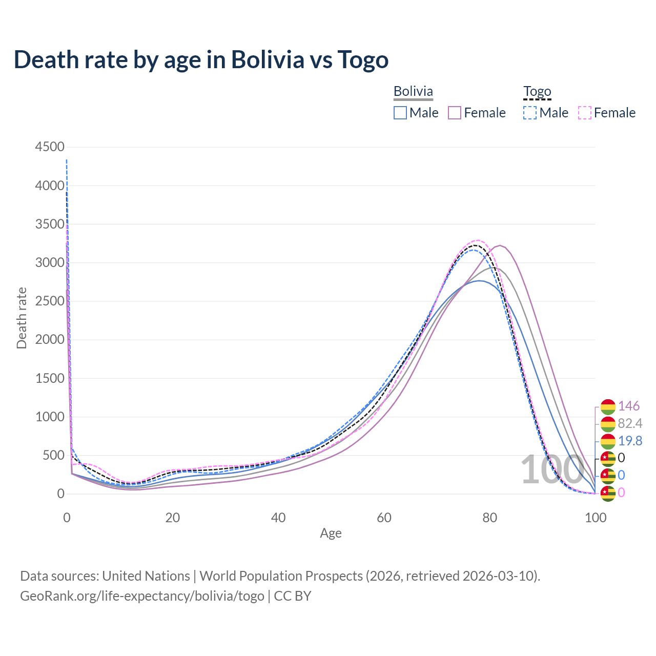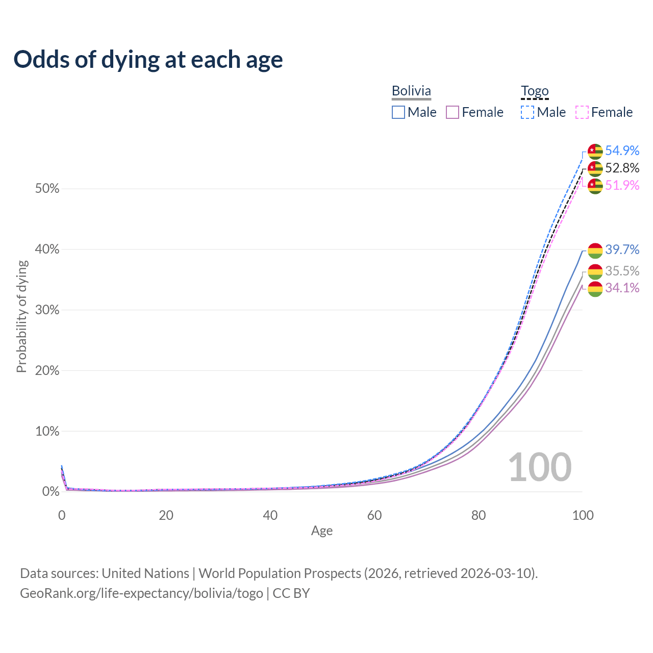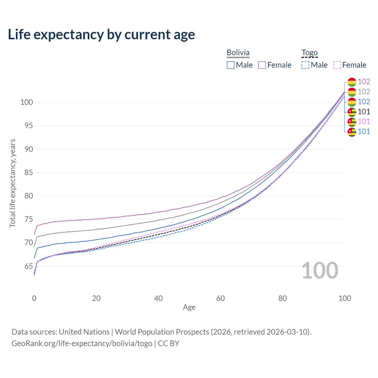 This life expectancy calculator shows the odds of living to 100, 95, 90, and below based on current age for both males and females in Bolivia and Togo, along with mean and median age of death. The calculations are based on the 2026 life tables (actuarial tables) from the UN World Population Prospects.