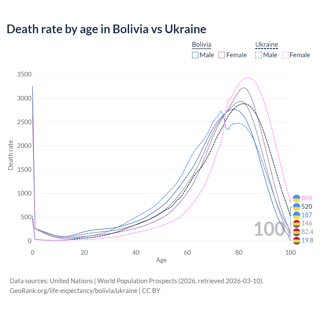 In Bolivia, the most common age of death is 0, compared to 82 in Ukraine. The median age of death is 74.5 in Bolivia and 78 in Ukraine, meaning only half of each cohort is expected to live past that age.