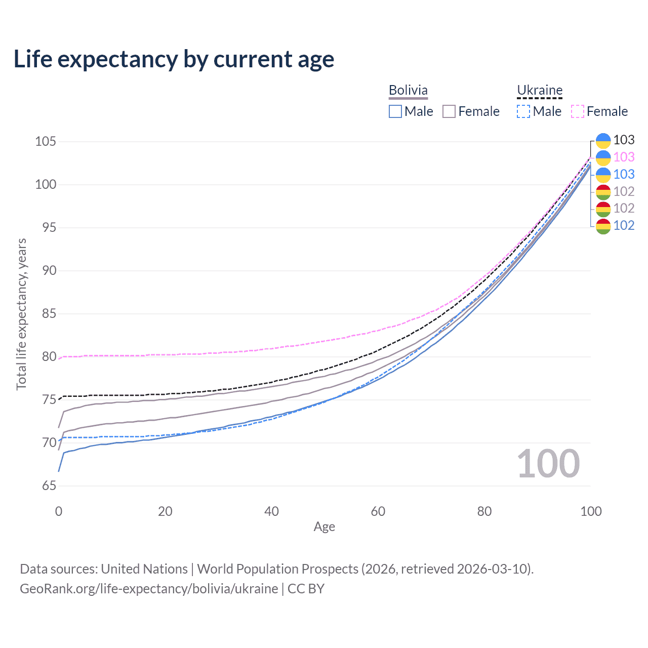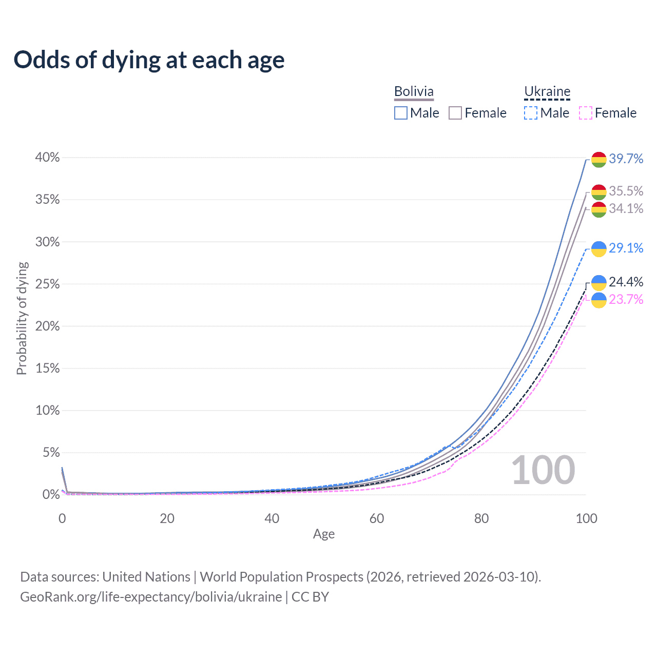 This life expectancy calculator shows the odds of living to 100, 95, 90, and below based on current age for both males and females in Bolivia and Ukraine, along with mean and median age of death. The calculations are based on the 2026 life tables (actuarial tables) from the UN World Population Prospects.