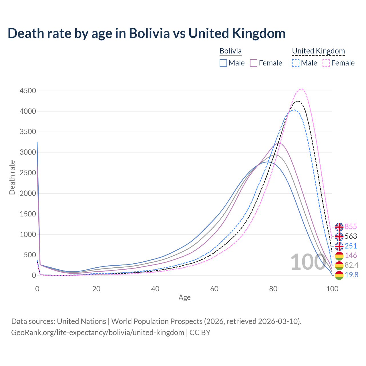 In Bolivia, the most common age of death is 0, compared to 88 in the United Kingdom. The median age of death is 74.5 in Bolivia and 84.9 in the United Kingdom, meaning only half of each cohort is expected to live past that age.