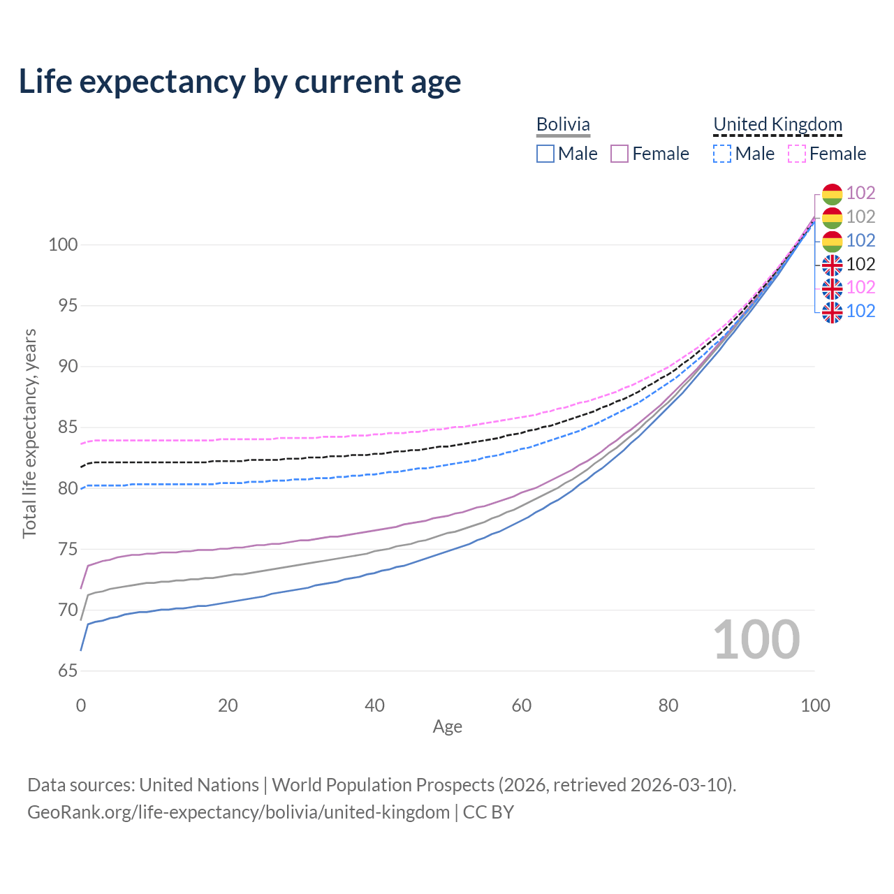 This life expectancy calculator shows the odds of living to 100, 95, 90, and below based on current age for both males and females in Bolivia and the United Kingdom, along with mean and median age of death. The calculations are based on the 2026 life tables (actuarial tables) from the UN World Population Prospects.
