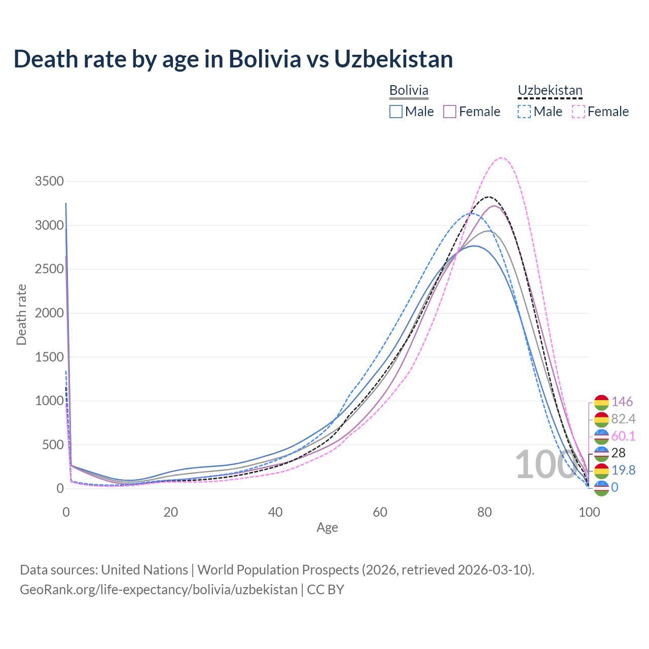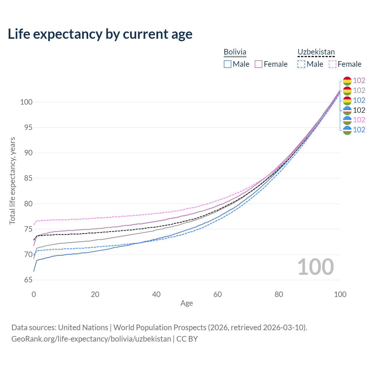This life expectancy calculator shows the odds of living to 100, 95, 90, and below based on current age for both males and females in Bolivia and Uzbekistan, along with mean and median age of death. The calculations are based on the 2026 life tables (actuarial tables) from the UN World Population Prospects.