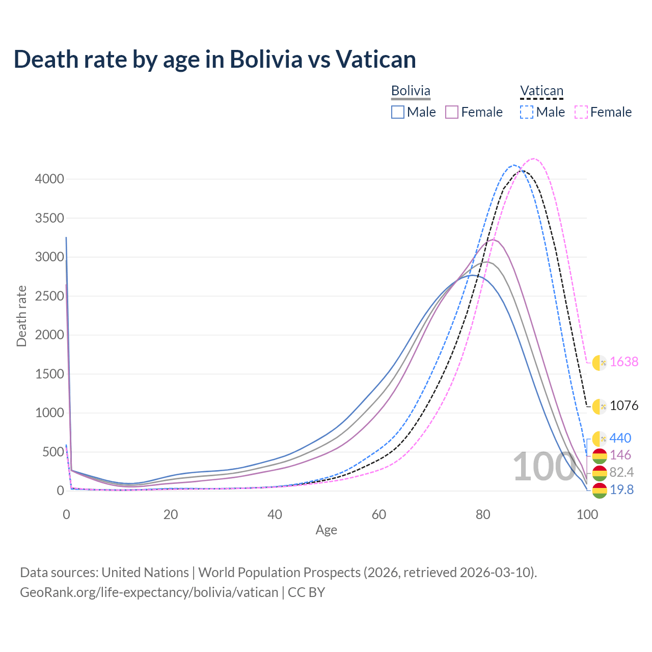 In Bolivia, the most common age of death is 0, compared to 88 in the Vatican. The median age of death is 74.5 in Bolivia and 85.7 in the Vatican, meaning only half of each cohort is expected to live past that age.
