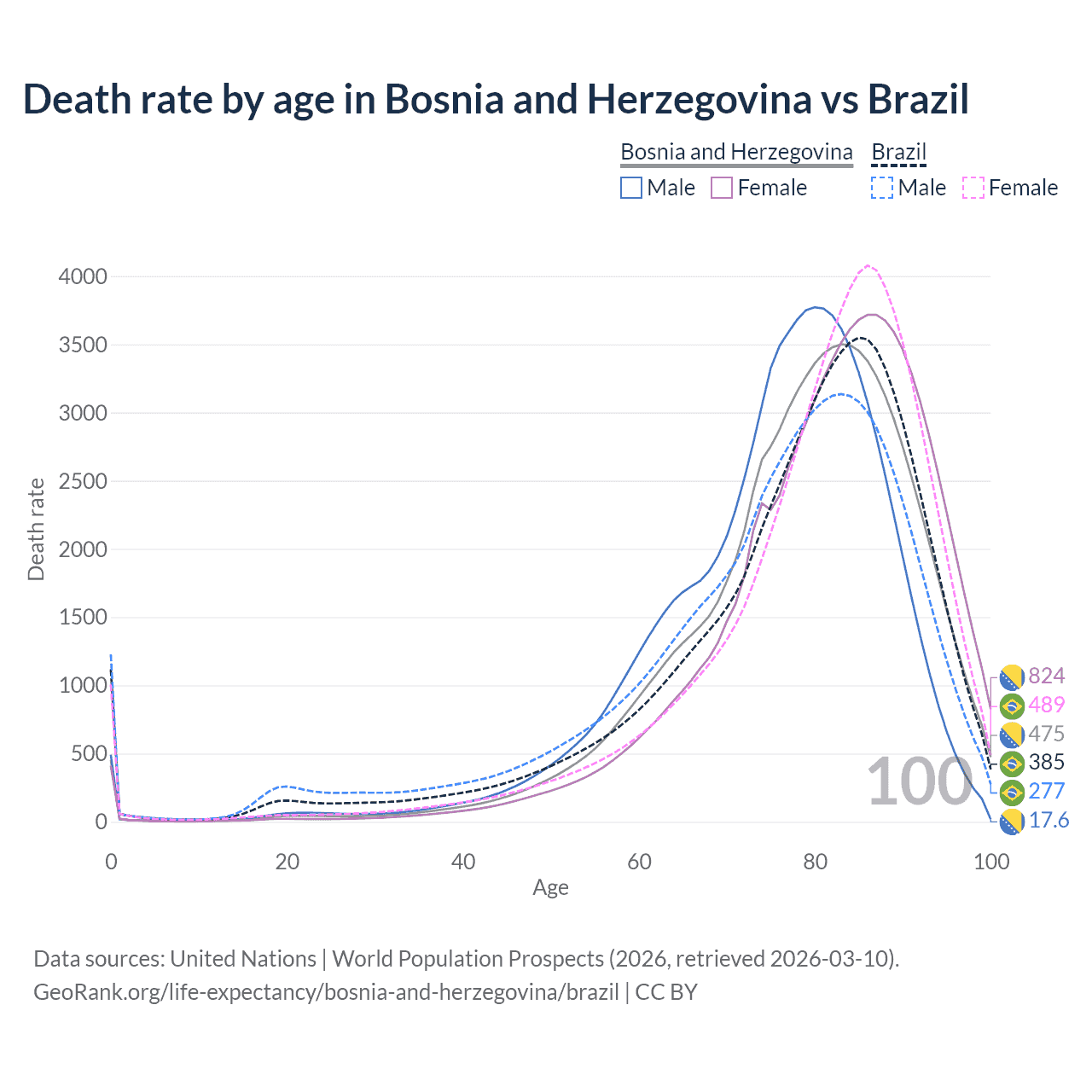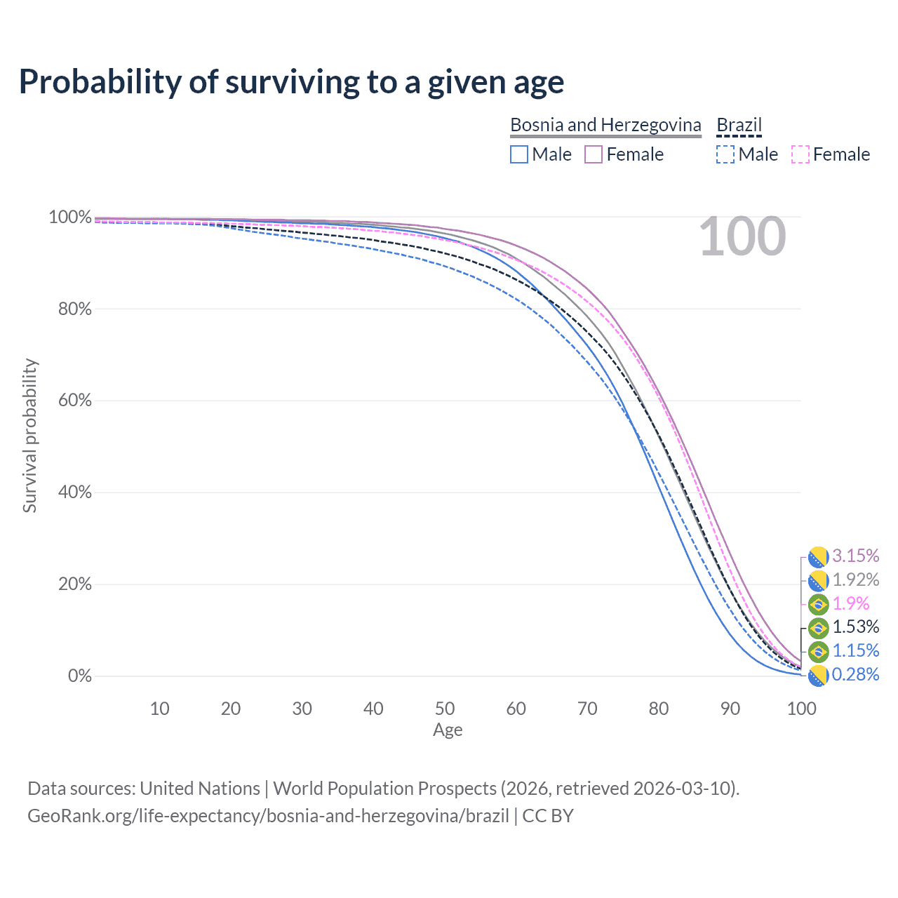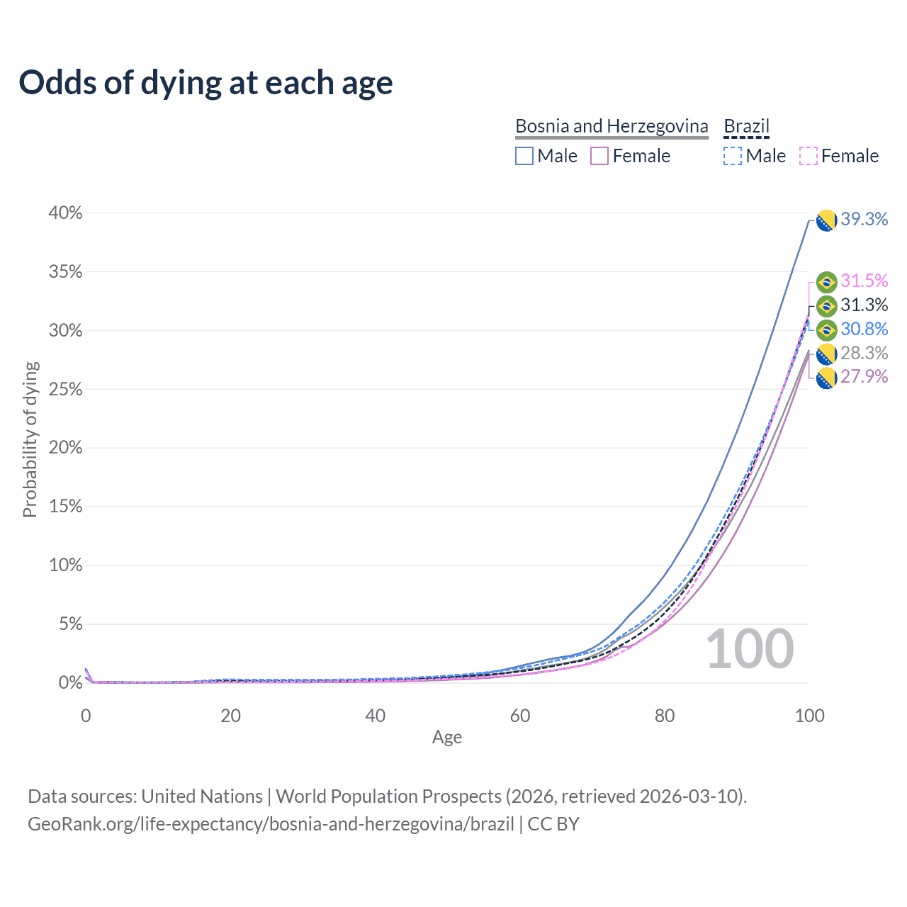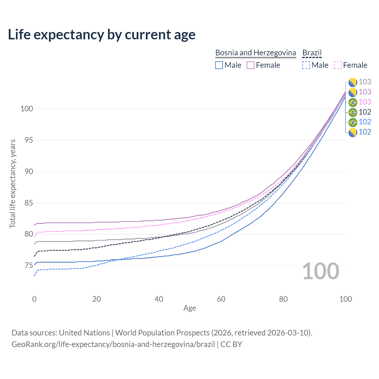 This life expectancy calculator shows the odds of living to 100, 95, 90, and below based on current age for both males and females in Bosnia and Herzegovina and Brazil, along with mean and median age of death. The calculations are based on the 2026 life tables (actuarial tables) from the UN World Population Prospects.
