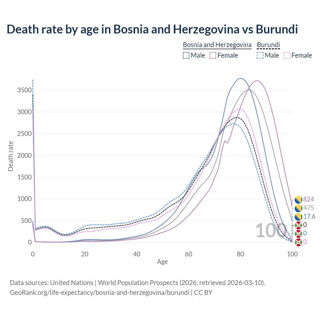 In Bosnia and Herzegovina, the most common age of death is 83, compared to 0 in Burundi. The median age of death is 80.7 in Bosnia and Herzegovina and 71.6 in Burundi, meaning only half of each cohort is expected to live past that age.