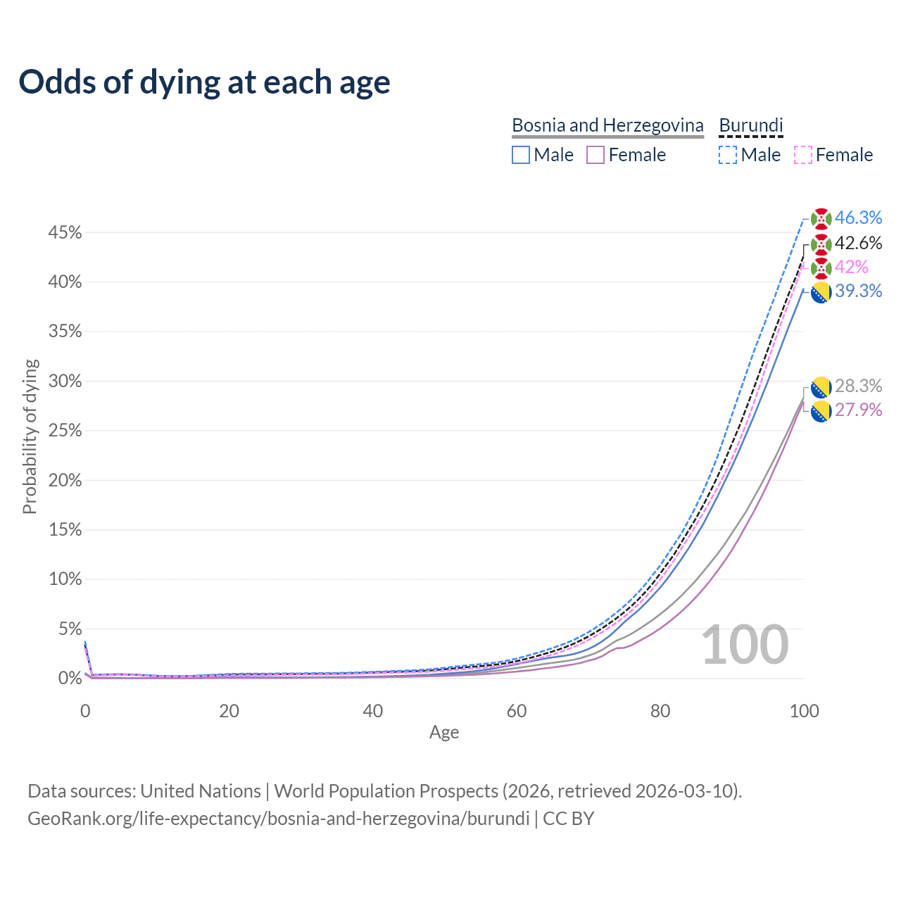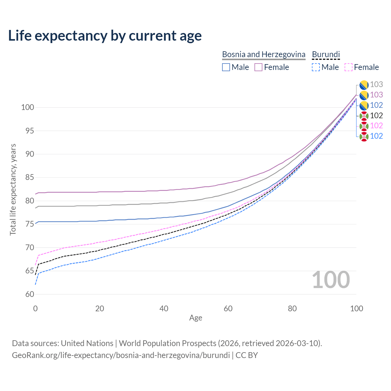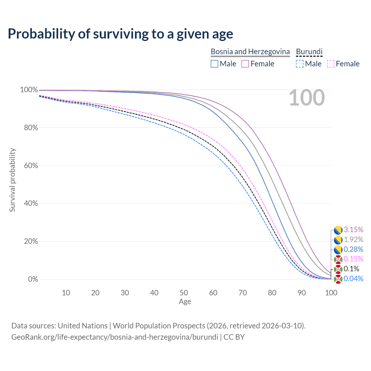 This life expectancy calculator shows the odds of living to 100, 95, 90, and below based on current age for both males and females in Bosnia and Herzegovina and Burundi, along with mean and median age of death. The calculations are based on the 2026 life tables (actuarial tables) from the UN World Population Prospects.