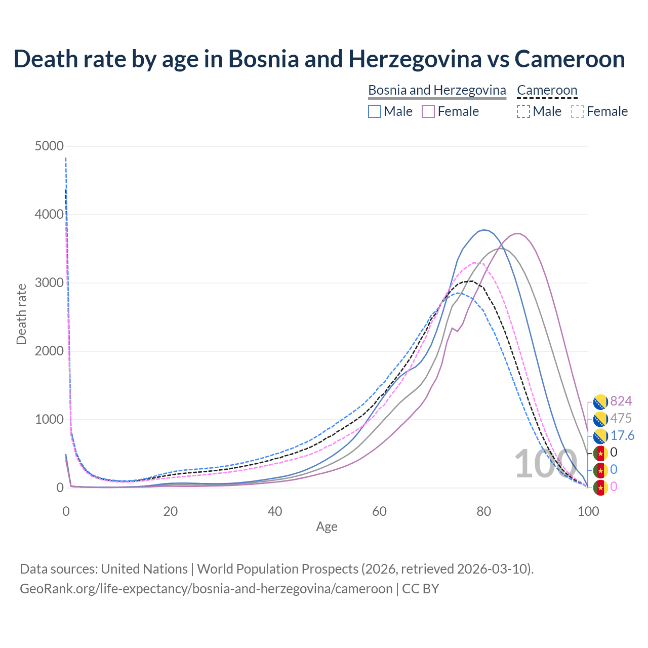 In Bosnia and Herzegovina, the most common age of death is 83, compared to 0 in Cameroon. The median age of death is 80.7 in Bosnia and Herzegovina and 71.6 in Cameroon, meaning only half of each cohort is expected to live past that age.