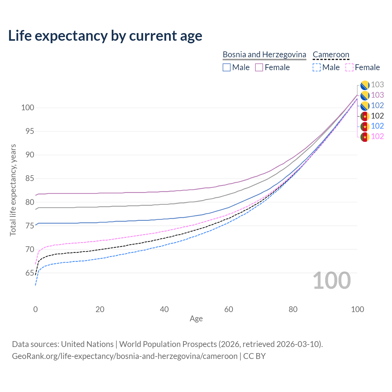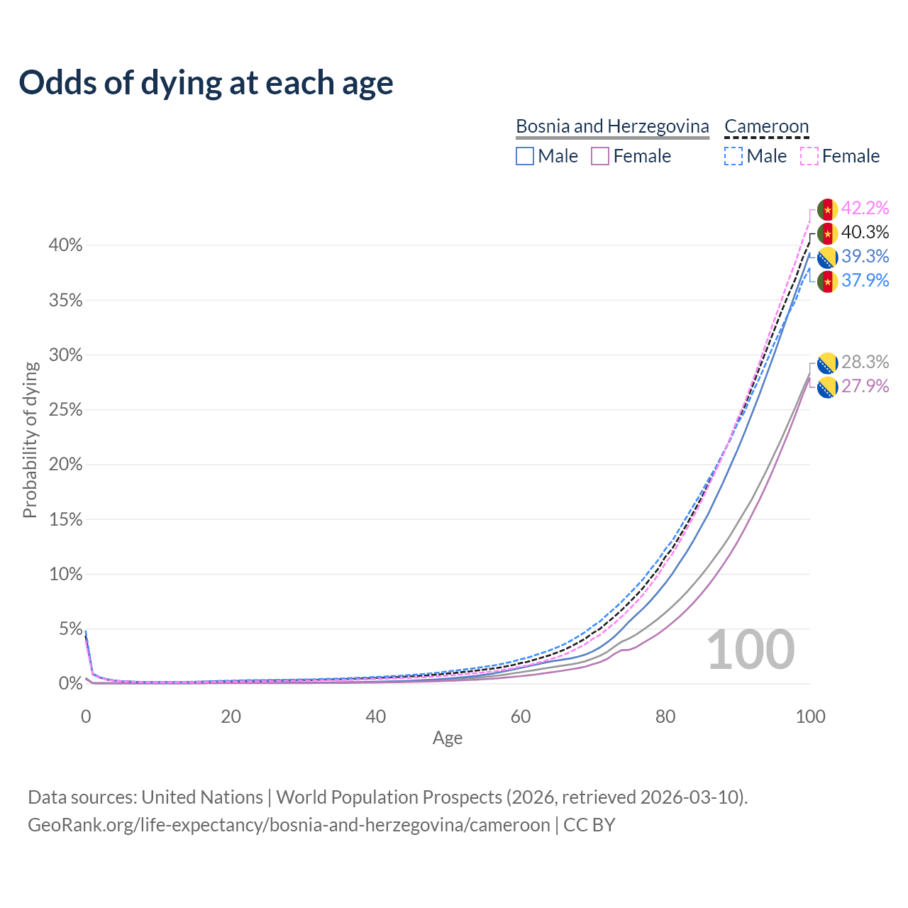 This life expectancy calculator shows the odds of living to 100, 95, 90, and below based on current age for both males and females in Bosnia and Herzegovina and Cameroon, along with mean and median age of death. The calculations are based on the 2026 life tables (actuarial tables) from the UN World Population Prospects.