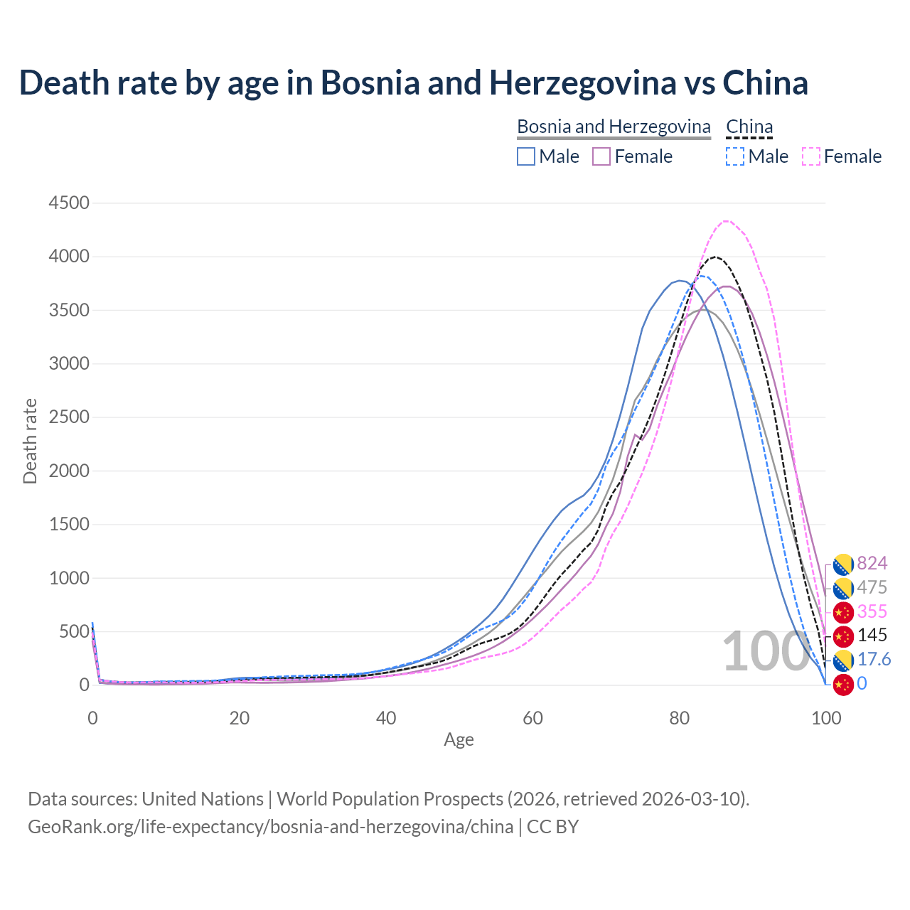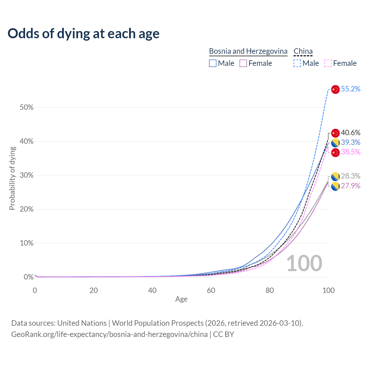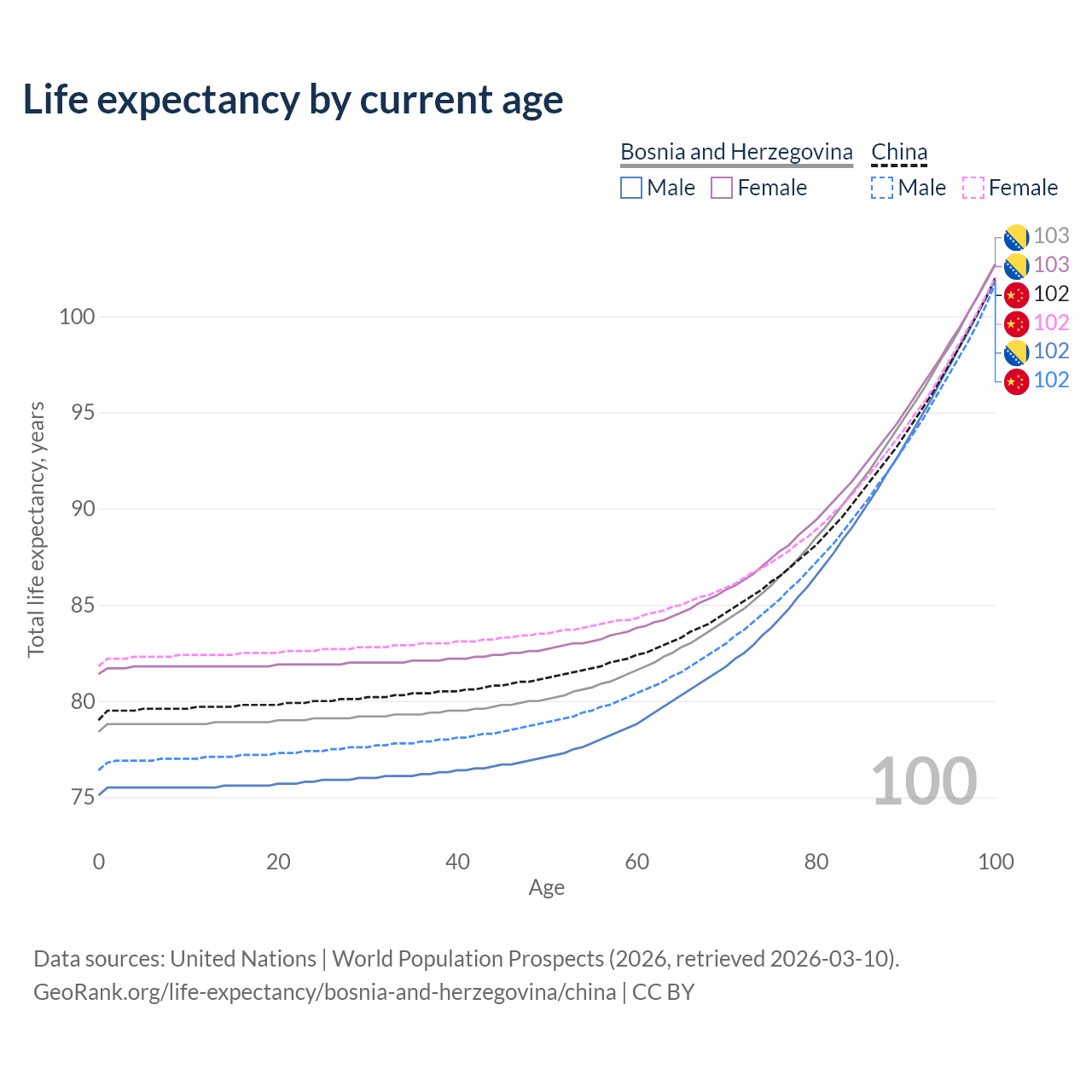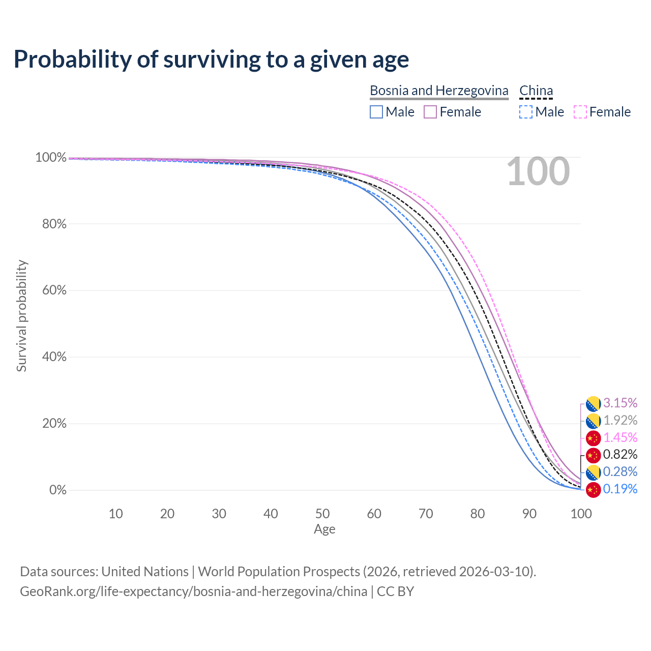 This life expectancy calculator shows the odds of living to 100, 95, 90, and below based on current age for both males and females in Bosnia and Herzegovina and China, along with mean and median age of death. The calculations are based on the 2026 life tables (actuarial tables) from the UN World Population Prospects.