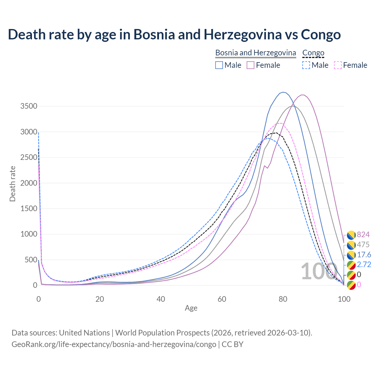 In Bosnia and Herzegovina, the most common age of death is 83, compared to 78 in the Congo. The median age of death is 80.7 in Bosnia and Herzegovina and 71.8 in the Congo, meaning only half of each cohort is expected to live past that age.