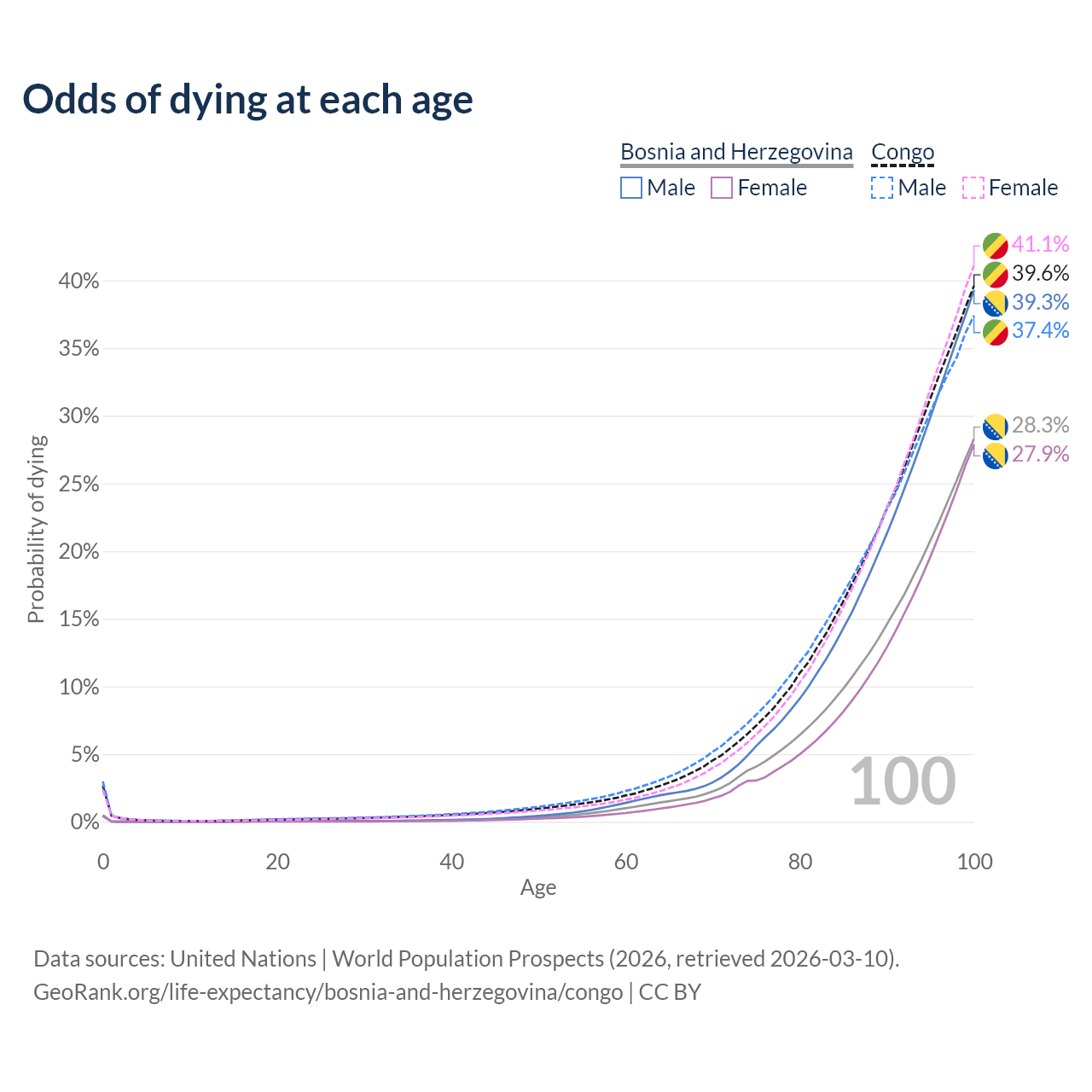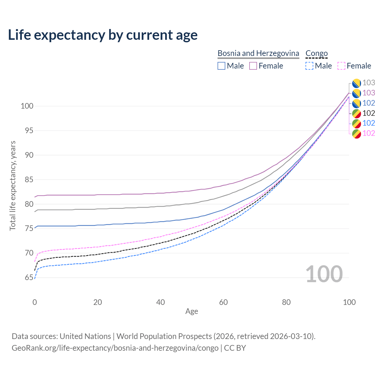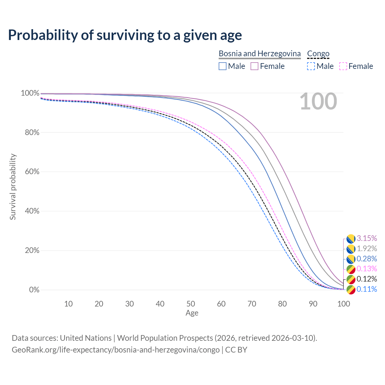 This life expectancy calculator shows the odds of living to 100, 95, 90, and below based on current age for both males and females in Bosnia and Herzegovina and the Congo, along with mean and median age of death. The calculations are based on the 2026 life tables (actuarial tables) from the UN World Population Prospects.