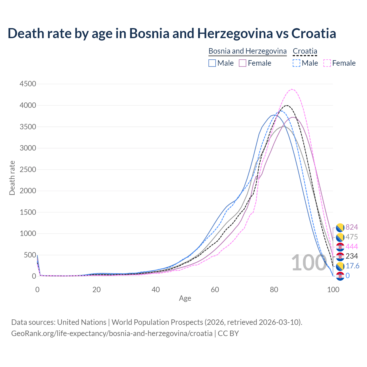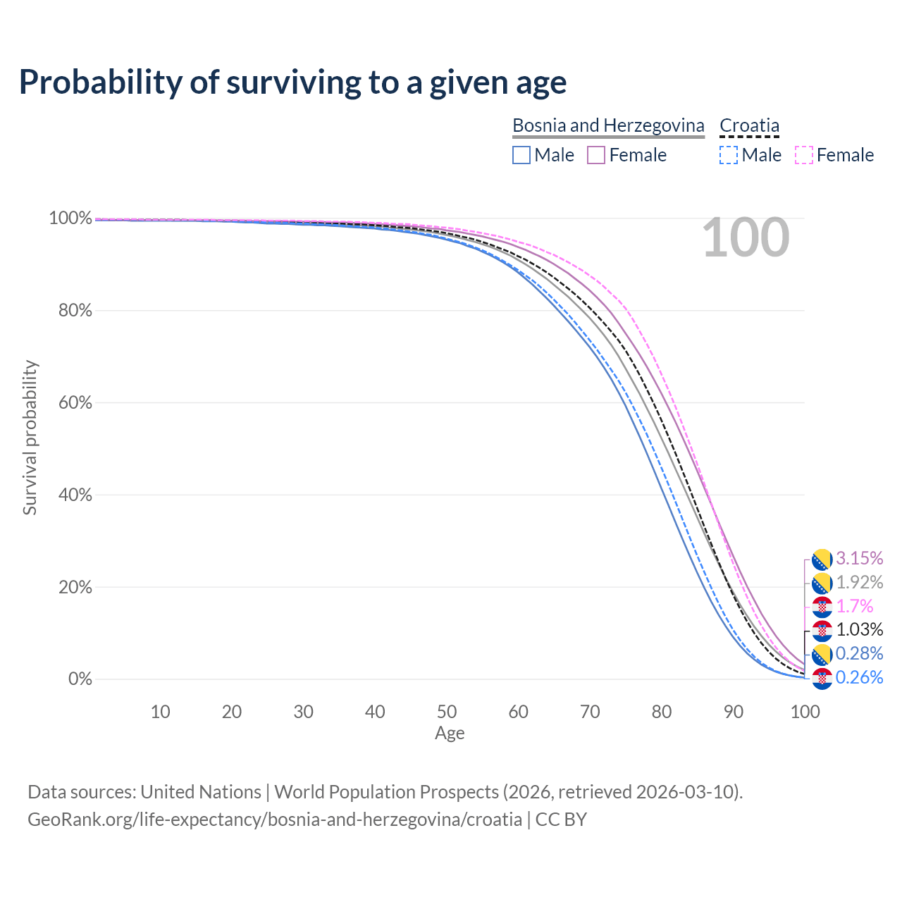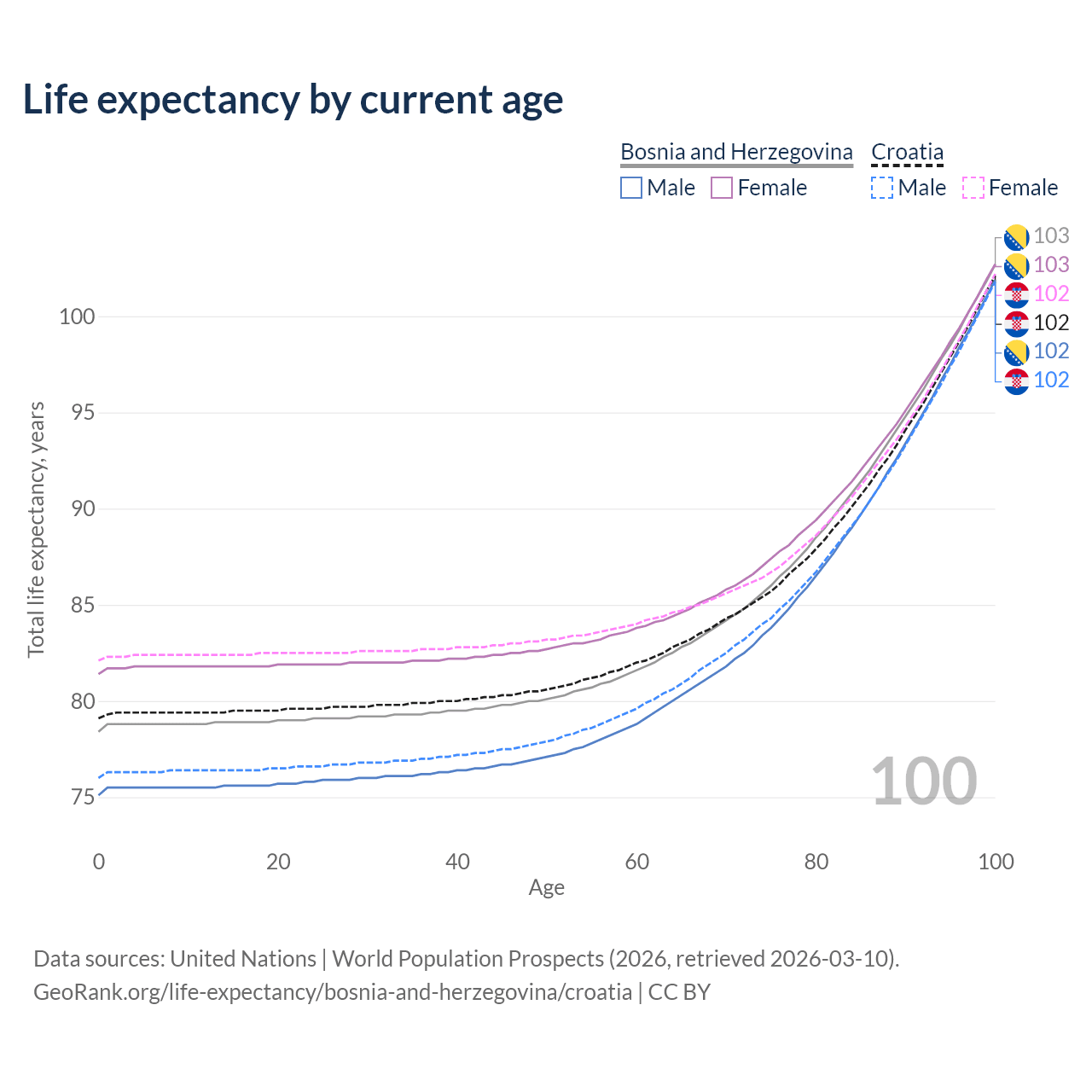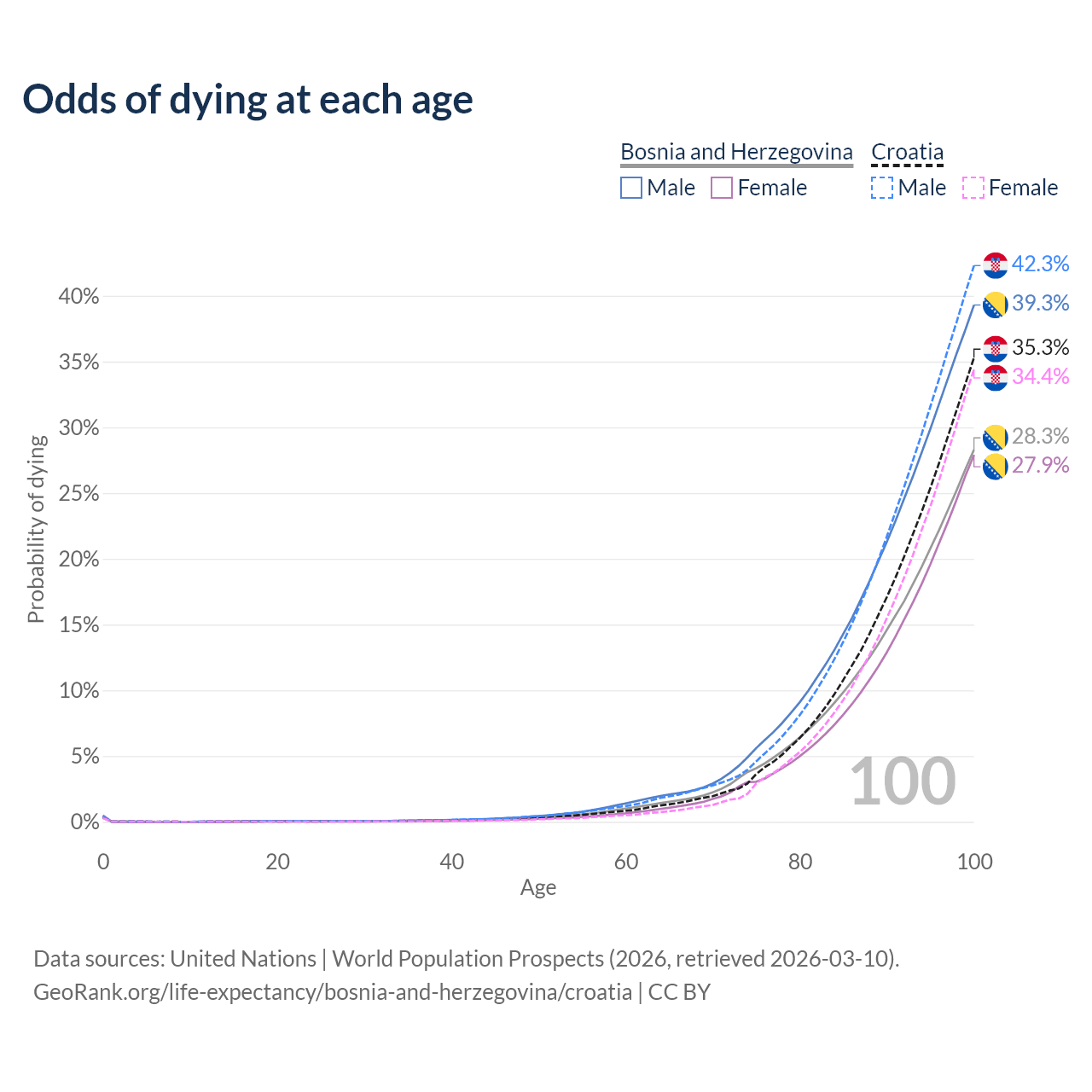 This life expectancy calculator shows the odds of living to 100, 95, 90, and below based on current age for both males and females in Bosnia and Herzegovina and Croatia, along with mean and median age of death. The calculations are based on the 2026 life tables (actuarial tables) from the UN World Population Prospects.