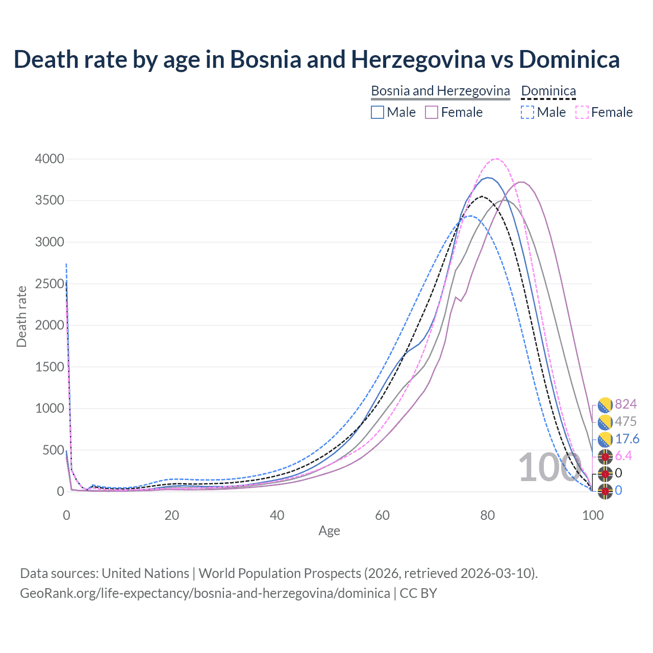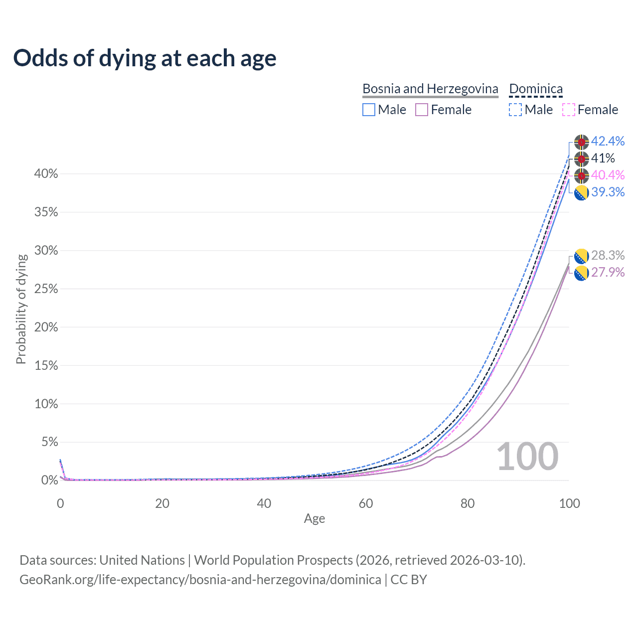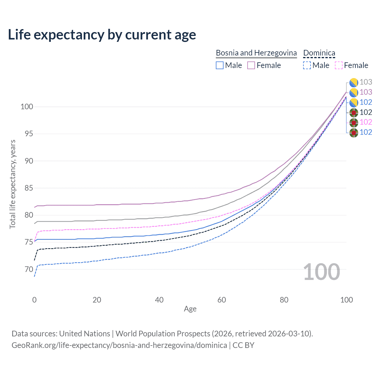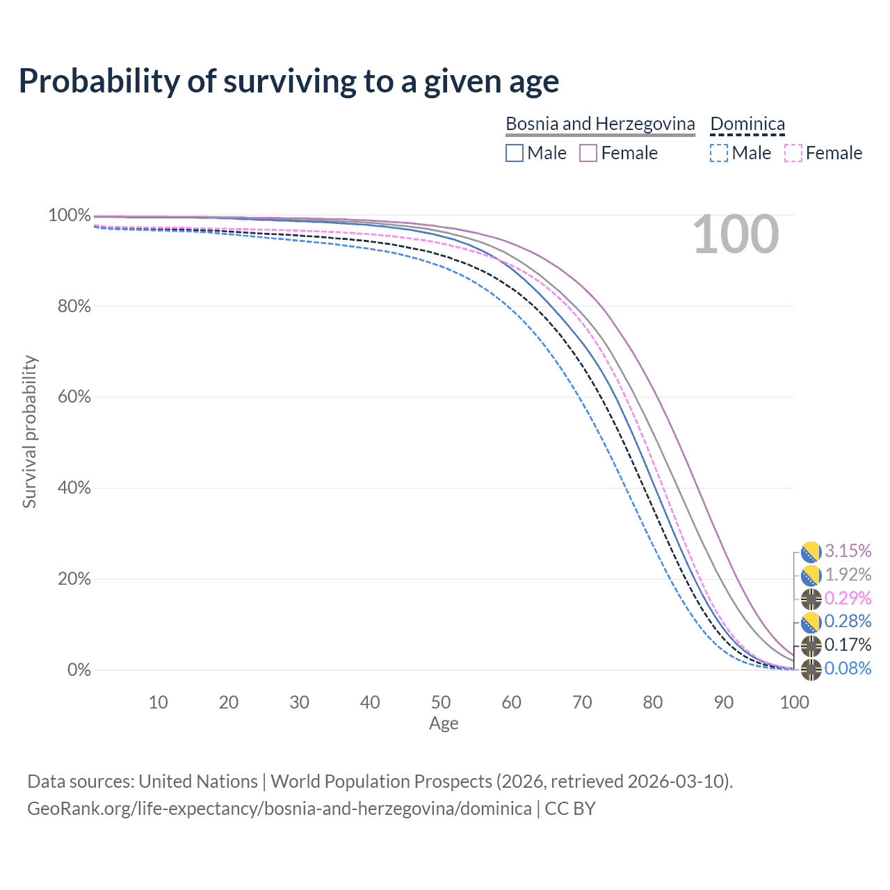 This life expectancy calculator shows the odds of living to 100, 95, 90, and below based on current age for both males and females in Bosnia and Herzegovina and Dominica, along with mean and median age of death. The calculations are based on the 2026 life tables (actuarial tables) from the UN World Population Prospects.