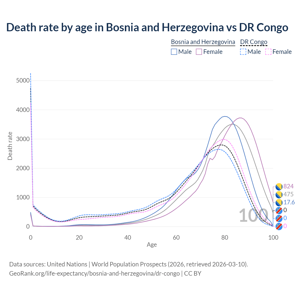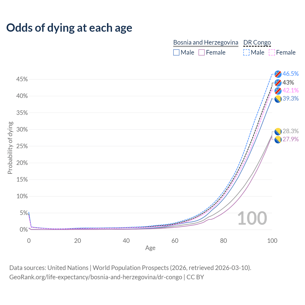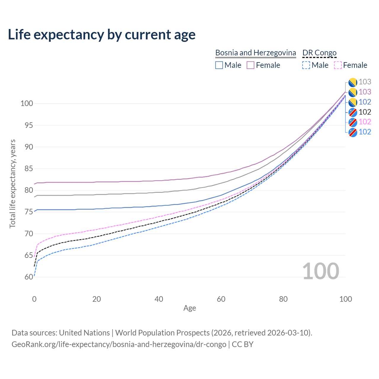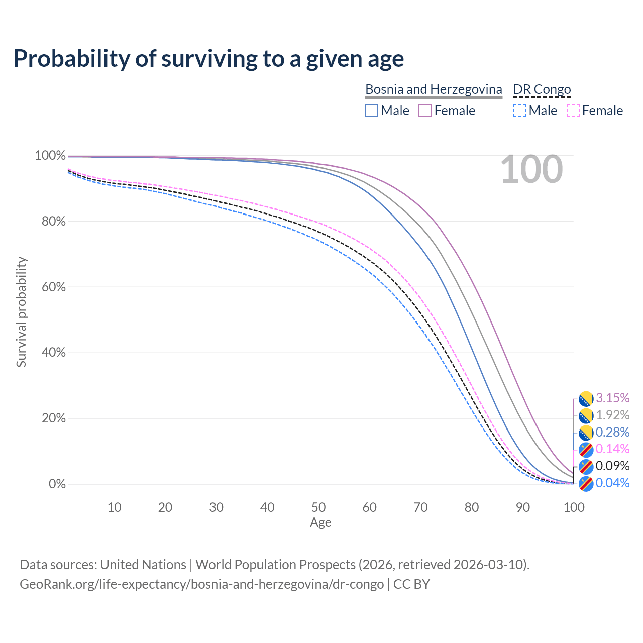 This life expectancy calculator shows the odds of living to 100, 95, 90, and below based on current age for both males and females in Bosnia and Herzegovina and the DR Congo, along with mean and median age of death. The calculations are based on the 2026 life tables (actuarial tables) from the UN World Population Prospects.
