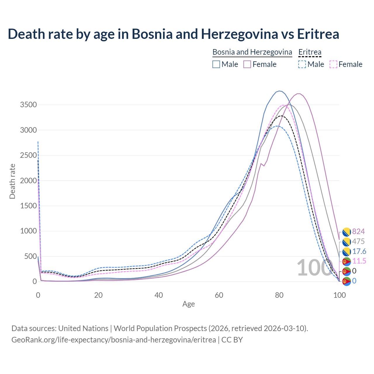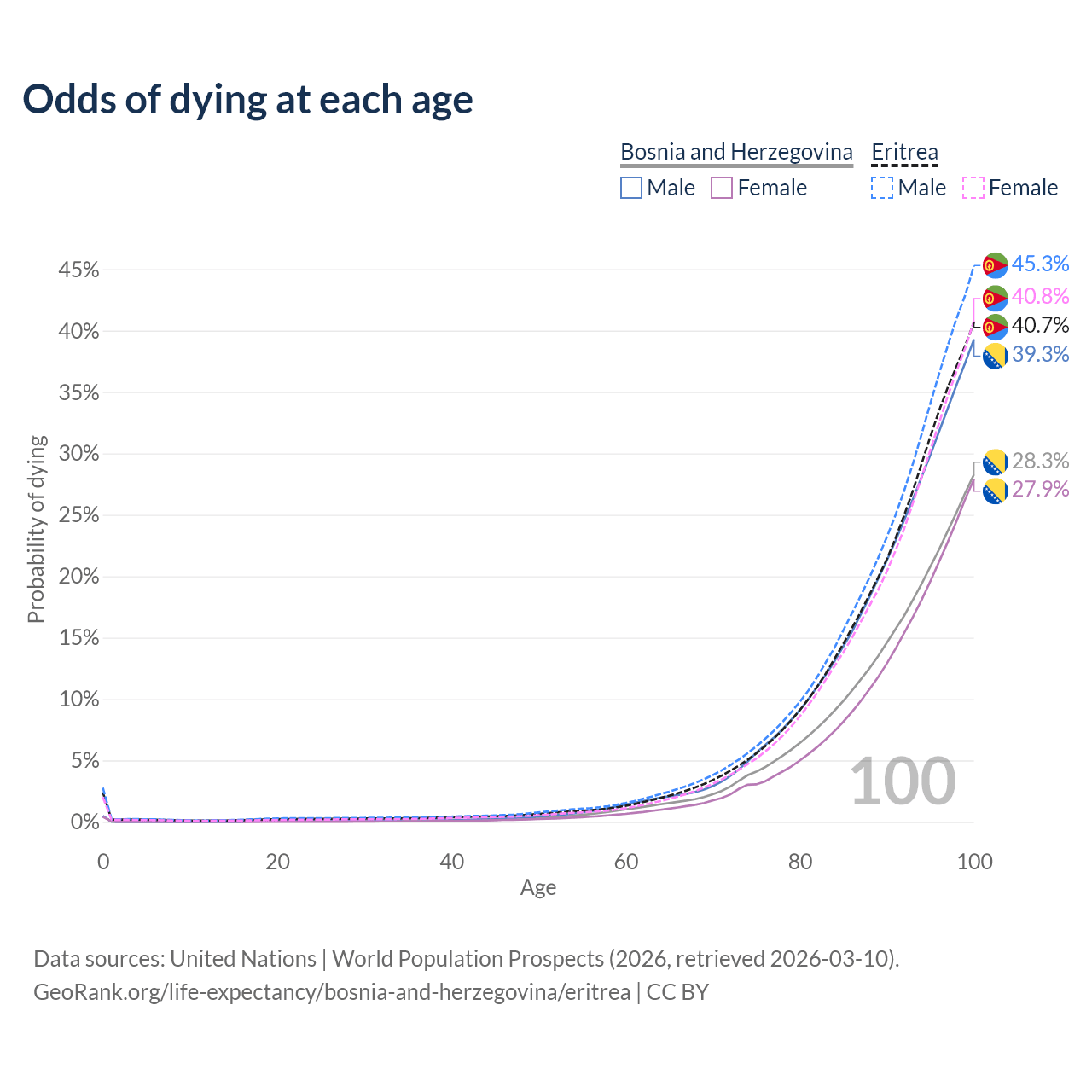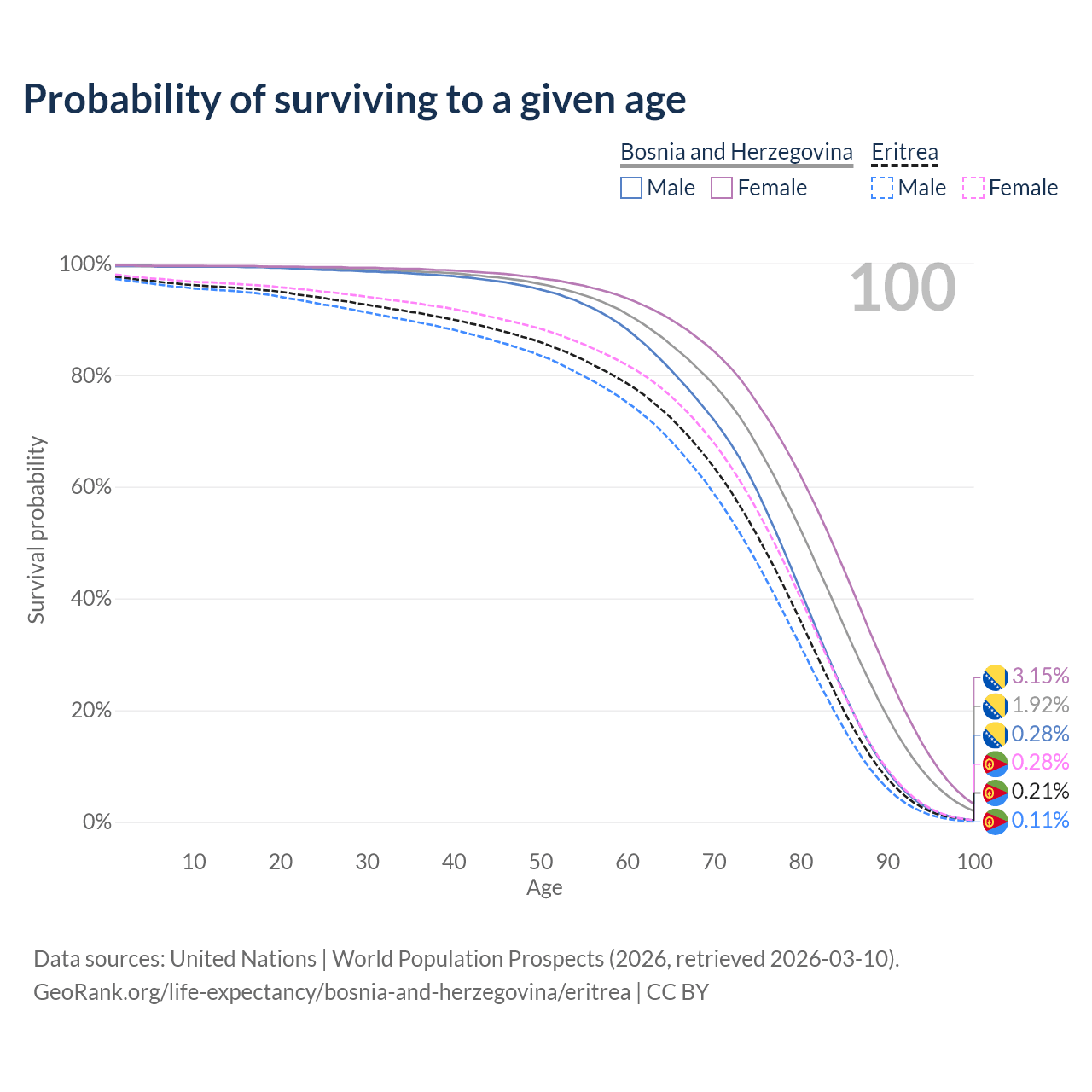 This life expectancy calculator shows the odds of living to 100, 95, 90, and below based on current age for both males and females in Bosnia and Herzegovina and Eritrea, along with mean and median age of death. The calculations are based on the 2026 life tables (actuarial tables) from the UN World Population Prospects.