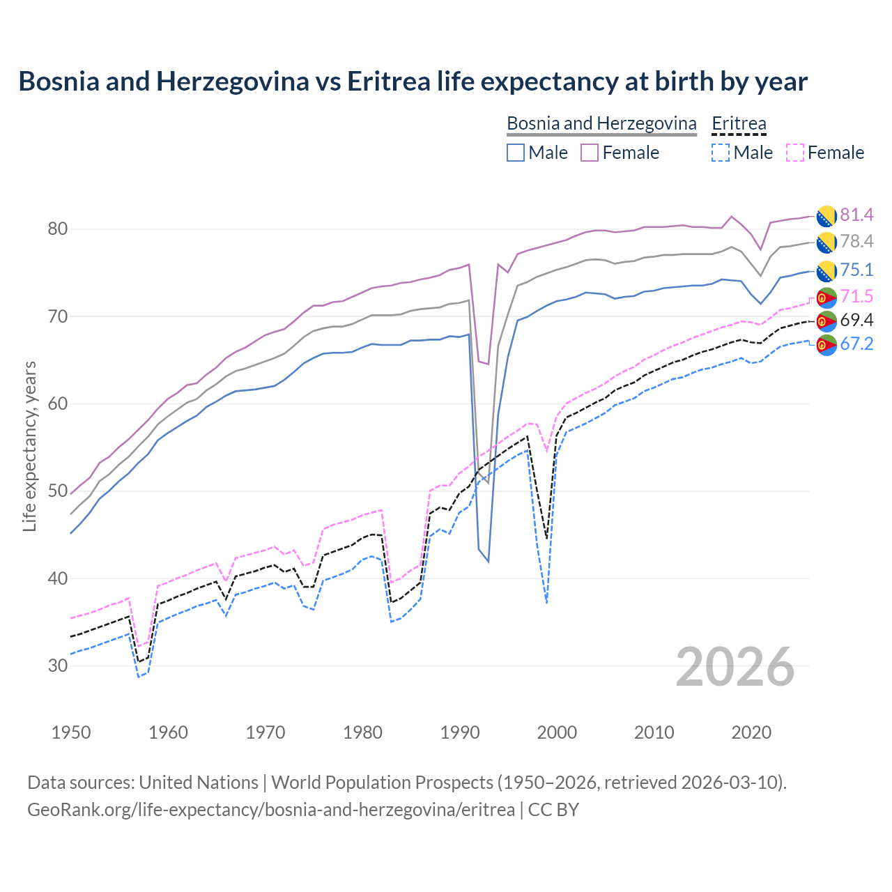 The average life expectancy at birth is 78.4 years in Bosnia and Herzegovina vs 69.4 in Eritrea. Bosnia and Herzegovina is ranked 56/197 by life expectancy, and Eritrea is 142/197. In Bosnia and Herzegovina, the life expectancy is 75.1 years for males and 81.4 years for females. In Eritrea, it's 67.2 years for males and 71.5 years for females.