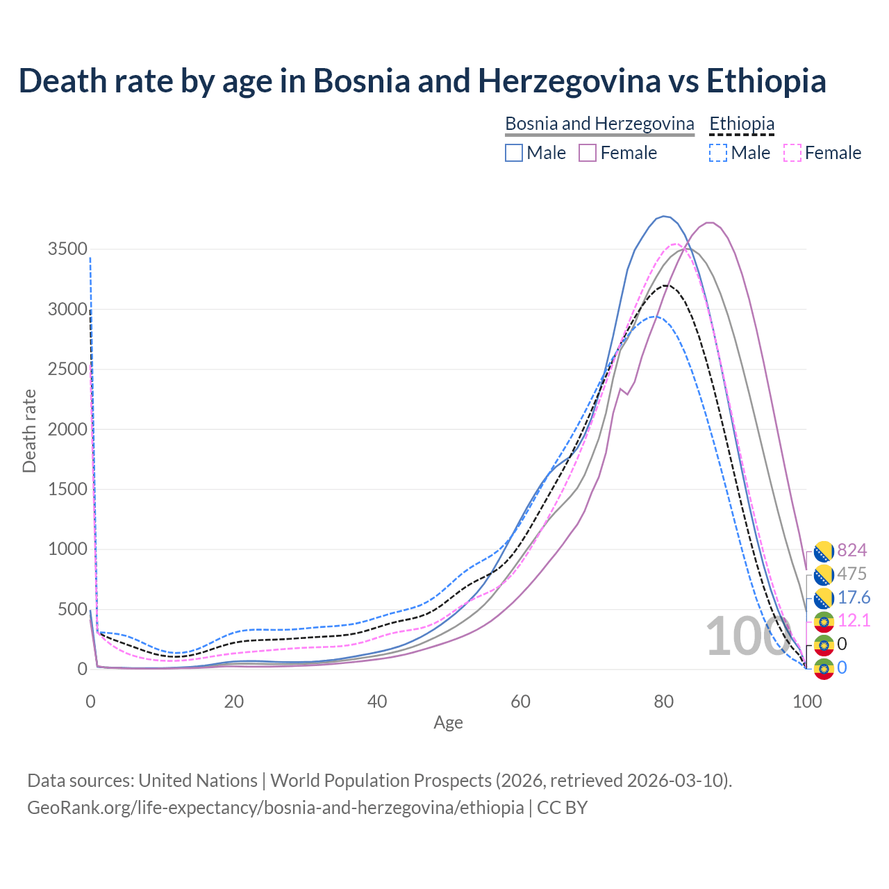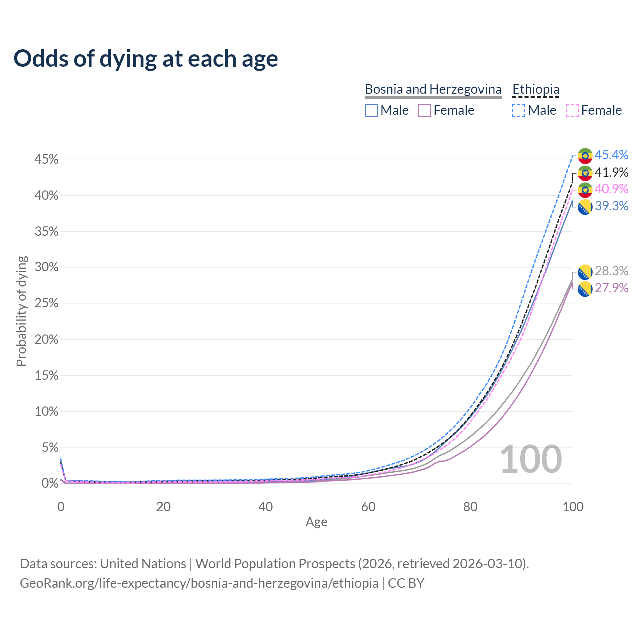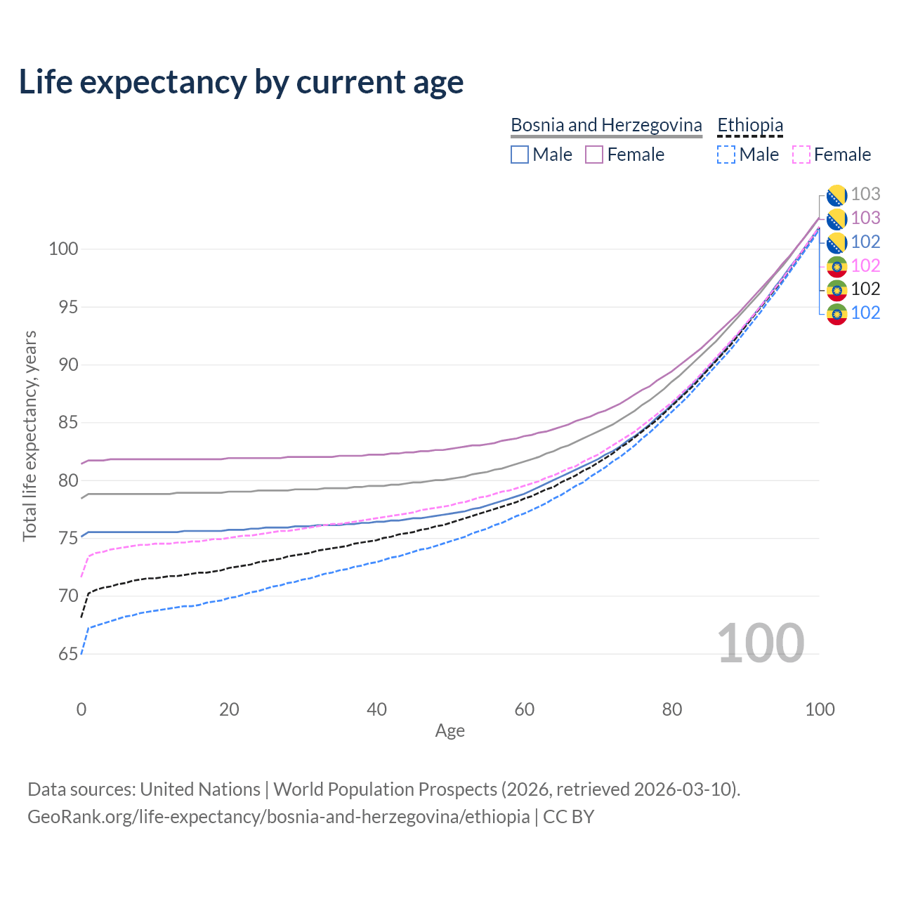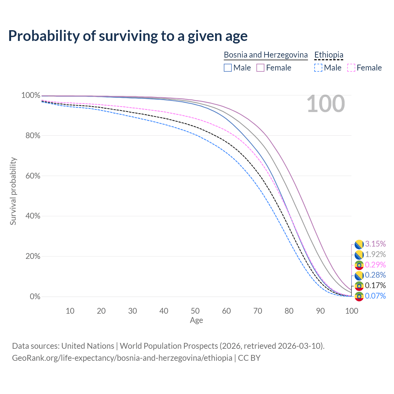 This life expectancy calculator shows the odds of living to 100, 95, 90, and below based on current age for both males and females in Bosnia and Herzegovina and Ethiopia, along with mean and median age of death. The calculations are based on the 2026 life tables (actuarial tables) from the UN World Population Prospects.