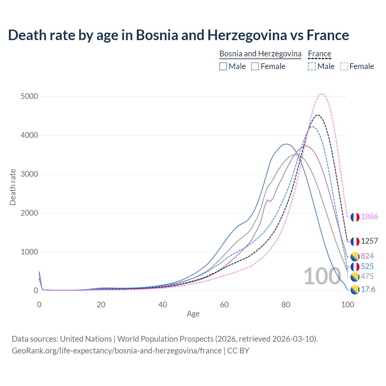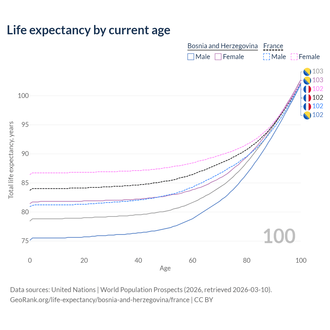 This life expectancy calculator shows the odds of living to 100, 95, 90, and below based on current age for both males and females in Bosnia and Herzegovina and France, along with mean and median age of death. The calculations are based on the 2026 life tables (actuarial tables) from the UN World Population Prospects.