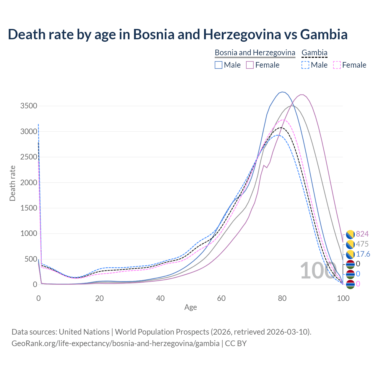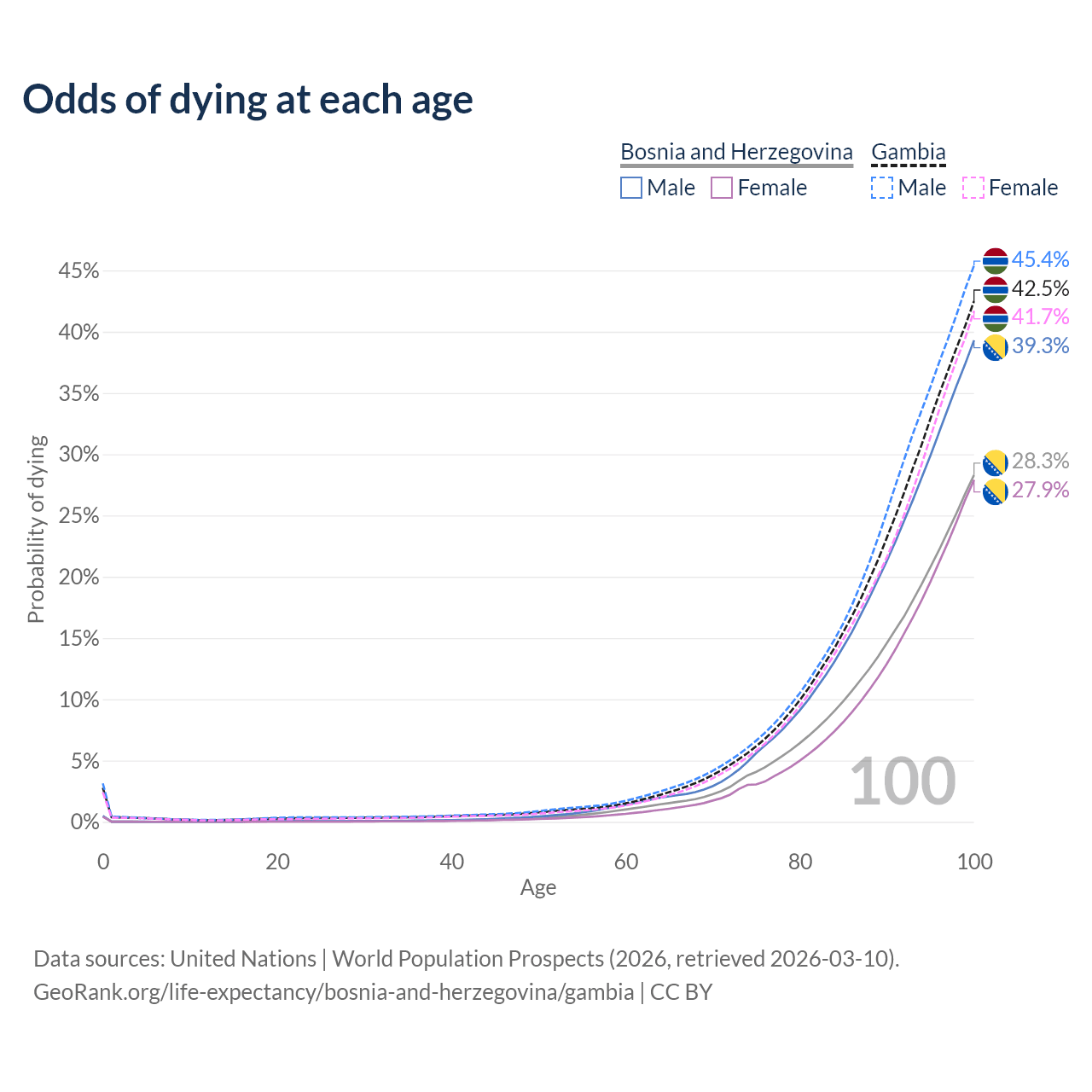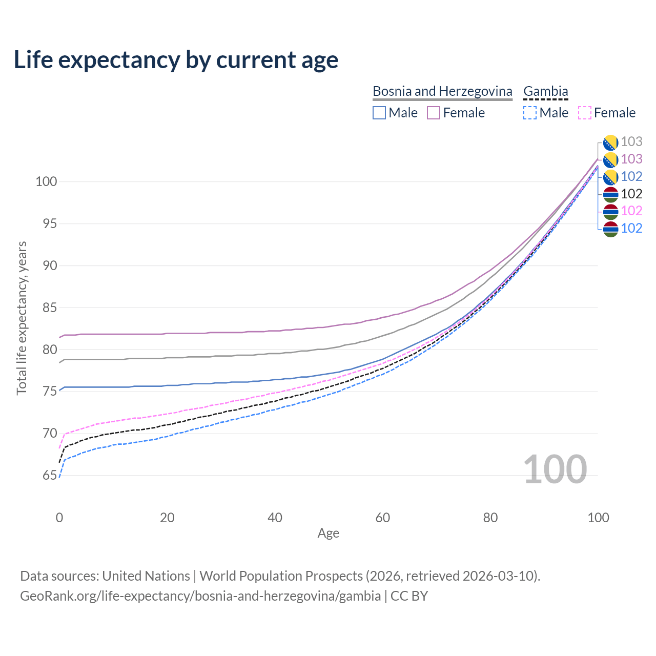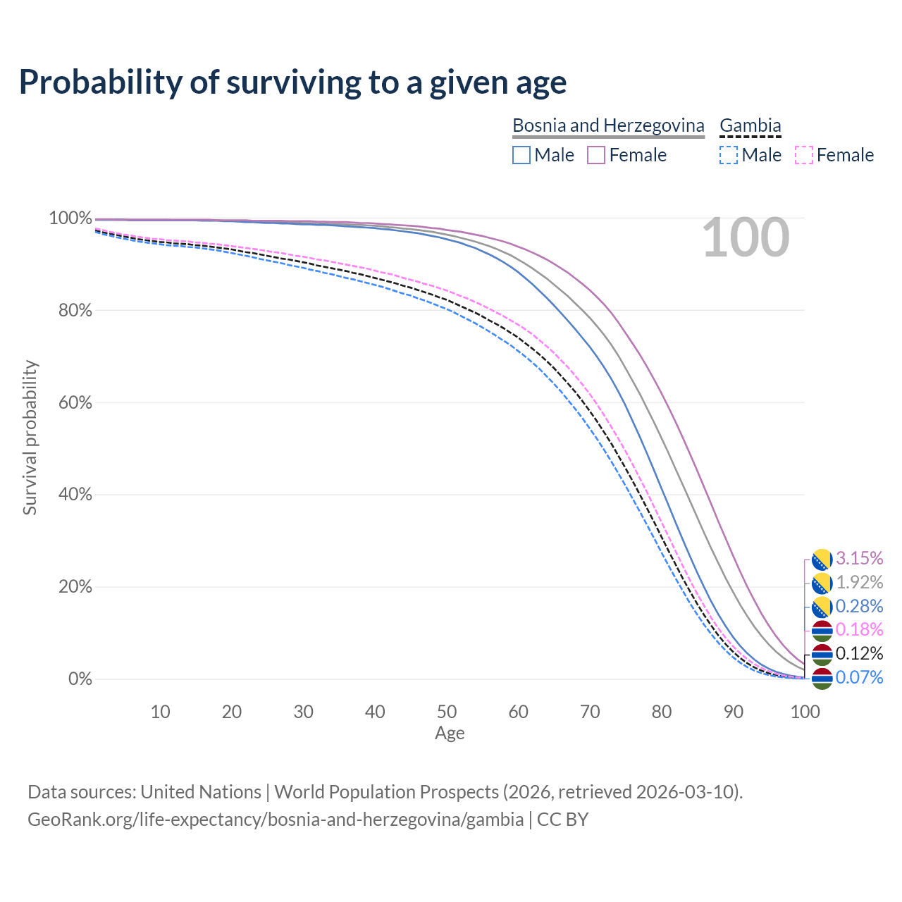 This life expectancy calculator shows the odds of living to 100, 95, 90, and below based on current age for both males and females in Bosnia and Herzegovina and the Gambia, along with mean and median age of death. The calculations are based on the 2026 life tables (actuarial tables) from the UN World Population Prospects.