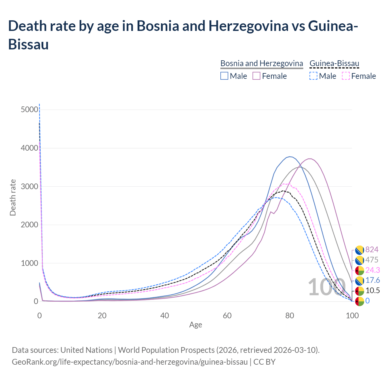 In Bosnia and Herzegovina, the most common age of death is 83, compared to 0 in Guinea-Bissau. The median age of death is 80.7 in Bosnia and Herzegovina and 71.8 in Guinea-Bissau, meaning only half of each cohort is expected to live past that age.