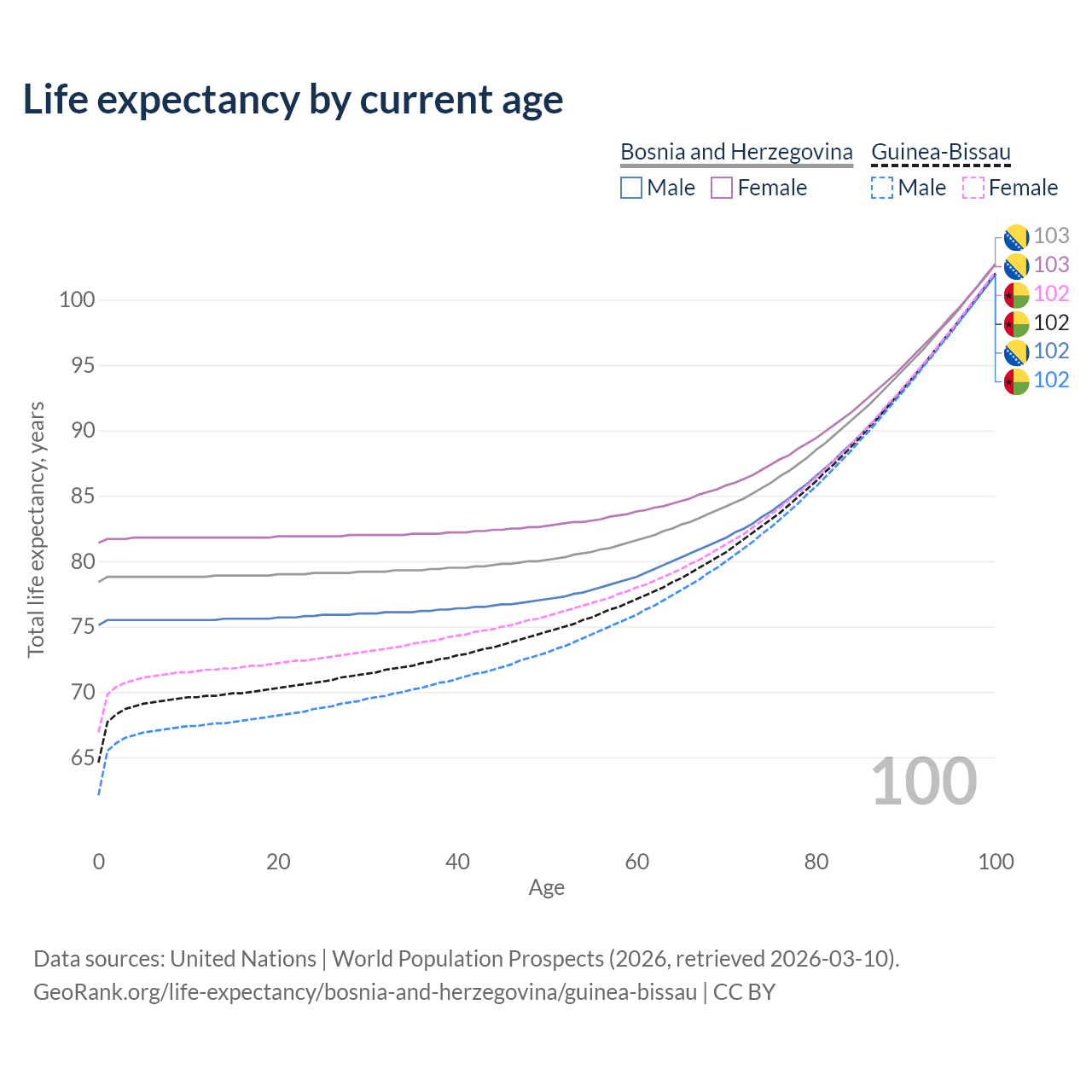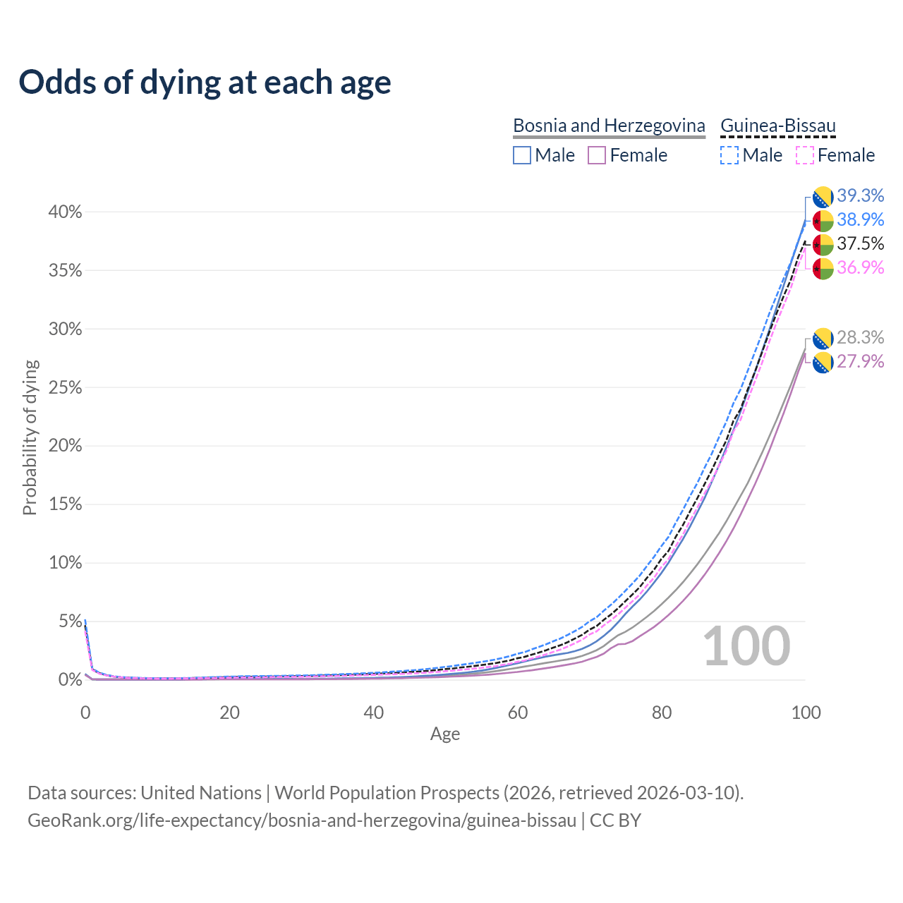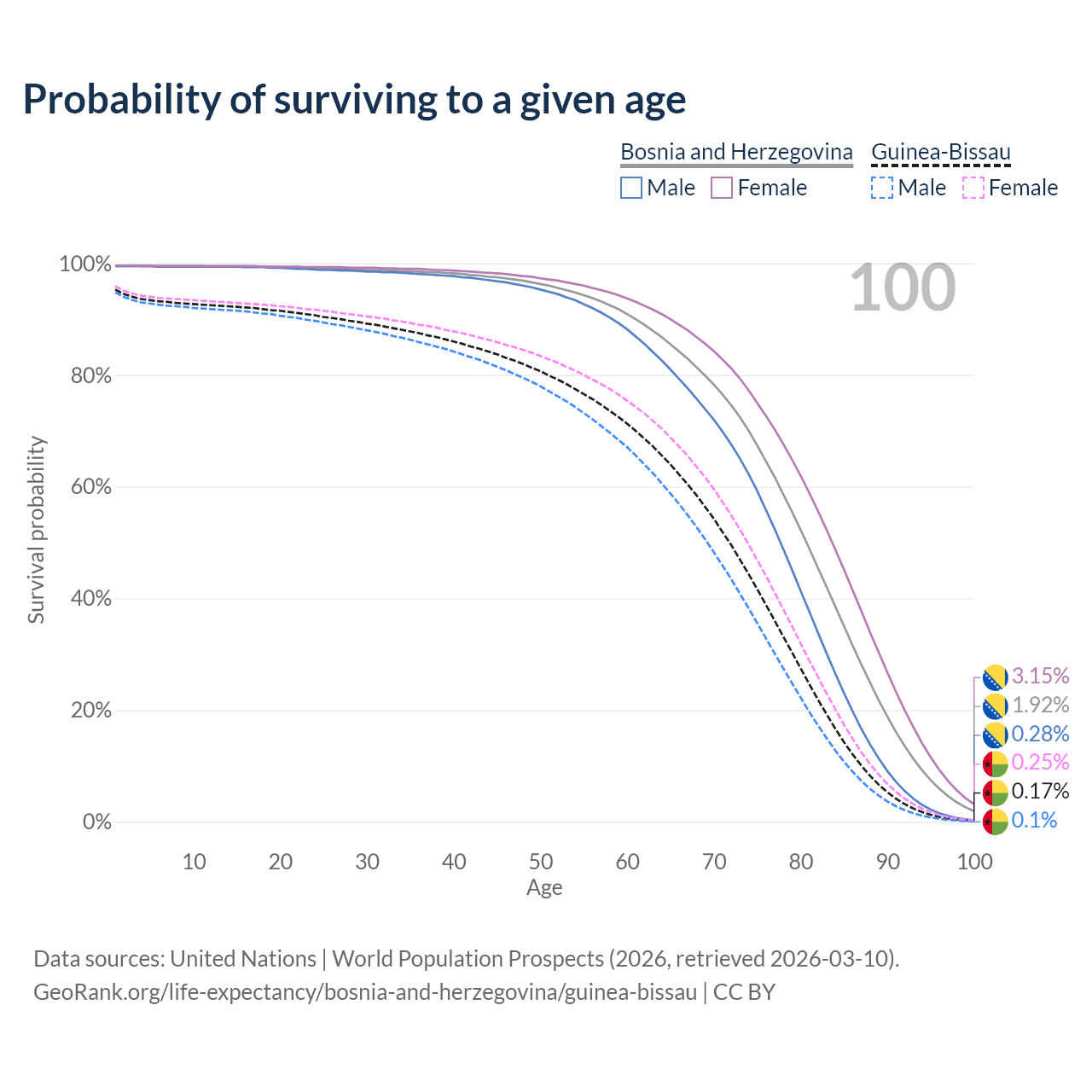 This life expectancy calculator shows the odds of living to 100, 95, 90, and below based on current age for both males and females in Bosnia and Herzegovina and Guinea-Bissau, along with mean and median age of death. The calculations are based on the 2026 life tables (actuarial tables) from the UN World Population Prospects.