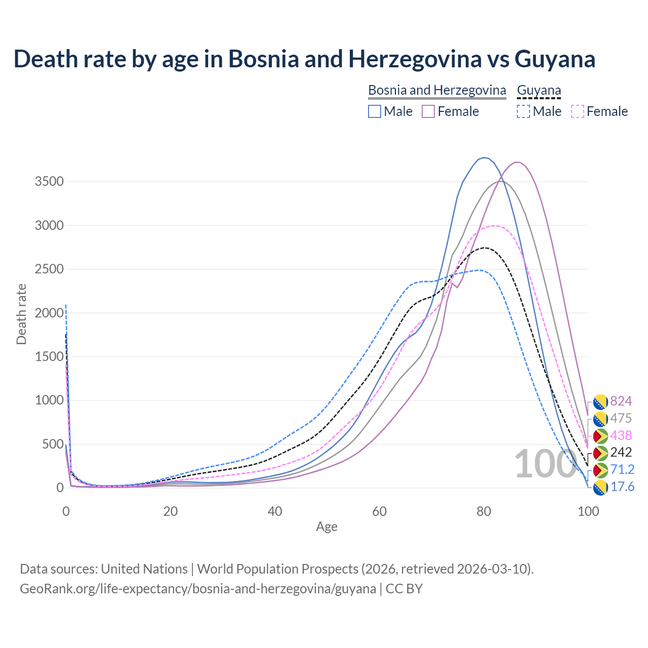 In Bosnia and Herzegovina, the most common age of death is 83, compared to 80 in Guyana. The median age of death is 80.7 in Bosnia and Herzegovina and 74.1 in Guyana, meaning only half of each cohort is expected to live past that age.