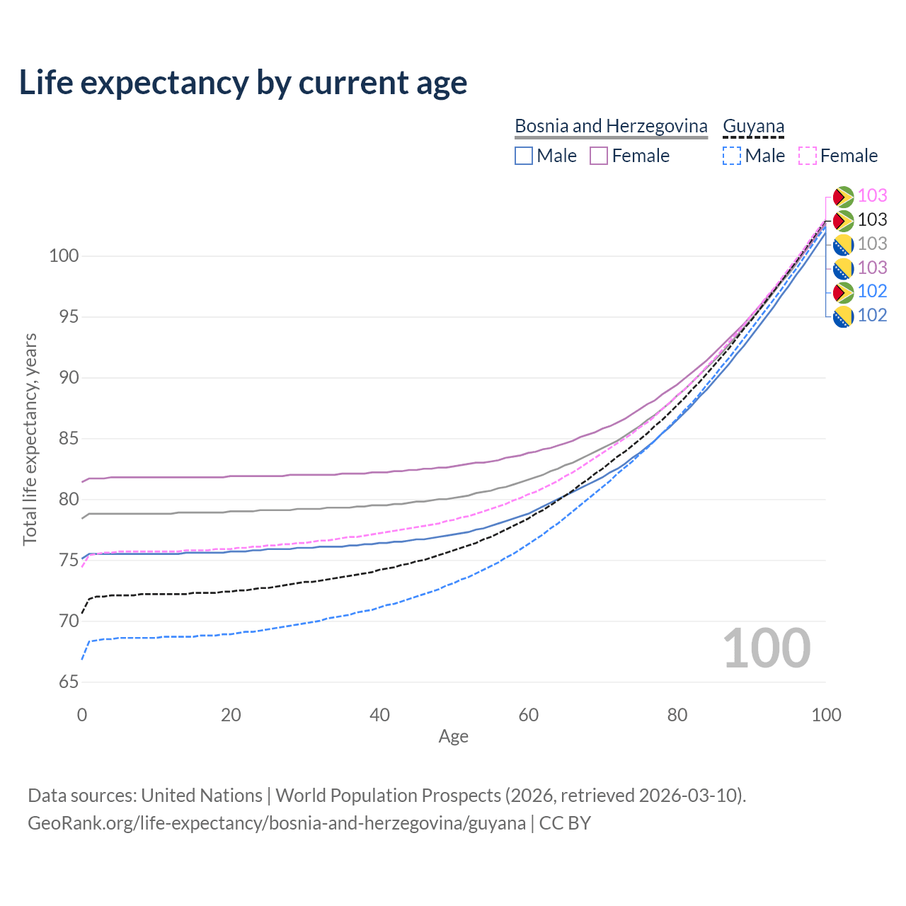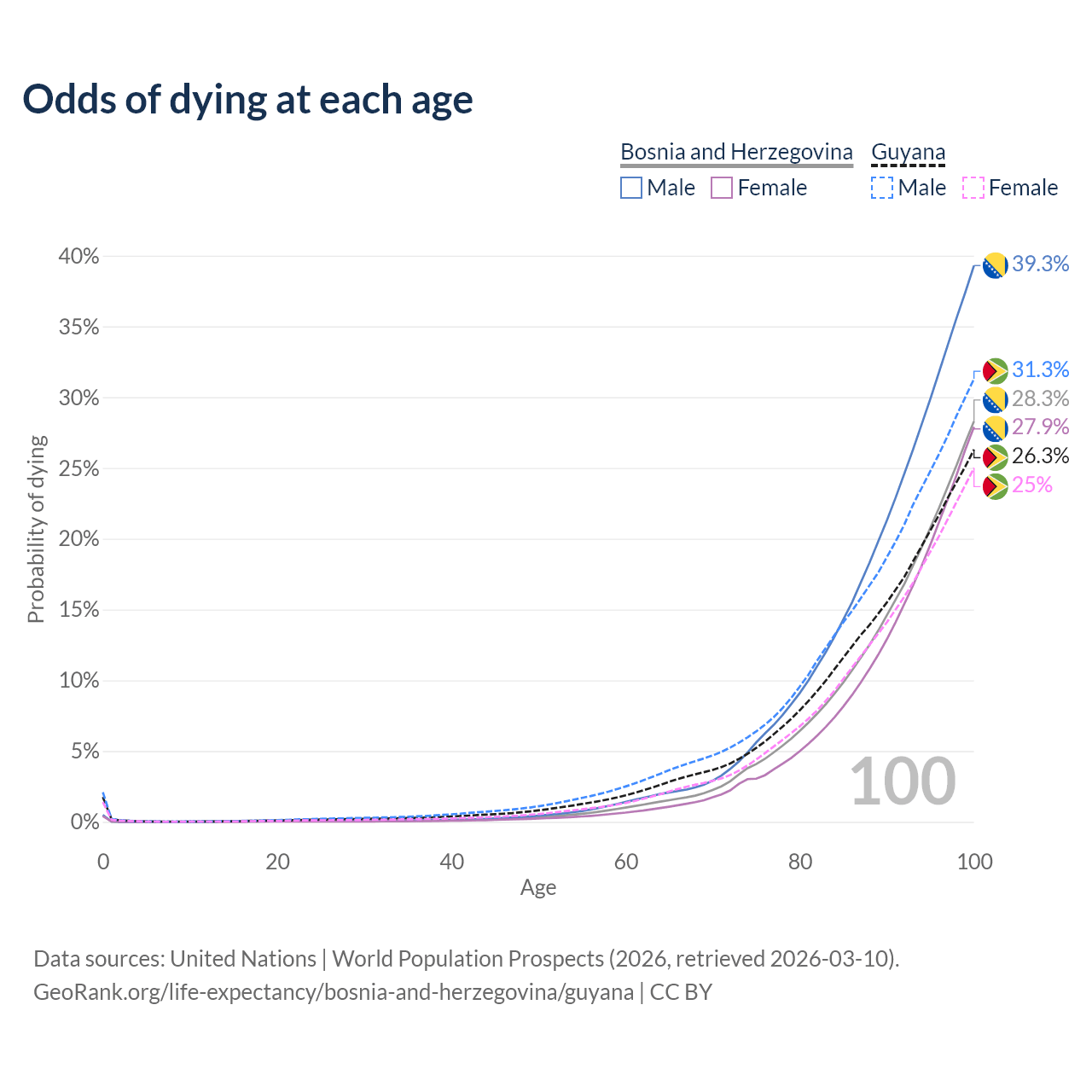This life expectancy calculator shows the odds of living to 100, 95, 90, and below based on current age for both males and females in Bosnia and Herzegovina and Guyana, along with mean and median age of death. The calculations are based on the 2026 life tables (actuarial tables) from the UN World Population Prospects.