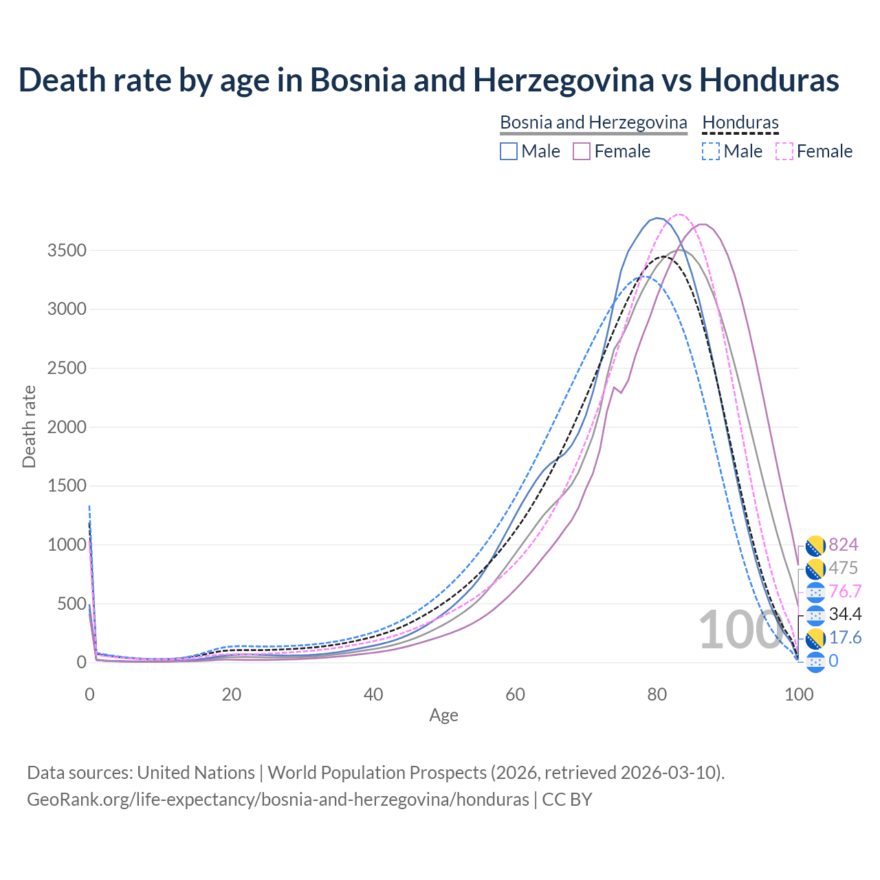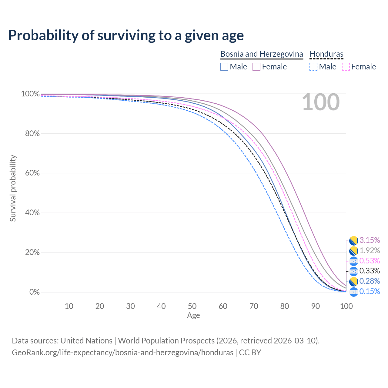This life expectancy calculator shows the odds of living to 100, 95, 90, and below based on current age for both males and females in Bosnia and Herzegovina and Honduras, along with mean and median age of death. The calculations are based on the 2026 life tables (actuarial tables) from the UN World Population Prospects.