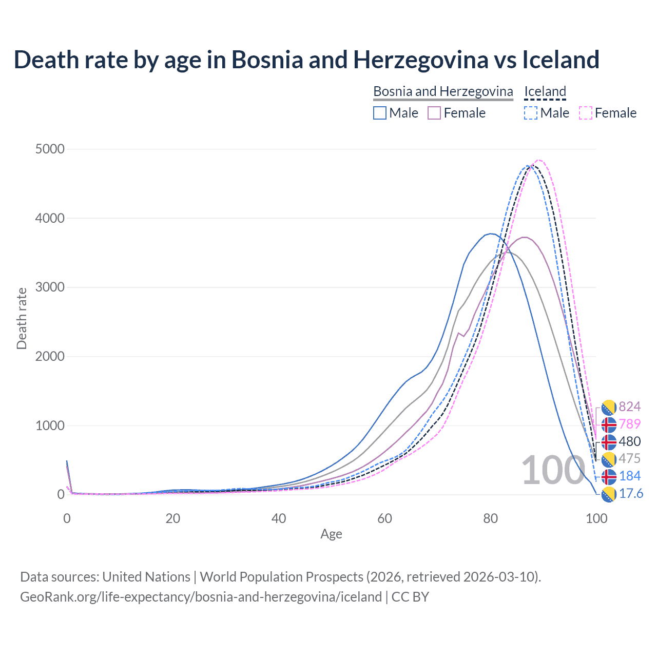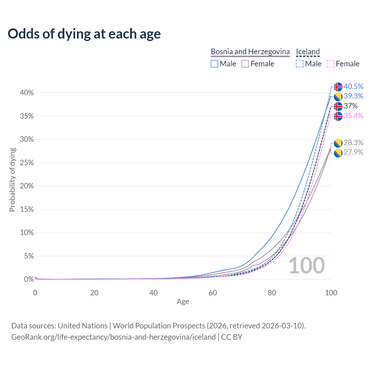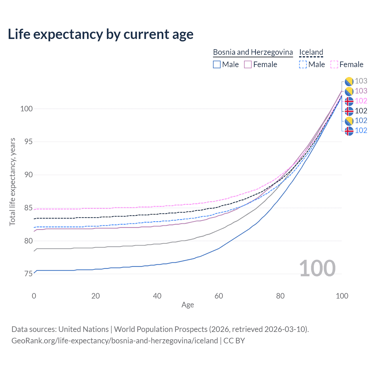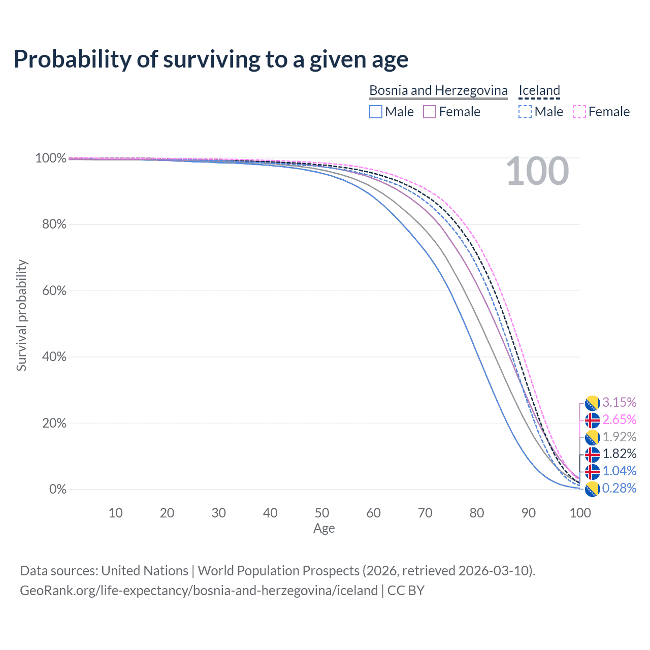 This life expectancy calculator shows the odds of living to 100, 95, 90, and below based on current age for both males and females in Bosnia and Herzegovina and Iceland, along with mean and median age of death. The calculations are based on the 2026 life tables (actuarial tables) from the UN World Population Prospects.