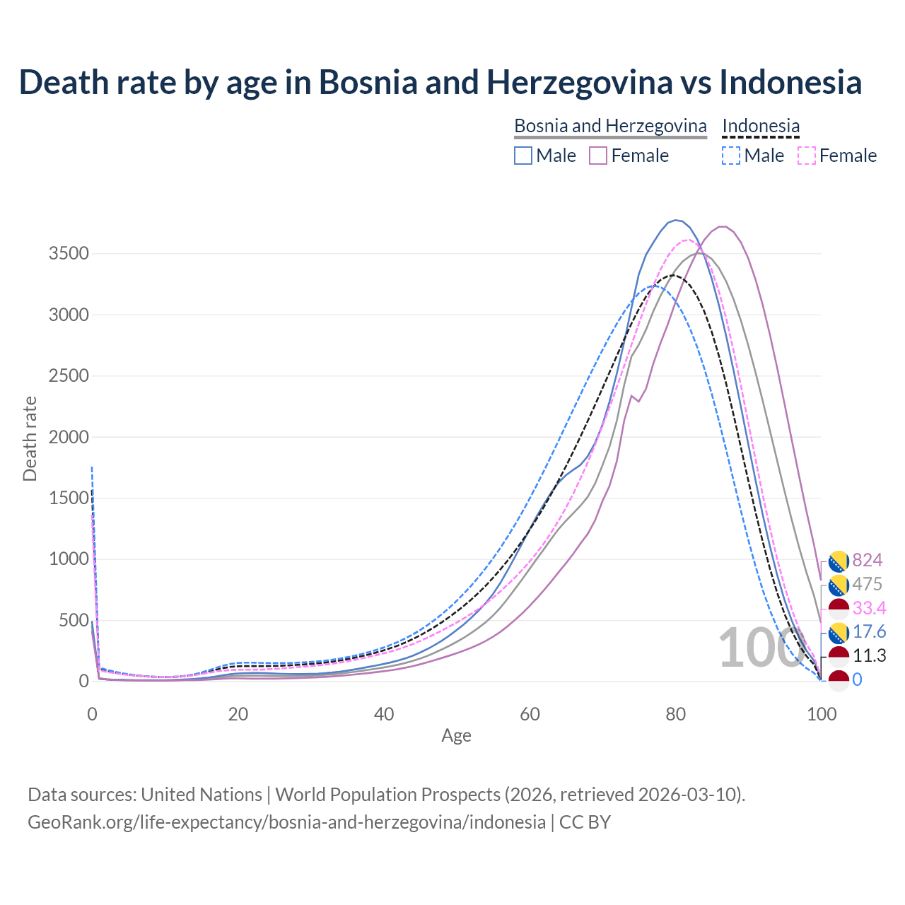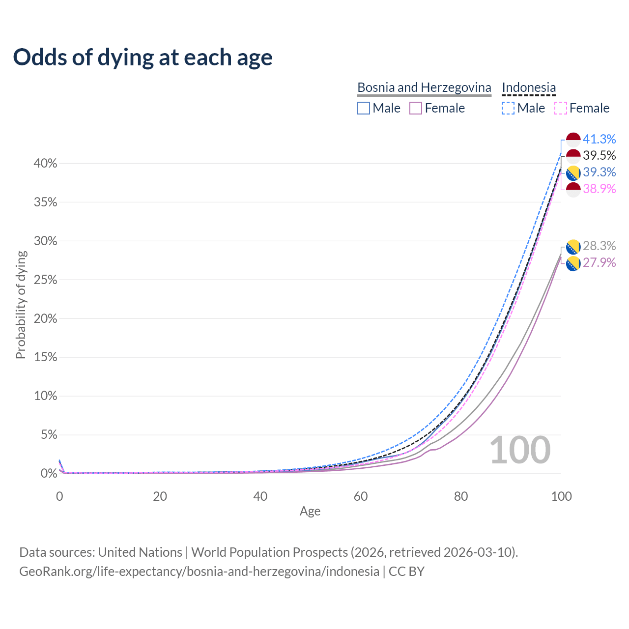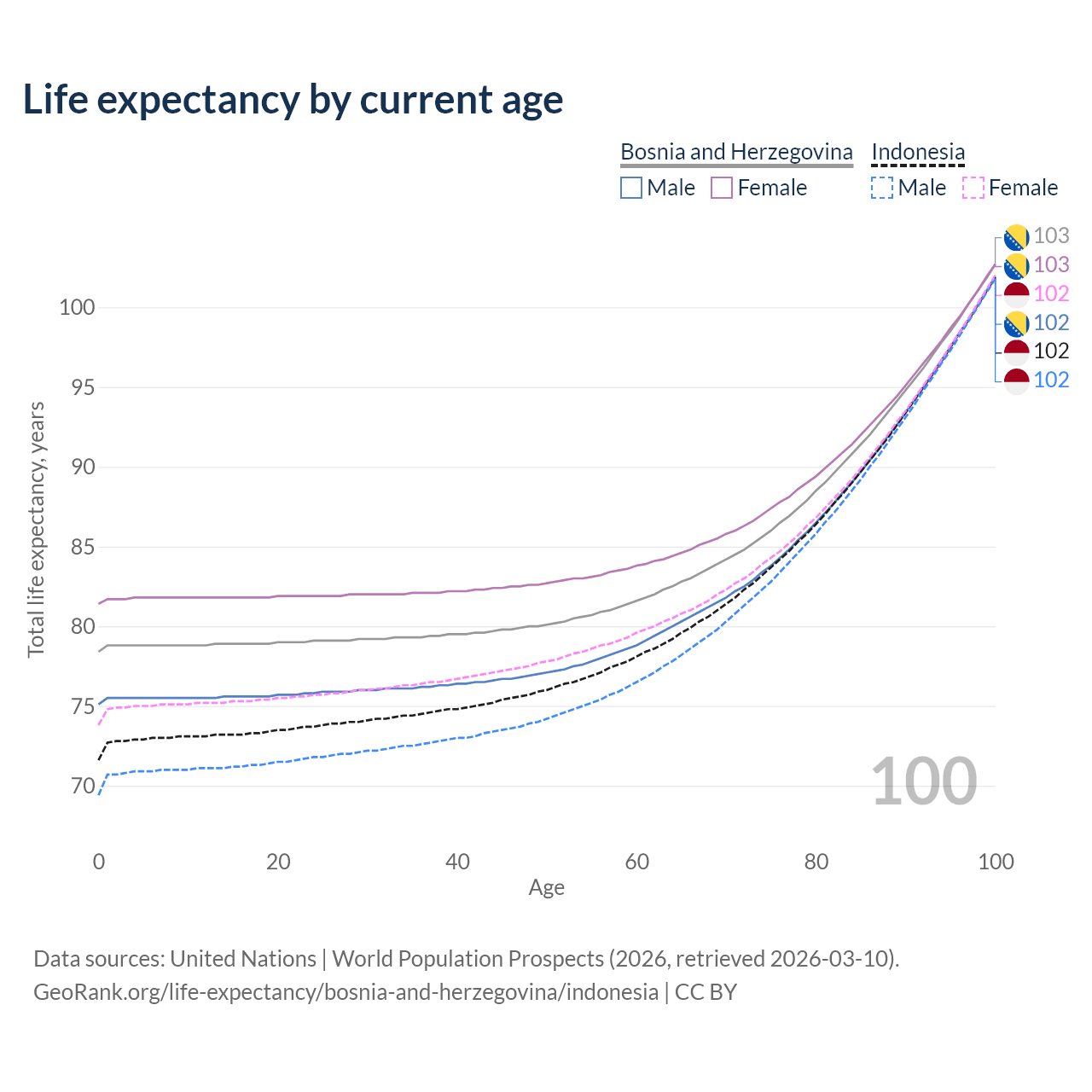 This life expectancy calculator shows the odds of living to 100, 95, 90, and below based on current age for both males and females in Bosnia and Herzegovina and Indonesia, along with mean and median age of death. The calculations are based on the 2026 life tables (actuarial tables) from the UN World Population Prospects.