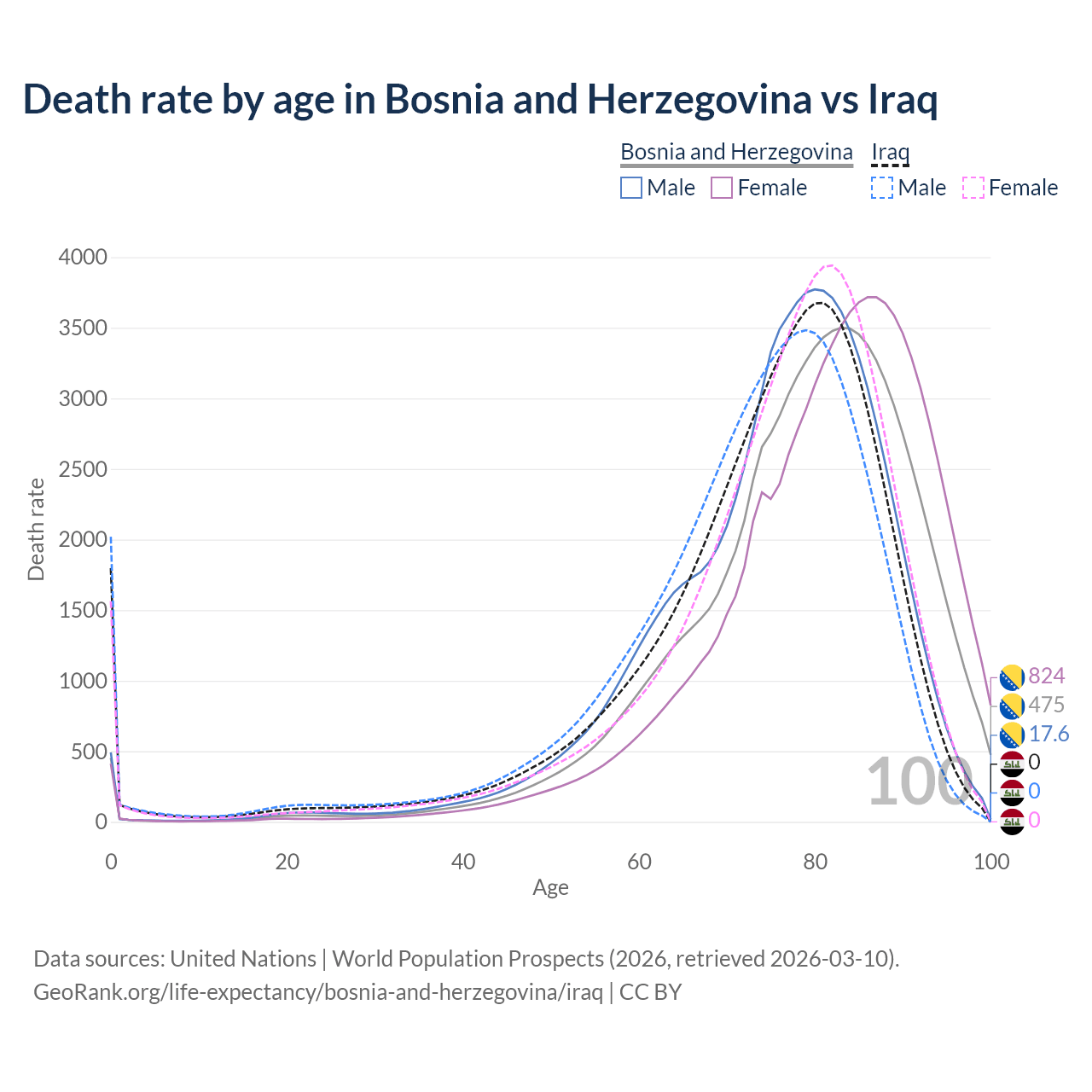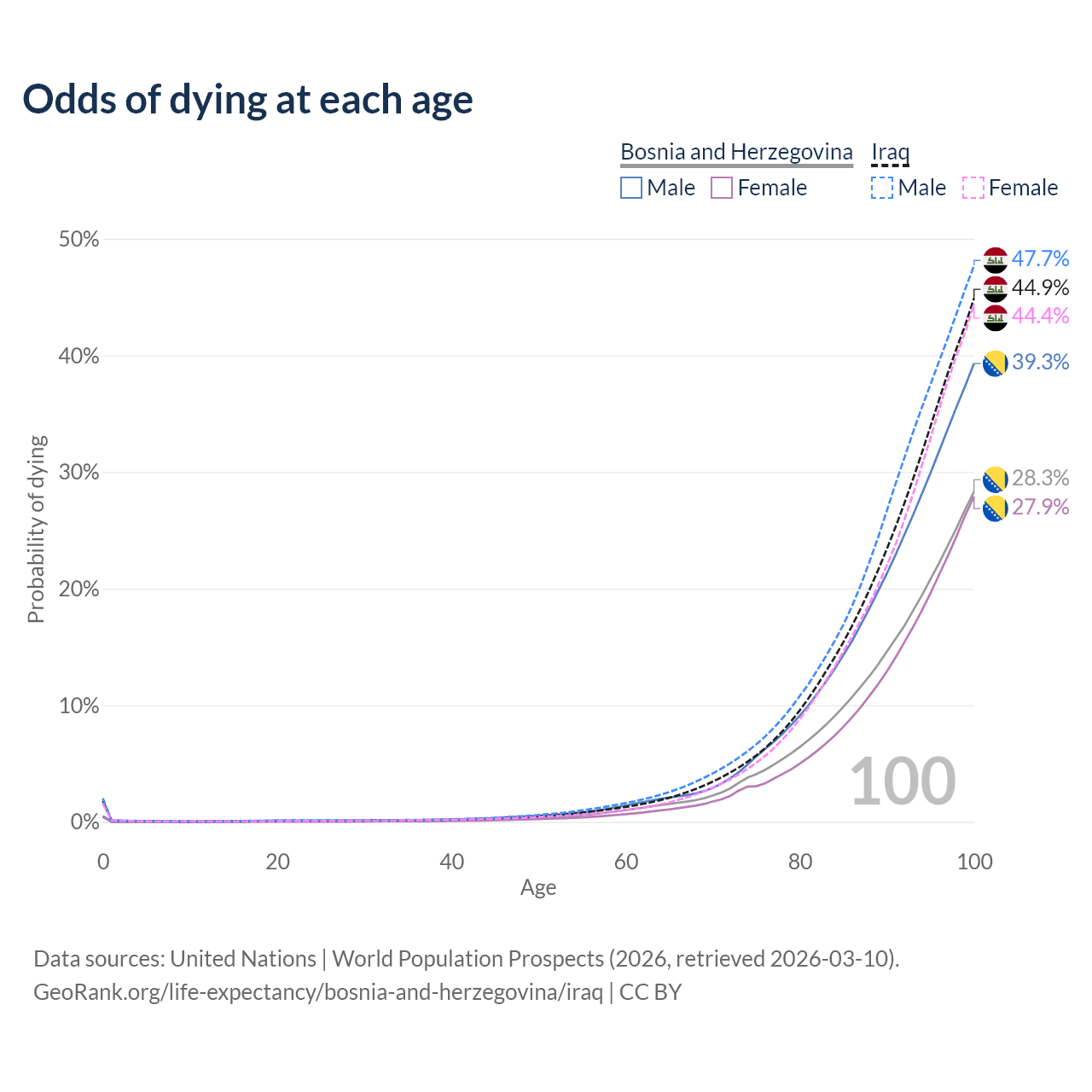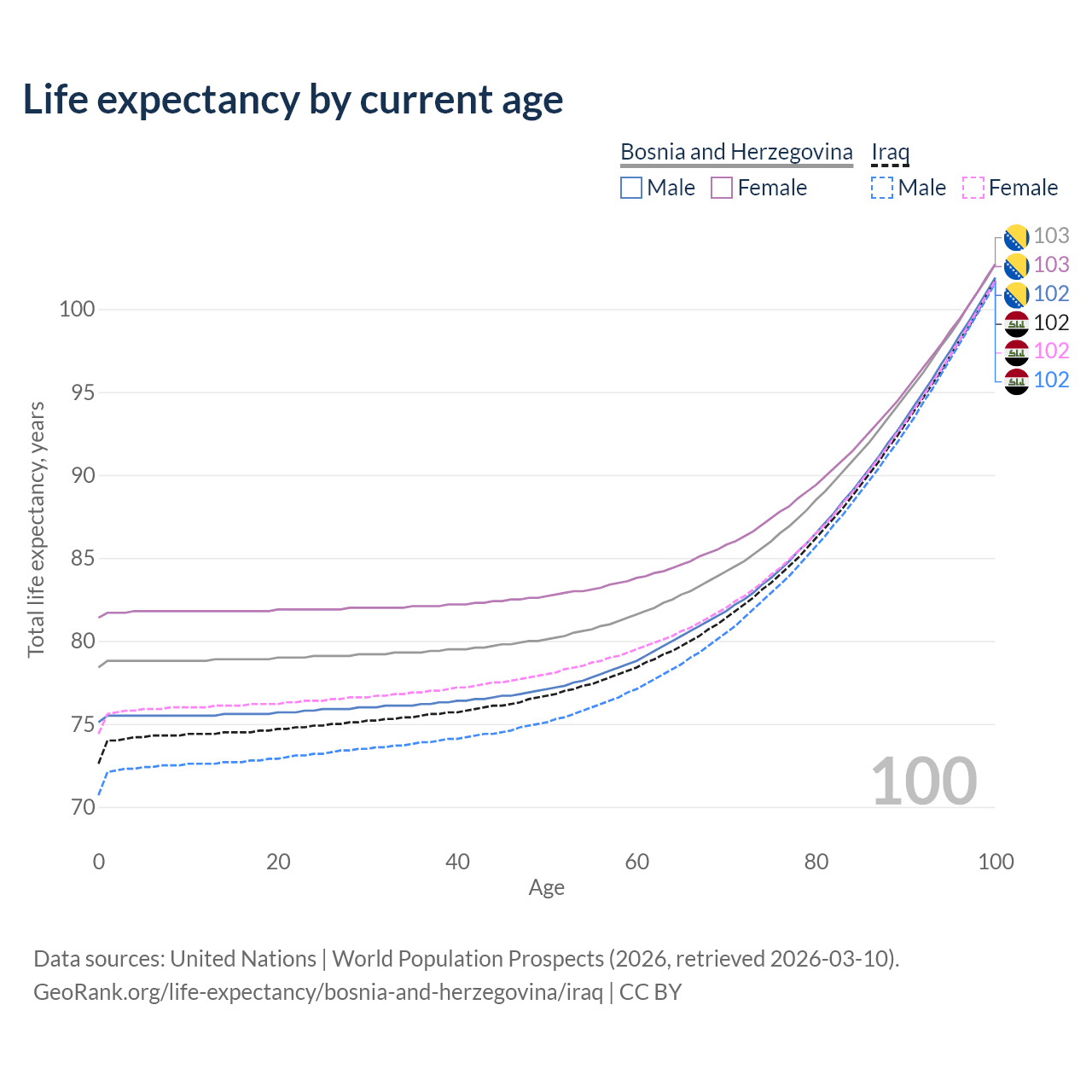 This life expectancy calculator shows the odds of living to 100, 95, 90, and below based on current age for both males and females in Bosnia and Herzegovina and Iraq, along with mean and median age of death. The calculations are based on the 2026 life tables (actuarial tables) from the UN World Population Prospects.