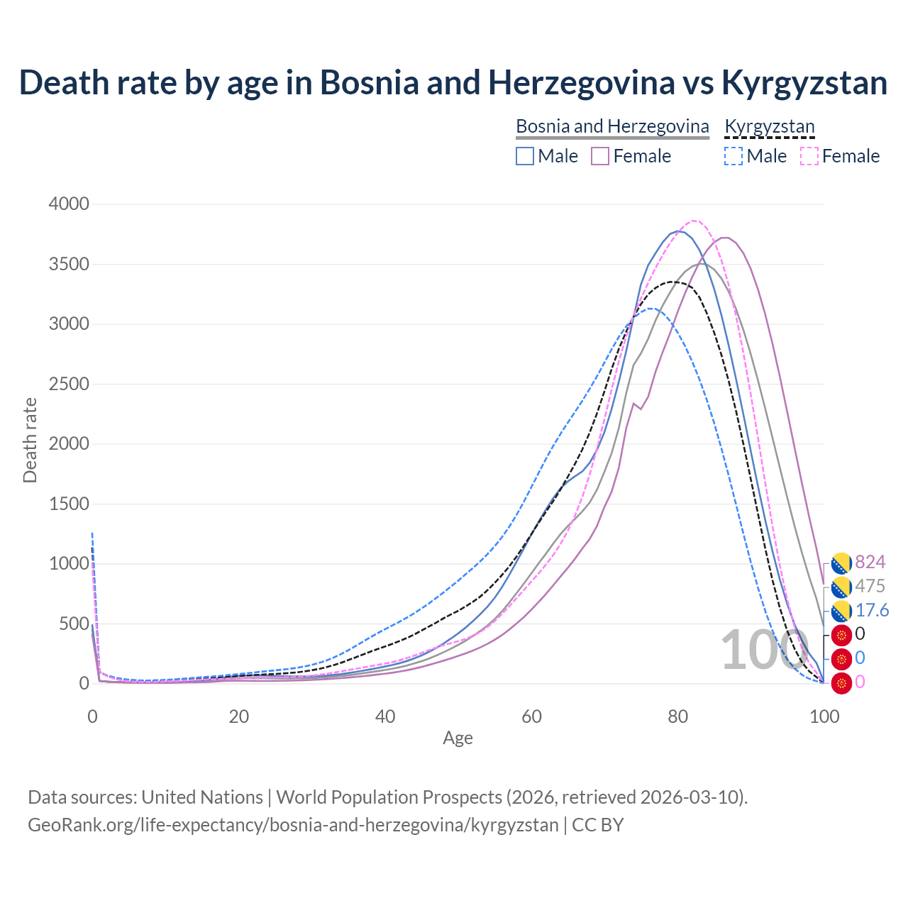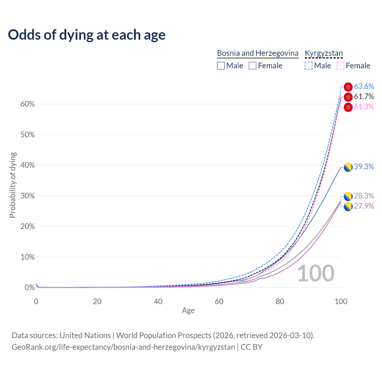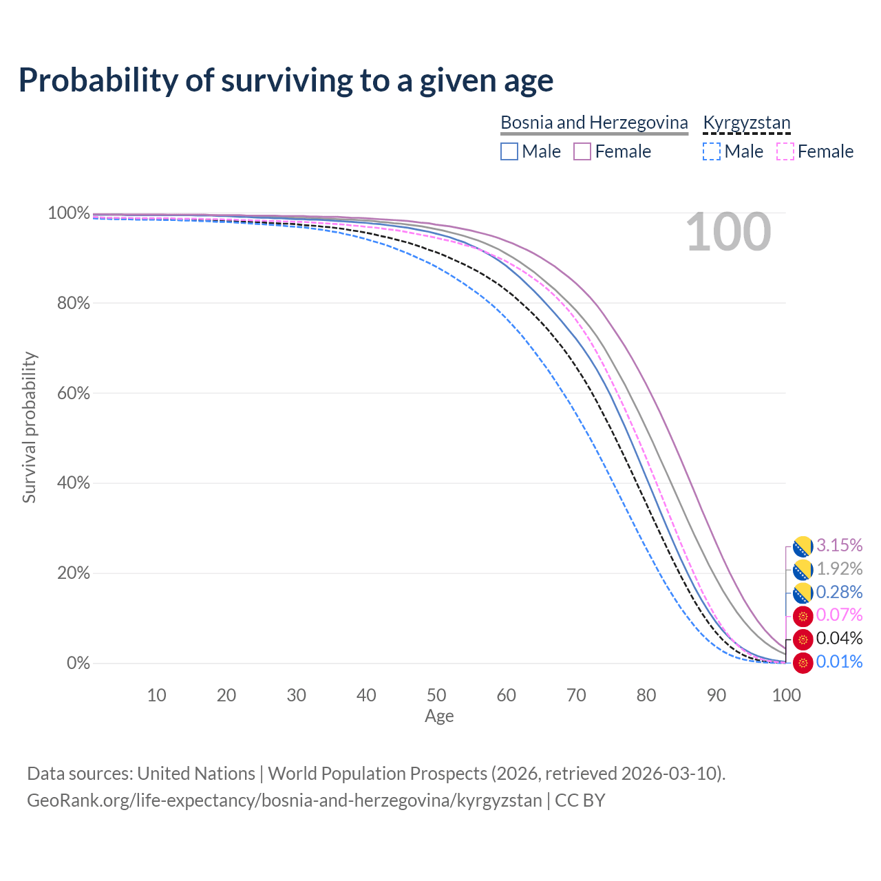 This life expectancy calculator shows the odds of living to 100, 95, 90, and below based on current age for both males and females in Bosnia and Herzegovina and Kyrgyzstan, along with mean and median age of death. The calculations are based on the 2026 life tables (actuarial tables) from the UN World Population Prospects.