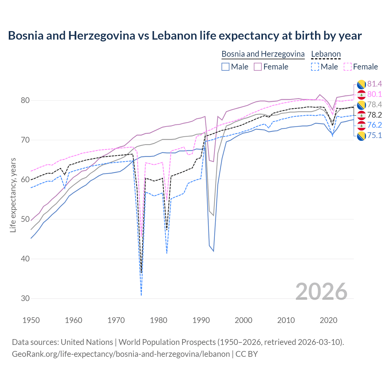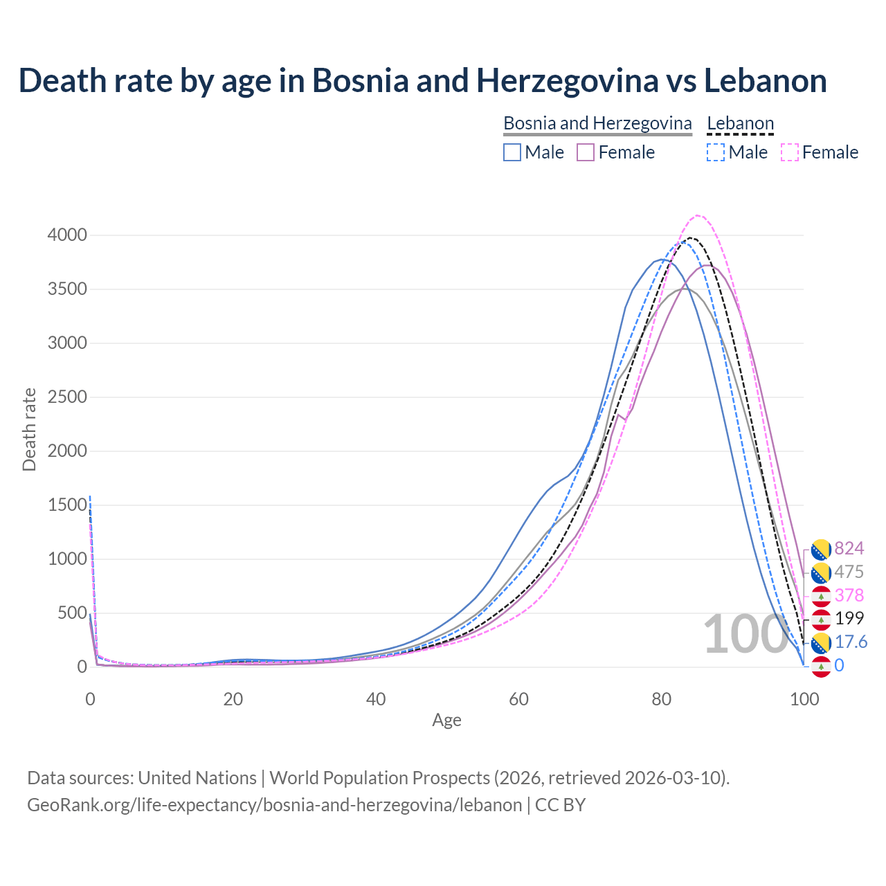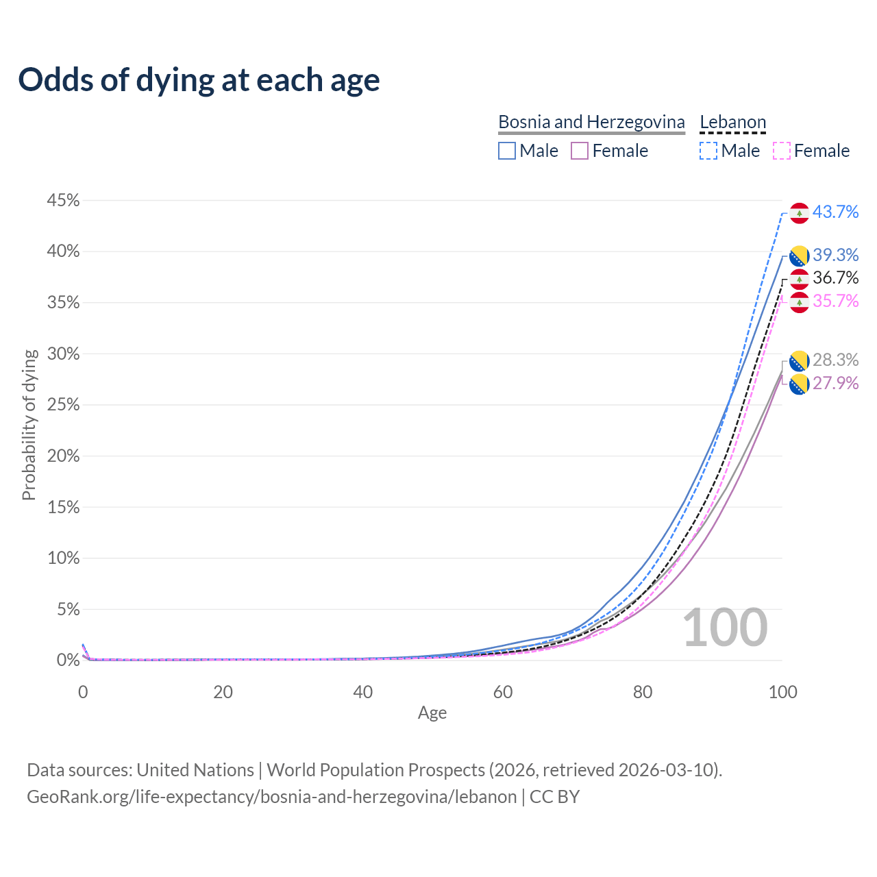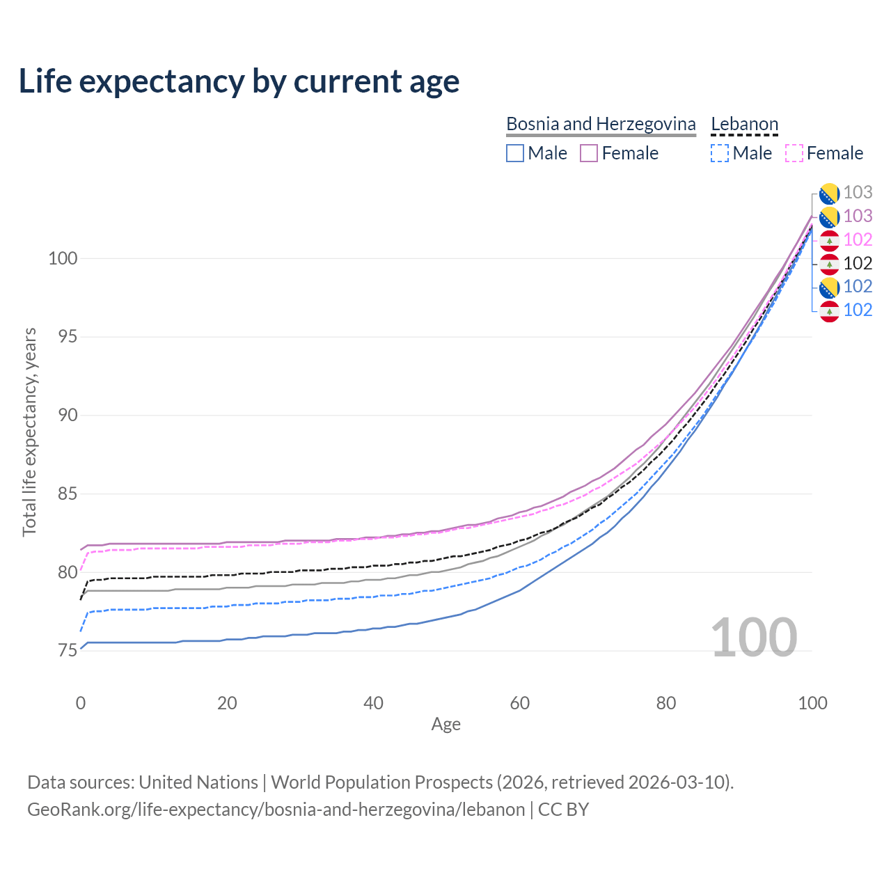 This life expectancy calculator shows the odds of living to 100, 95, 90, and below based on current age for both males and females in Bosnia and Herzegovina and Lebanon, along with mean and median age of death. The calculations are based on the 2026 life tables (actuarial tables) from the UN World Population Prospects.