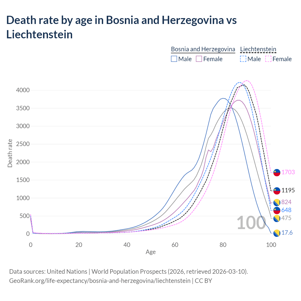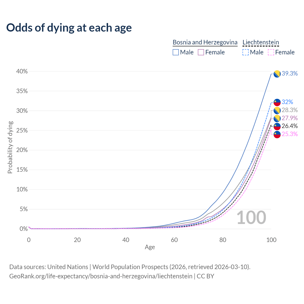 This life expectancy calculator shows the odds of living to 100, 95, 90, and below based on current age for both males and females in Bosnia and Herzegovina and Liechtenstein, along with mean and median age of death. The calculations are based on the 2026 life tables (actuarial tables) from the UN World Population Prospects.