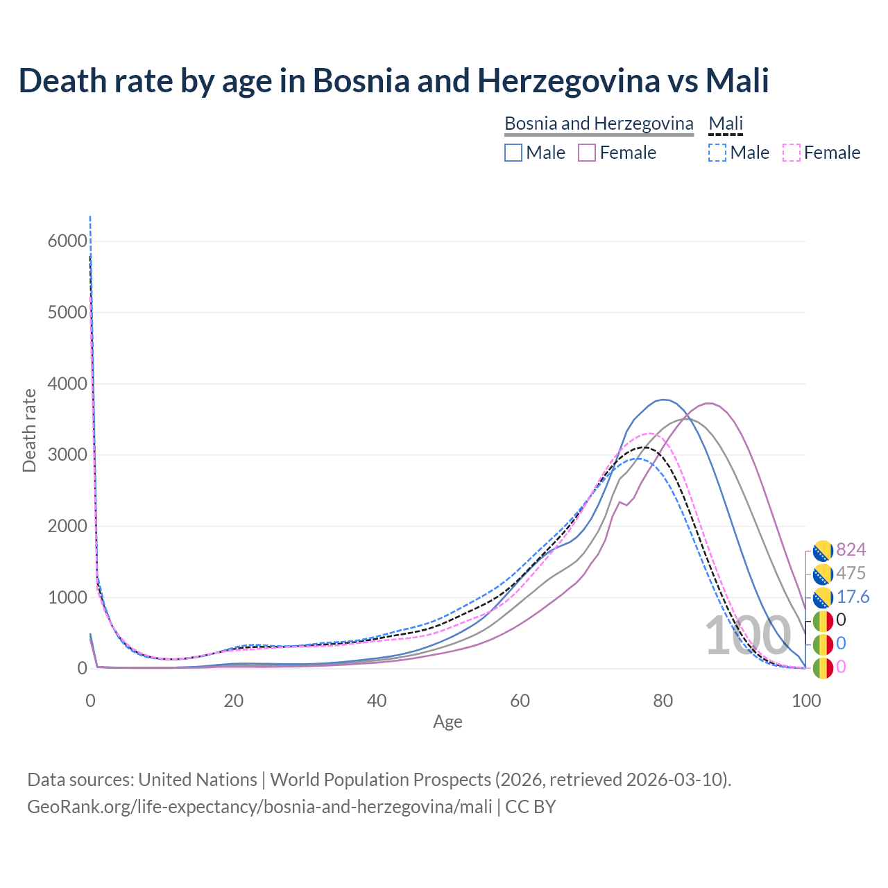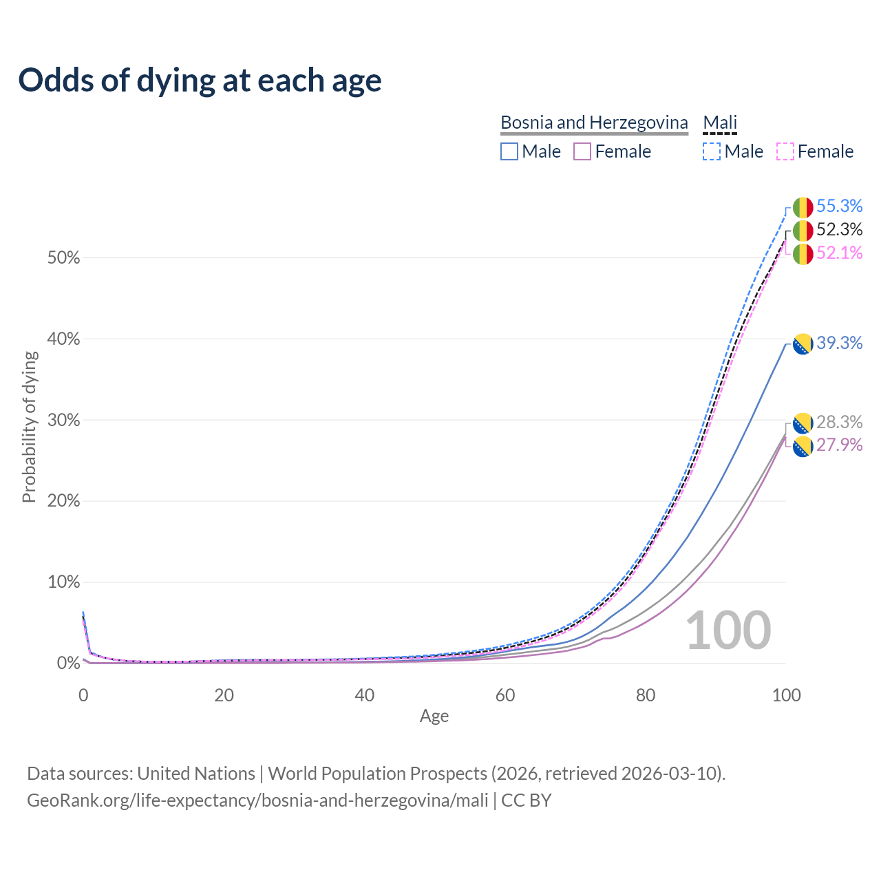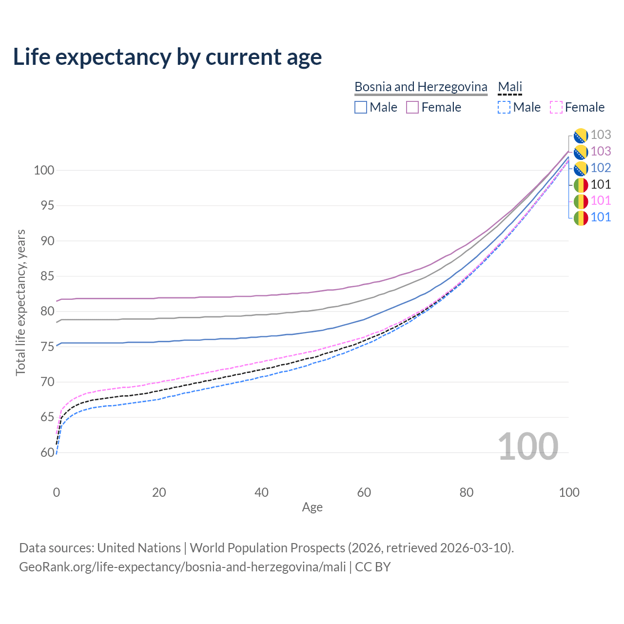 This life expectancy calculator shows the odds of living to 100, 95, 90, and below based on current age for both males and females in Bosnia and Herzegovina and Mali, along with mean and median age of death. The calculations are based on the 2026 life tables (actuarial tables) from the UN World Population Prospects.