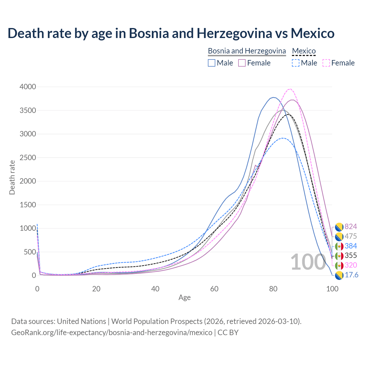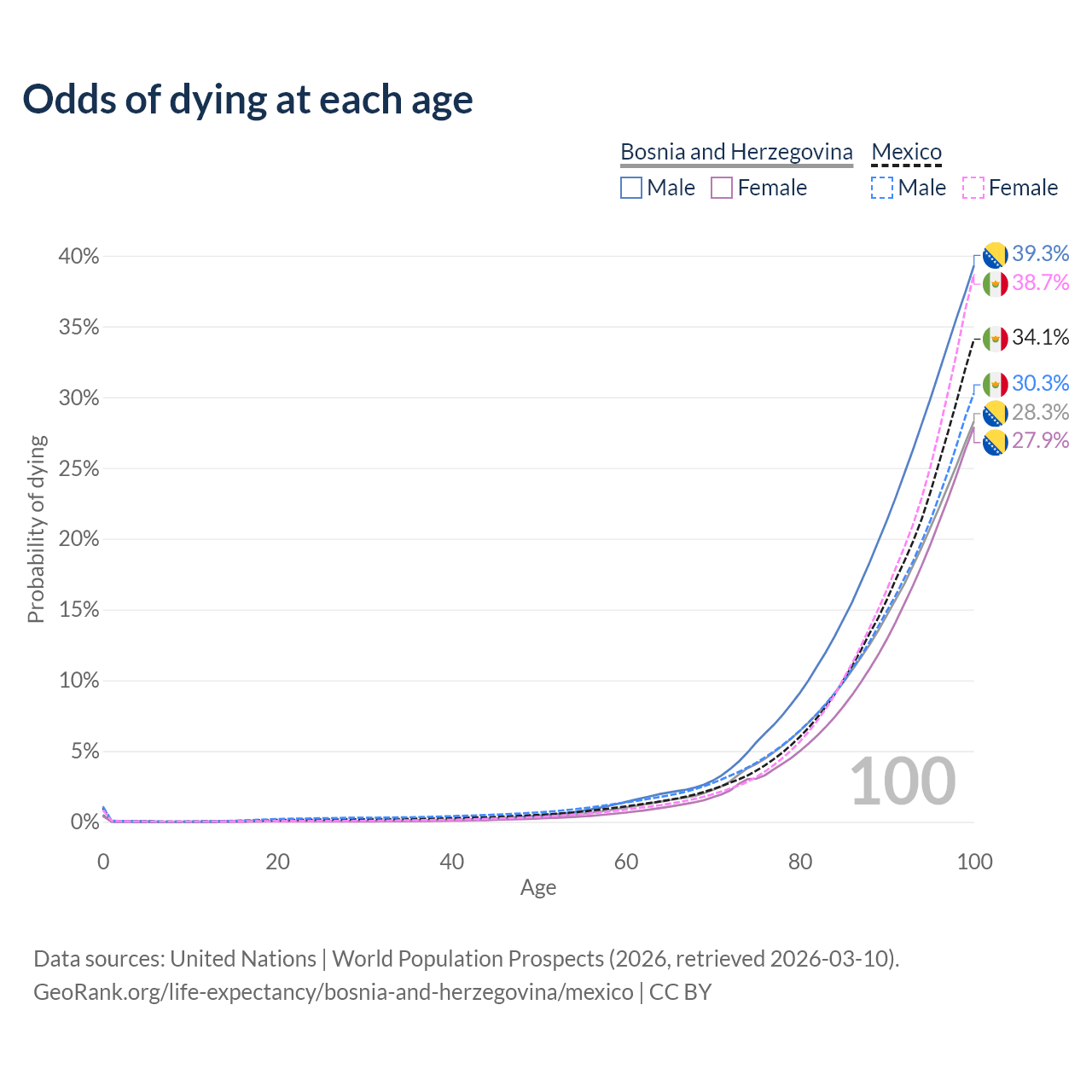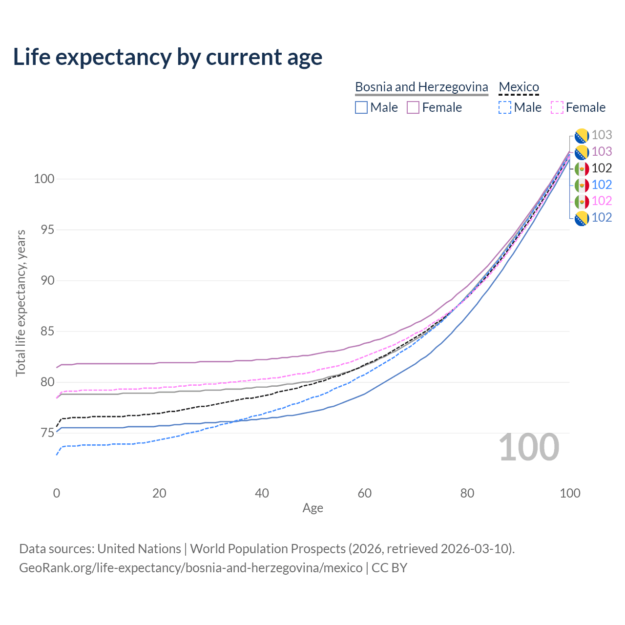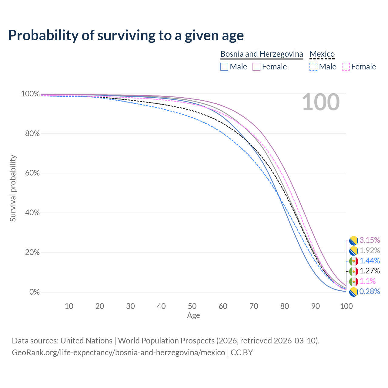 This life expectancy calculator shows the odds of living to 100, 95, 90, and below based on current age for both males and females in Bosnia and Herzegovina and Mexico, along with mean and median age of death. The calculations are based on the 2026 life tables (actuarial tables) from the UN World Population Prospects.