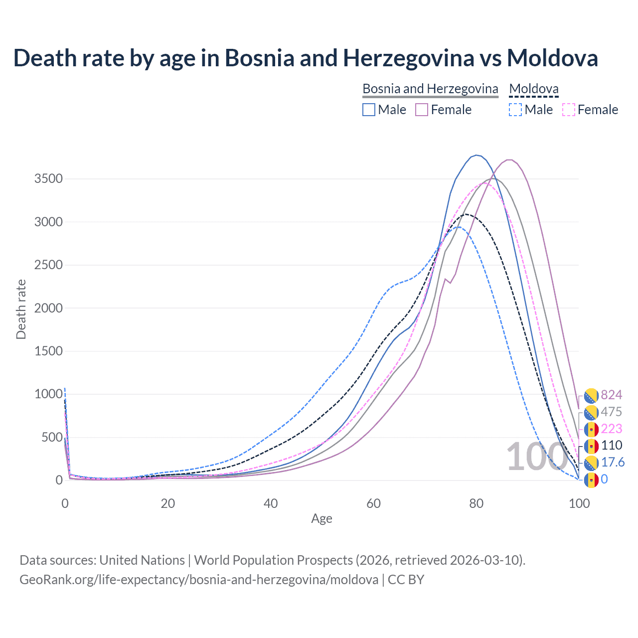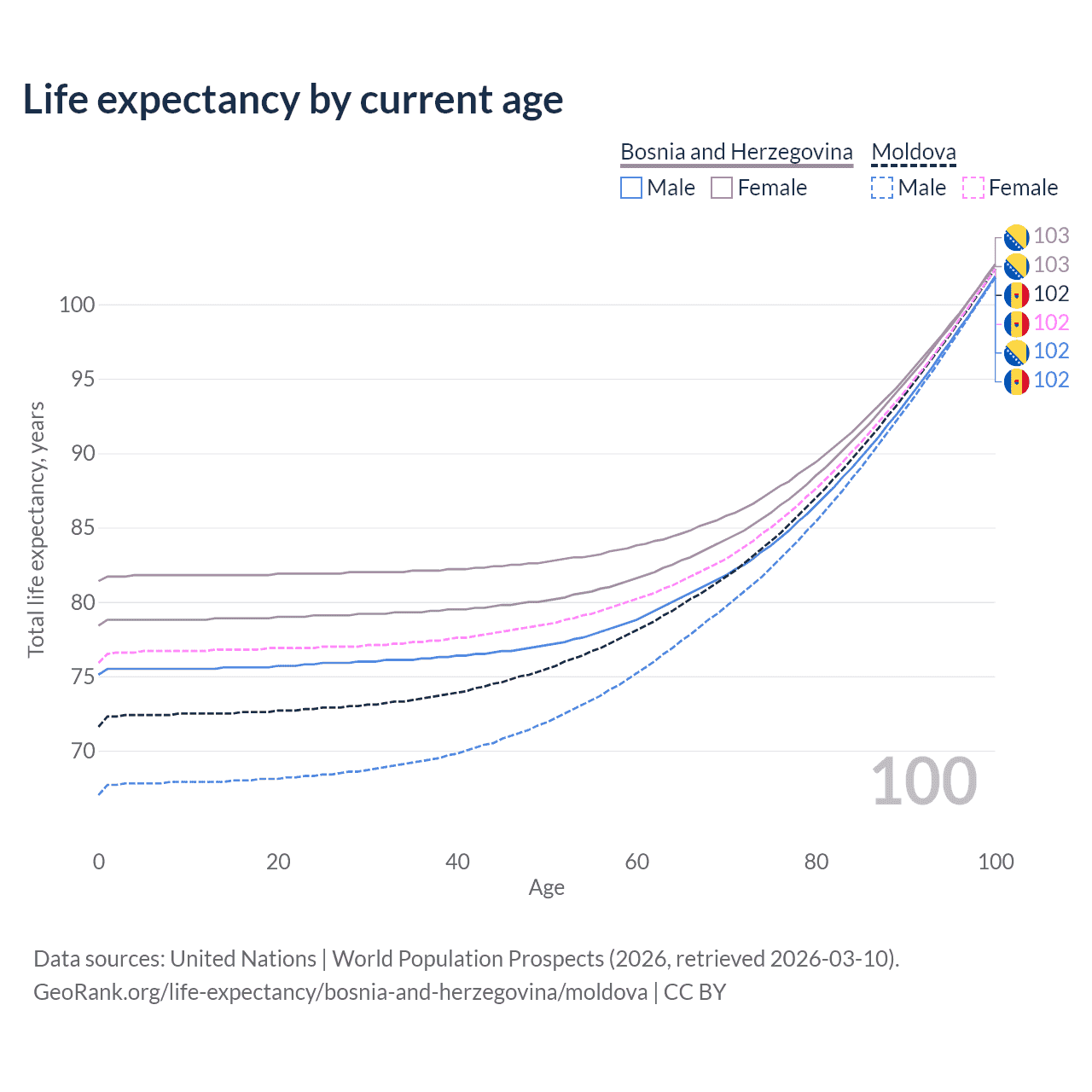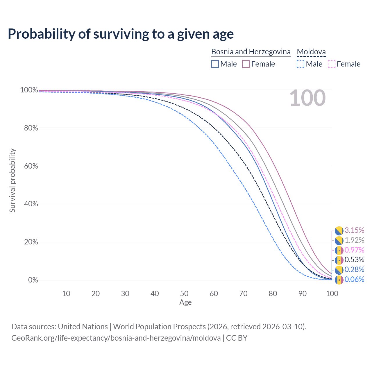 This life expectancy calculator shows the odds of living to 100, 95, 90, and below based on current age for both males and females in Bosnia and Herzegovina and Moldova, along with mean and median age of death. The calculations are based on the 2026 life tables (actuarial tables) from the UN World Population Prospects.