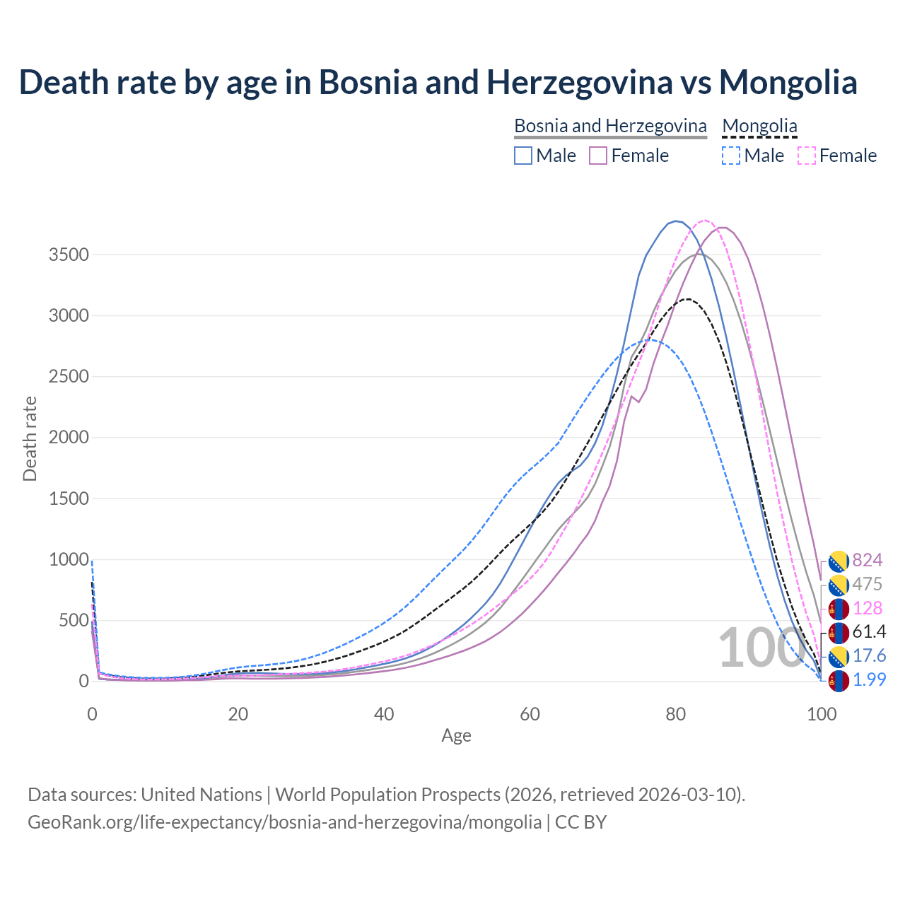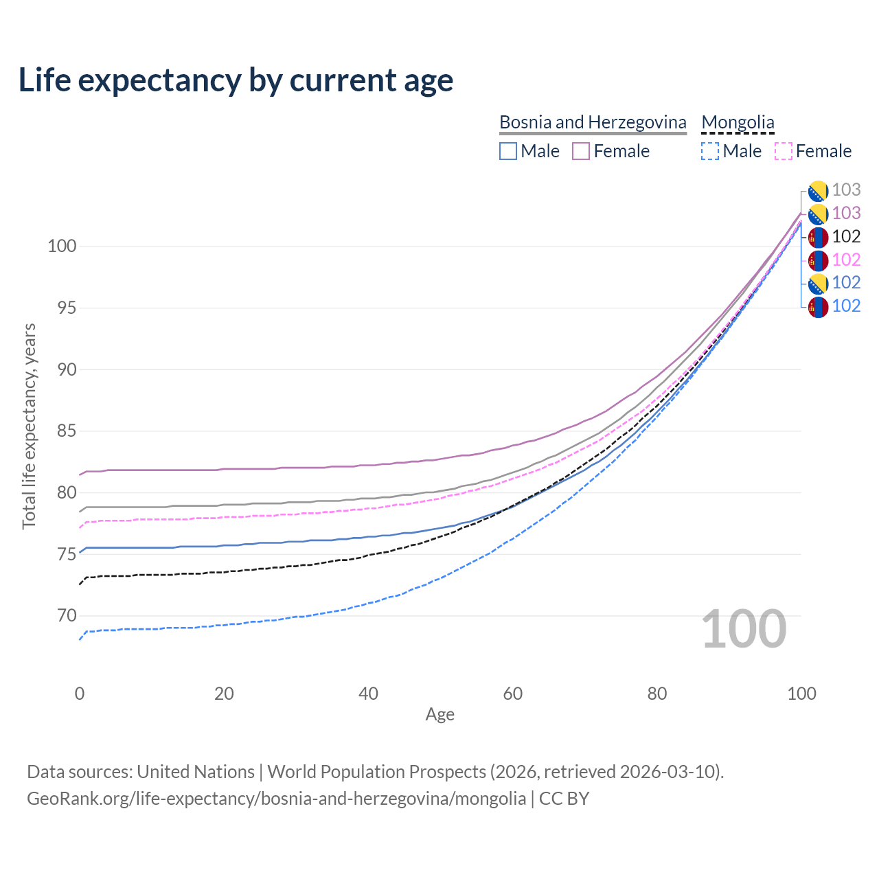 This life expectancy calculator shows the odds of living to 100, 95, 90, and below based on current age for both males and females in Bosnia and Herzegovina and Mongolia, along with mean and median age of death. The calculations are based on the 2026 life tables (actuarial tables) from the UN World Population Prospects.
