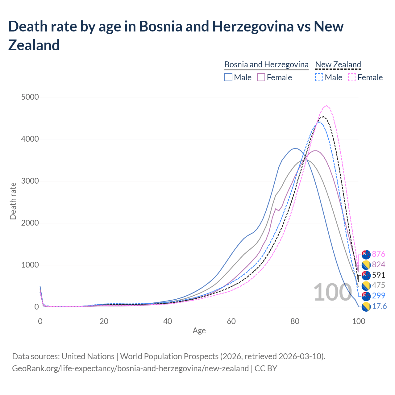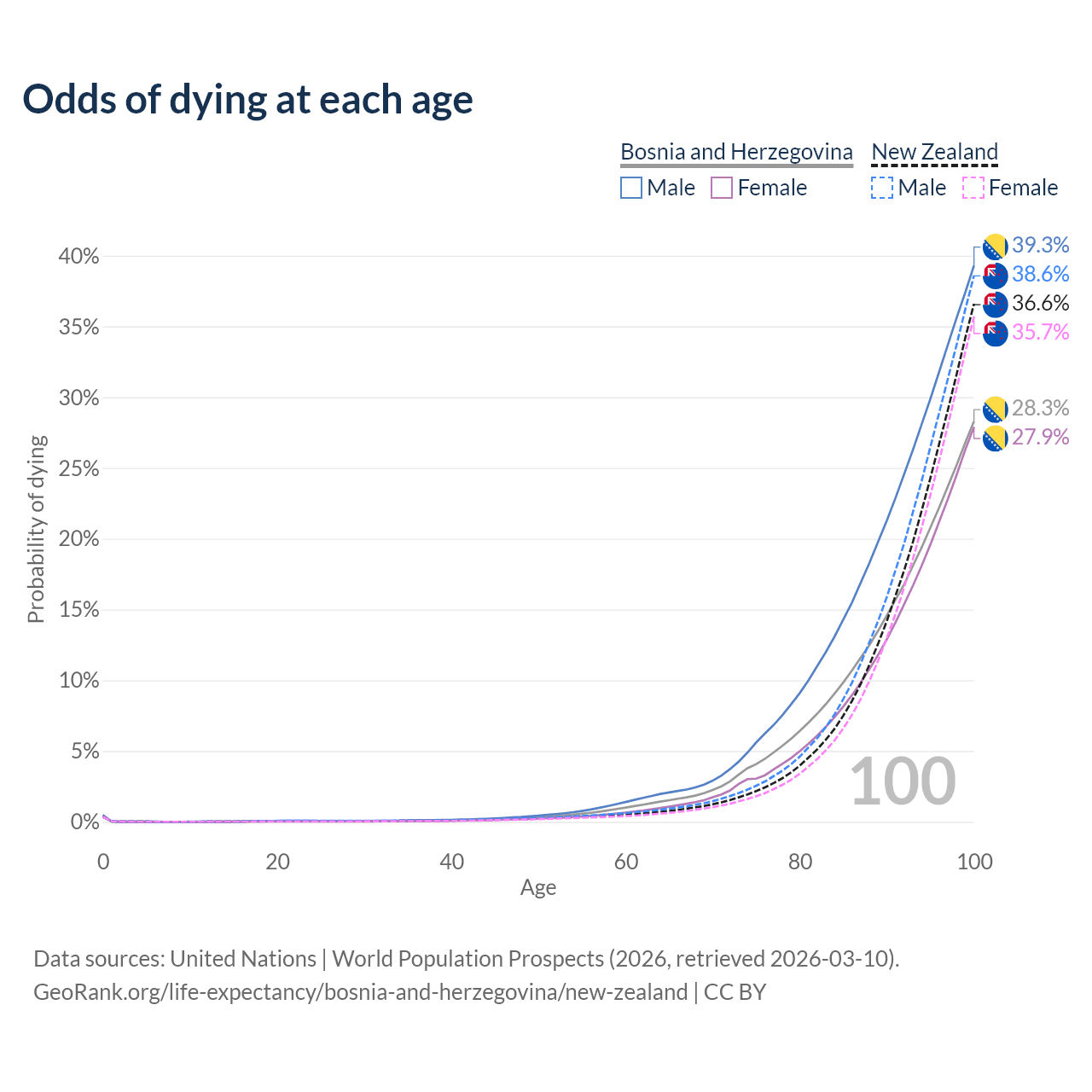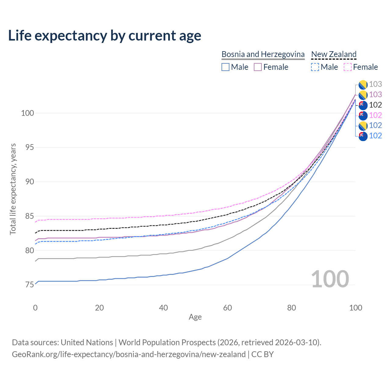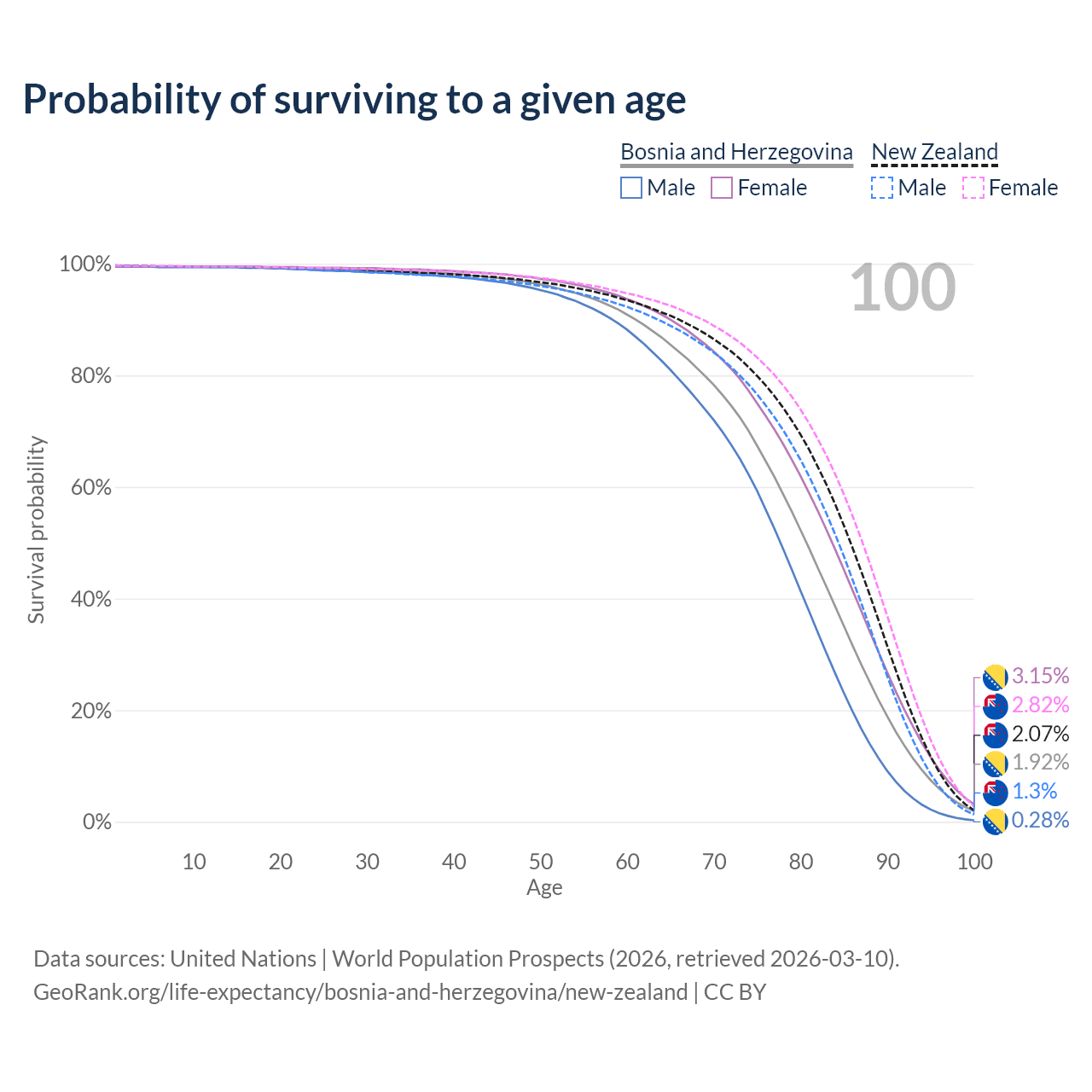This life expectancy calculator shows the odds of living to 100, 95, 90, and below based on current age for both males and females in Bosnia and Herzegovina and New Zealand, along with mean and median age of death. The calculations are based on the 2026 life tables (actuarial tables) from the UN World Population Prospects.