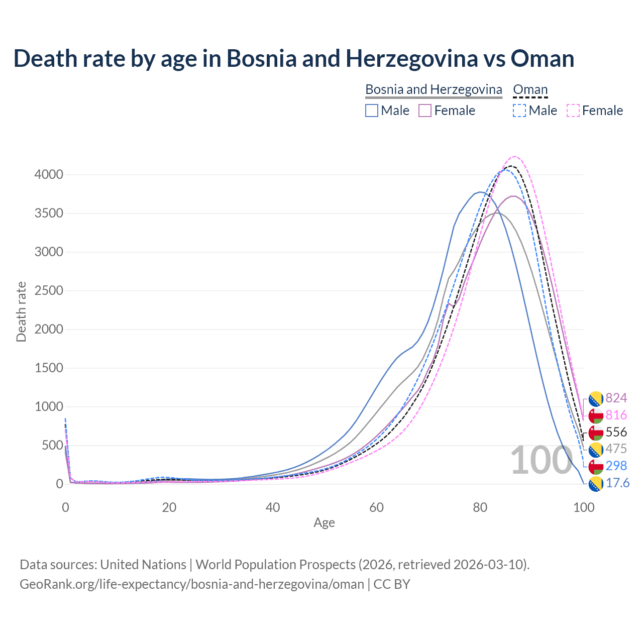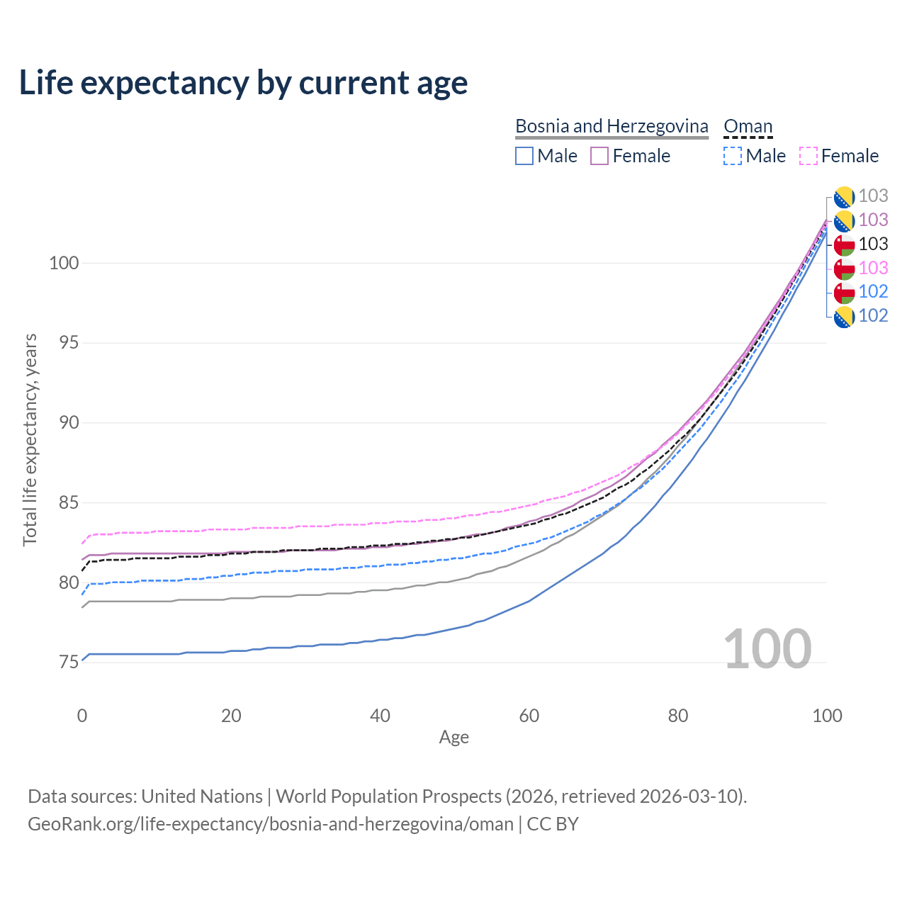 This life expectancy calculator shows the odds of living to 100, 95, 90, and below based on current age for both males and females in Bosnia and Herzegovina and Oman, along with mean and median age of death. The calculations are based on the 2026 life tables (actuarial tables) from the UN World Population Prospects.