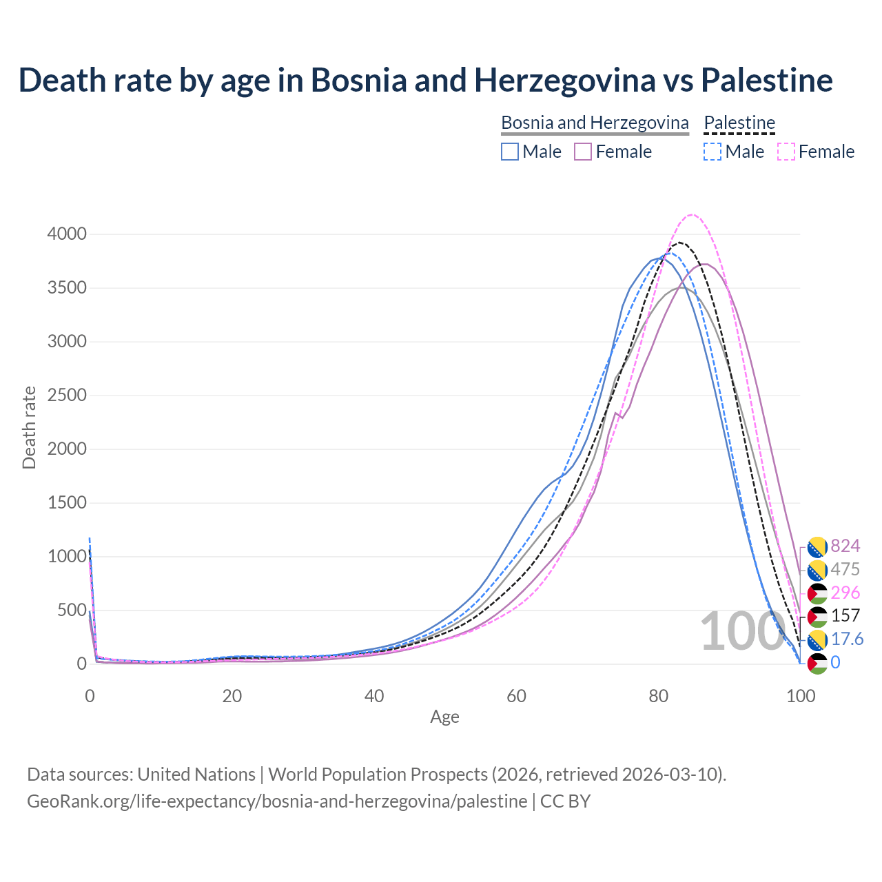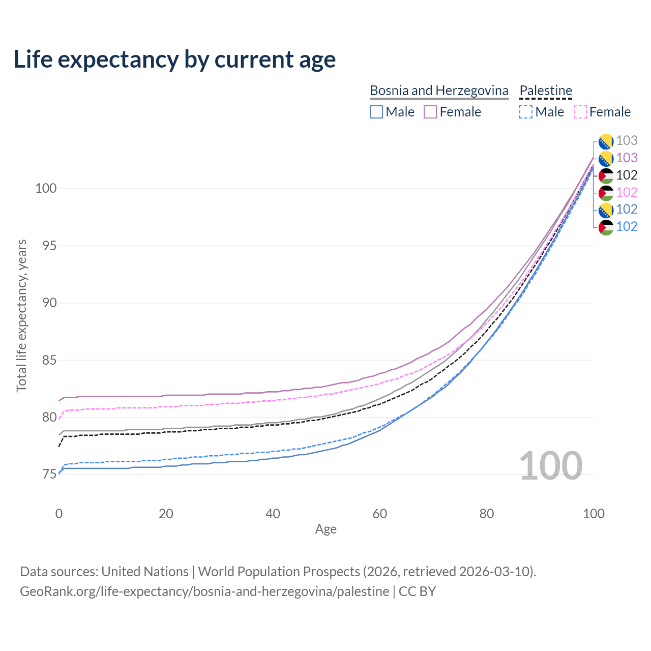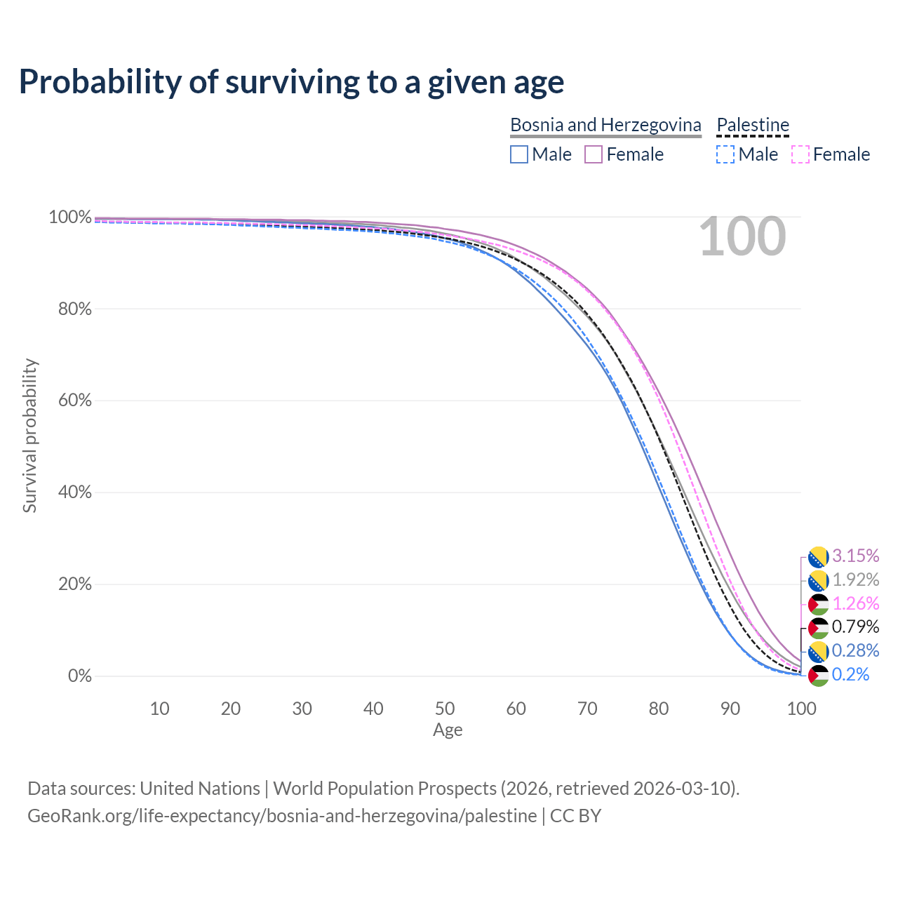 This life expectancy calculator shows the odds of living to 100, 95, 90, and below based on current age for both males and females in Bosnia and Herzegovina and Palestine, along with mean and median age of death. The calculations are based on the 2026 life tables (actuarial tables) from the UN World Population Prospects.