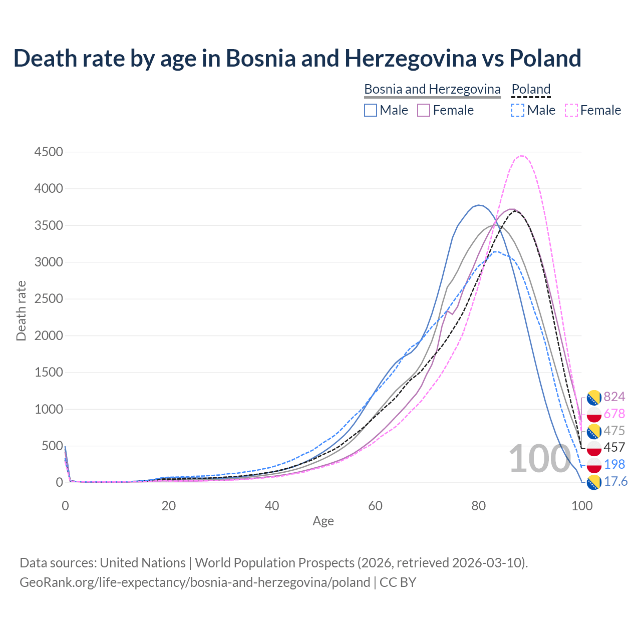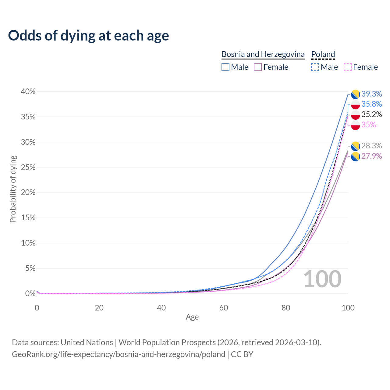 This life expectancy calculator shows the odds of living to 100, 95, 90, and below based on current age for both males and females in Bosnia and Herzegovina and Poland, along with mean and median age of death. The calculations are based on the 2026 life tables (actuarial tables) from the UN World Population Prospects.