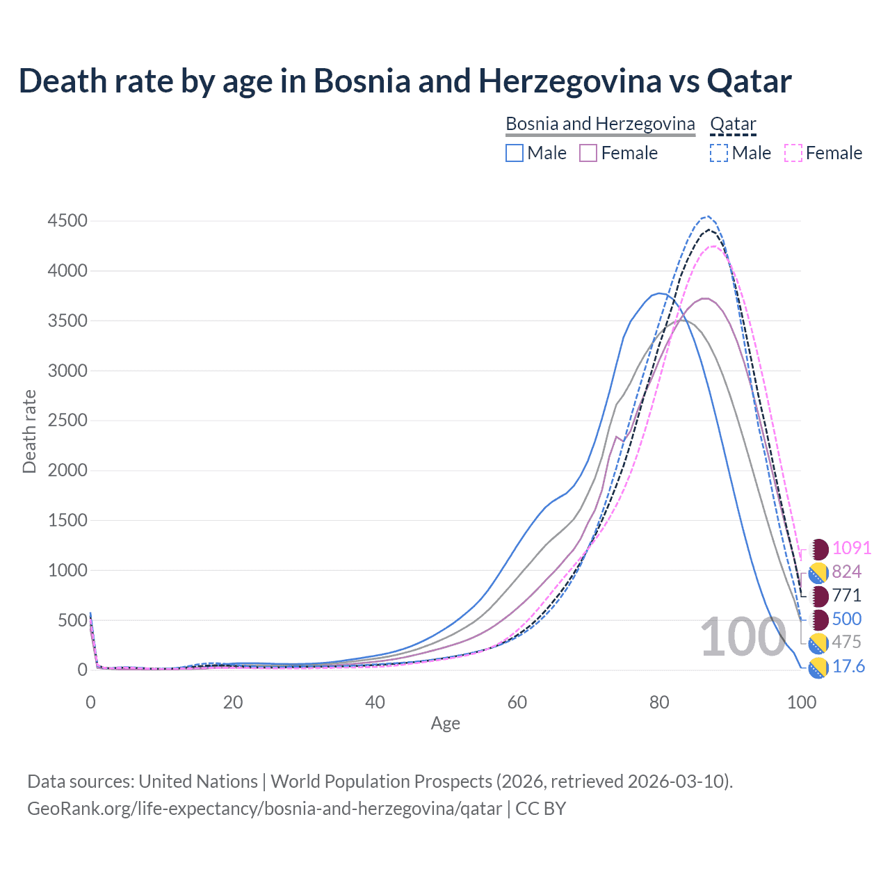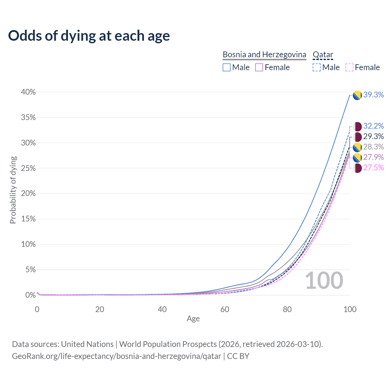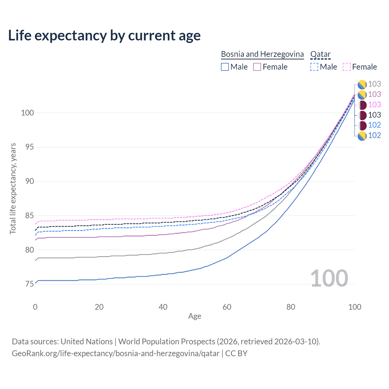This life expectancy calculator shows the odds of living to 100, 95, 90, and below based on current age for both males and females in Bosnia and Herzegovina and Qatar, along with mean and median age of death. The calculations are based on the 2026 life tables (actuarial tables) from the UN World Population Prospects.