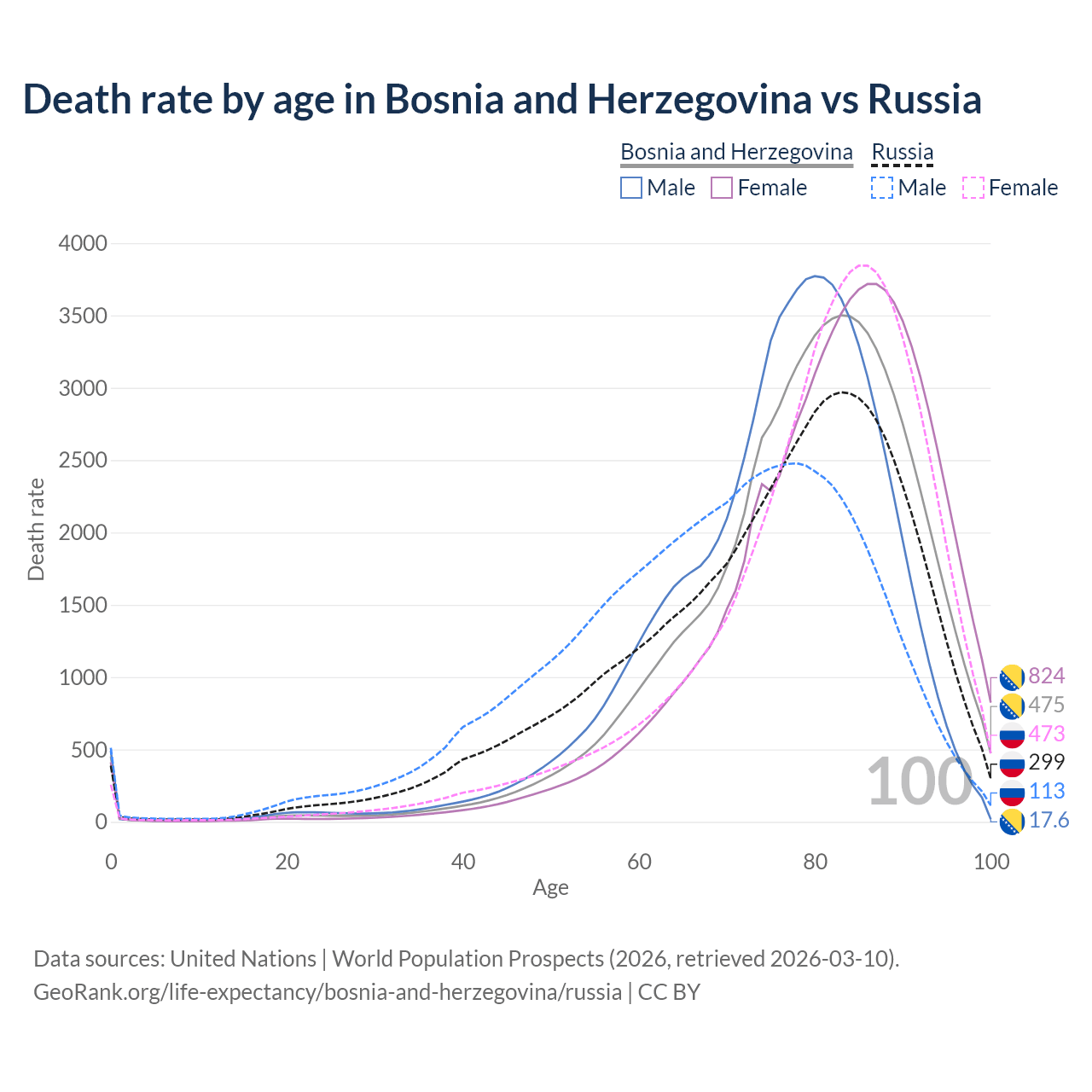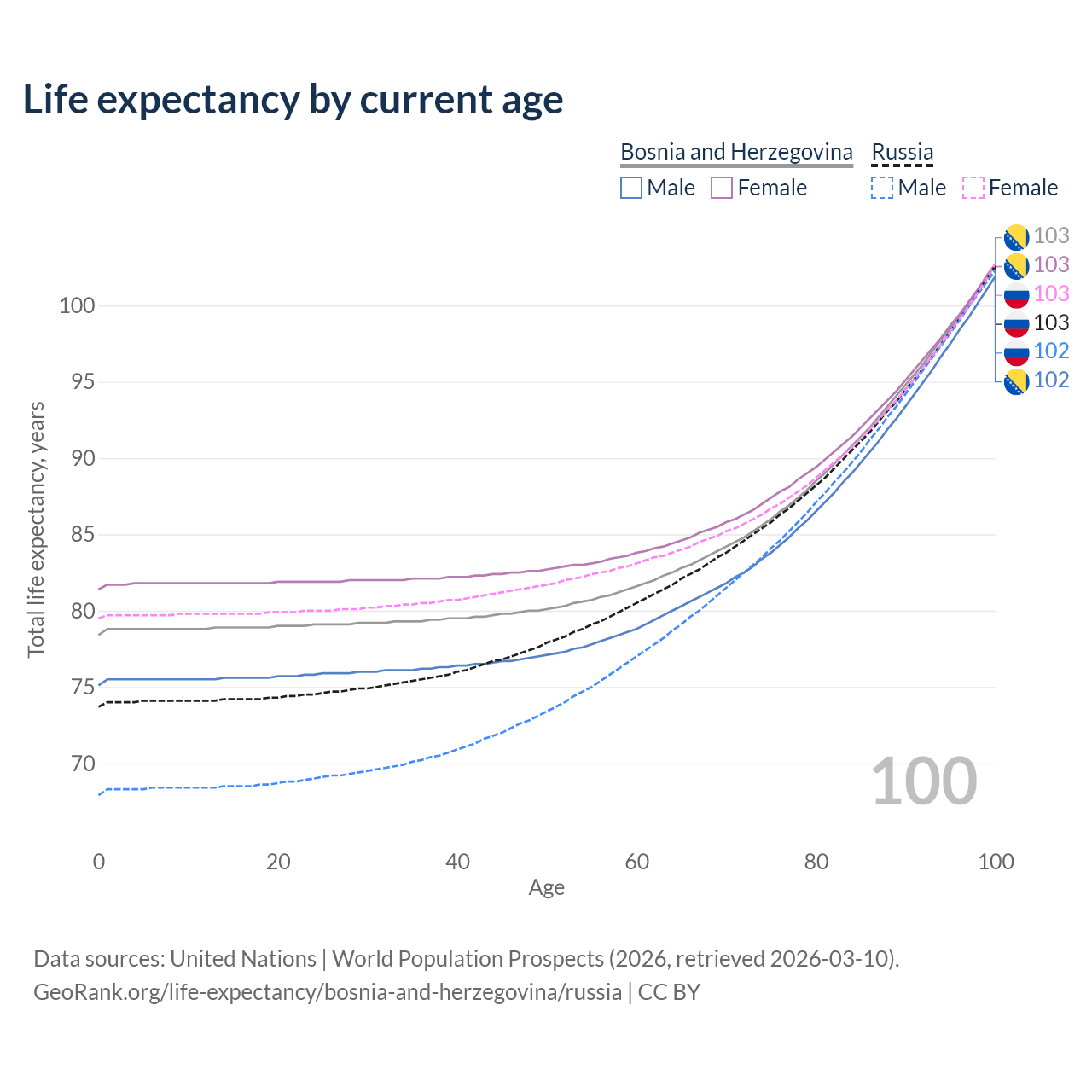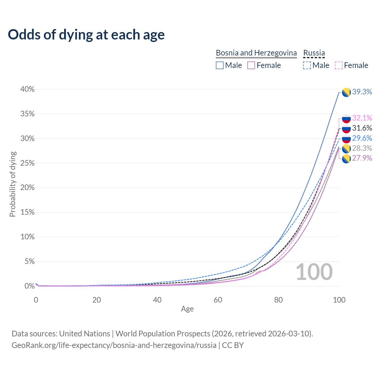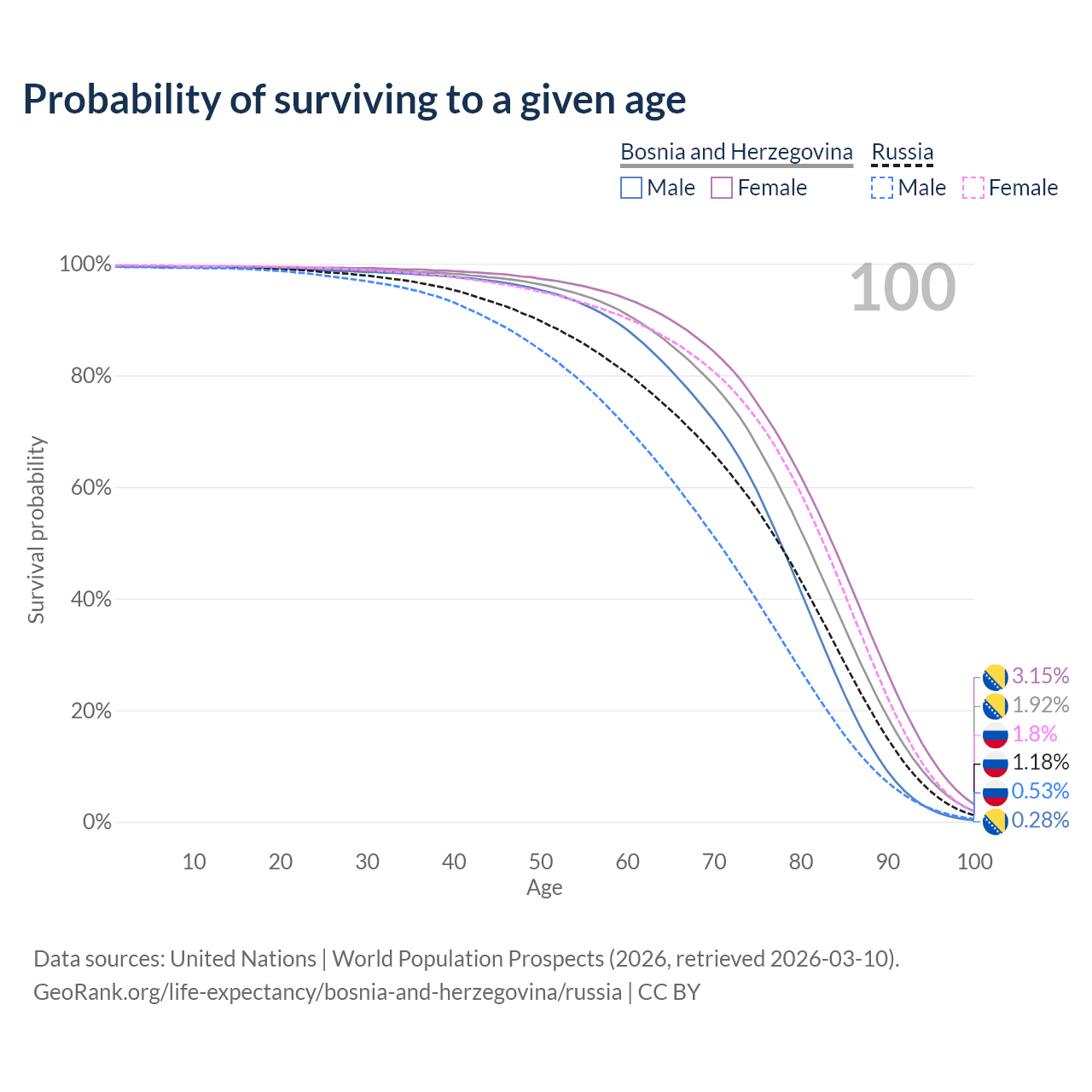 This life expectancy calculator shows the odds of living to 100, 95, 90, and below based on current age for both males and females in Bosnia and Herzegovina and Russia, along with mean and median age of death. The calculations are based on the 2026 life tables (actuarial tables) from the UN World Population Prospects.