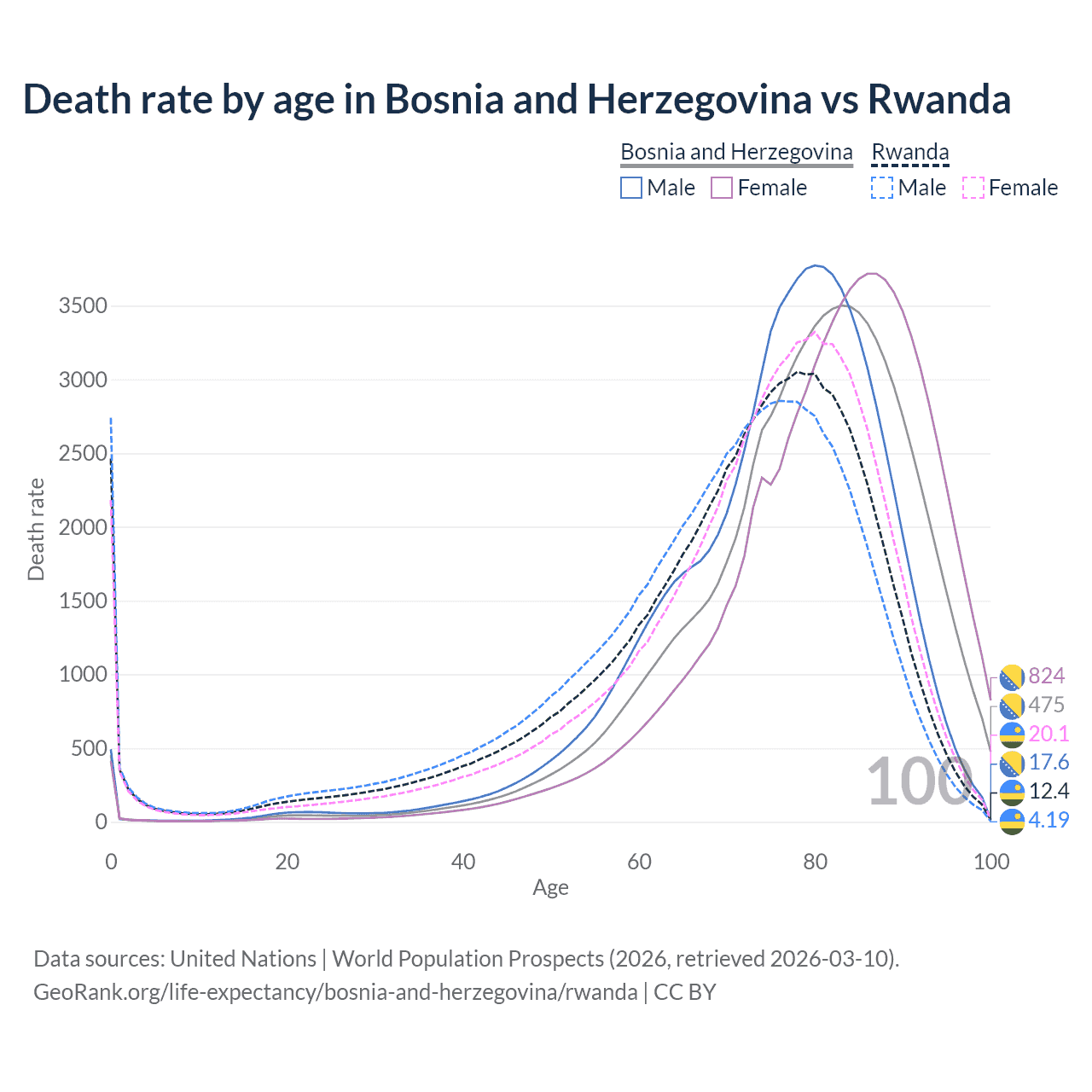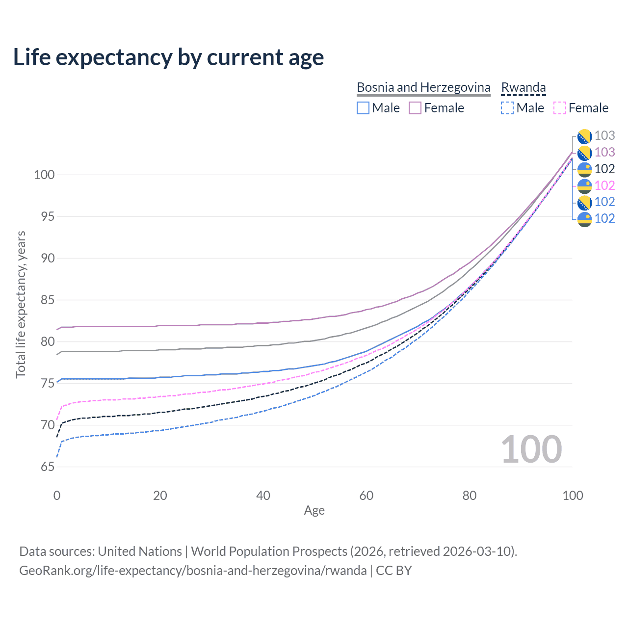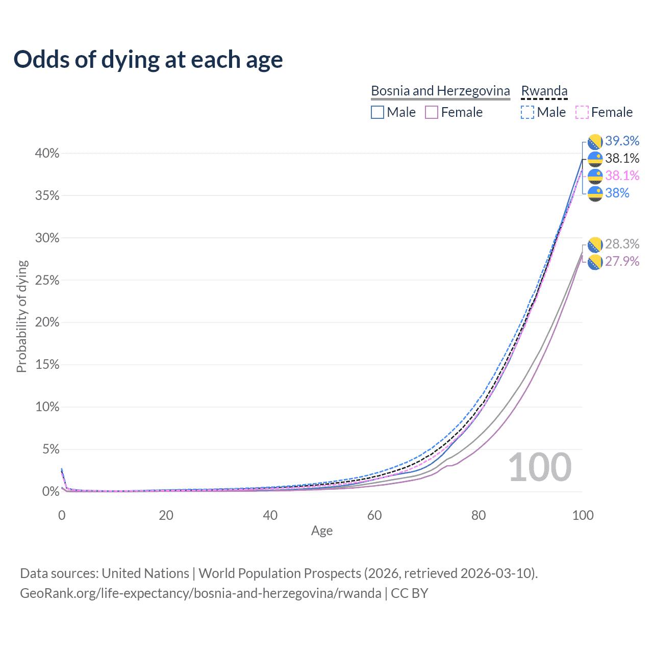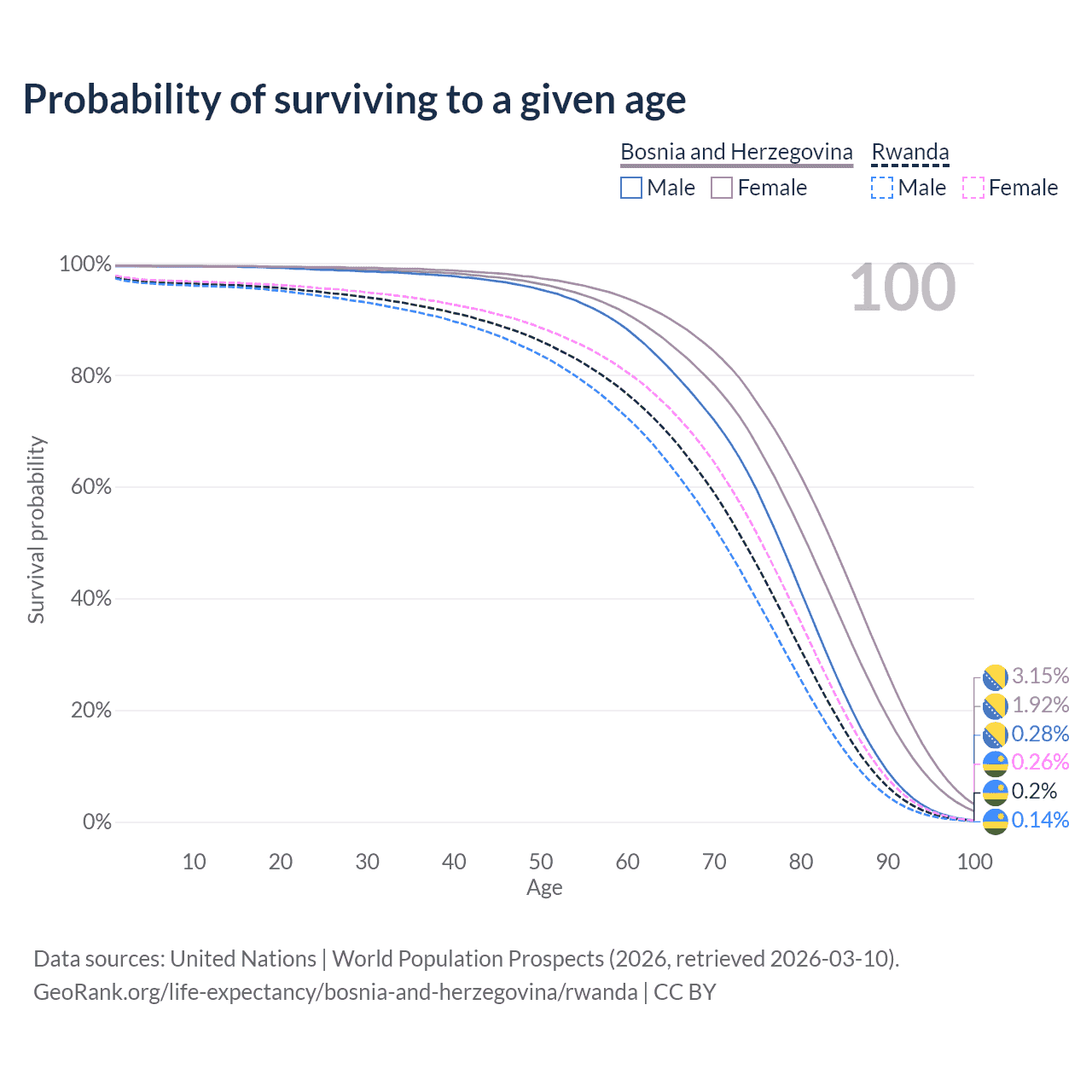 This life expectancy calculator shows the odds of living to 100, 95, 90, and below based on current age for both males and females in Bosnia and Herzegovina and Rwanda, along with mean and median age of death. The calculations are based on the 2026 life tables (actuarial tables) from the UN World Population Prospects.