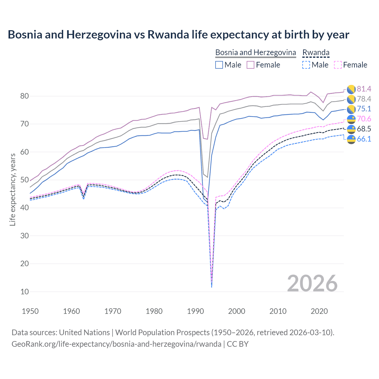 The average life expectancy at birth is 78.4 years in Bosnia and Herzegovina vs 68.5 in Rwanda. Bosnia and Herzegovina is ranked 56/197 by life expectancy, and Rwanda is 148/197. In Bosnia and Herzegovina, the life expectancy is 75.1 years for males and 81.4 years for females. In Rwanda, it's 66.1 years for males and 70.6 years for females.
