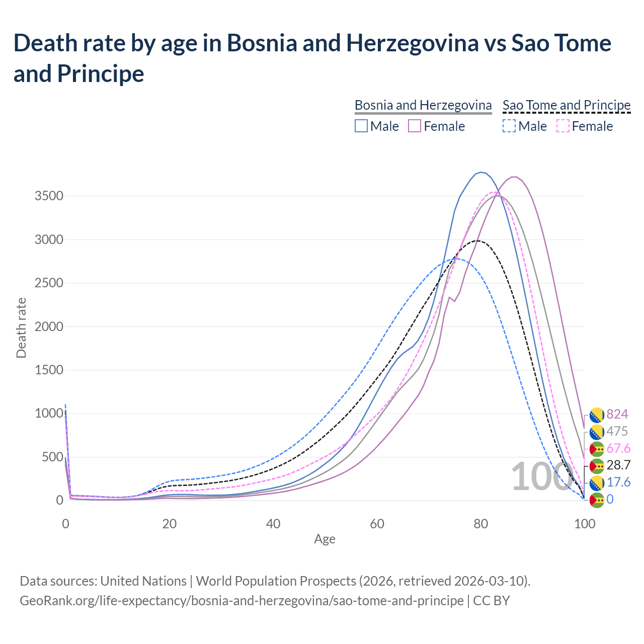 In Bosnia and Herzegovina, the most common age of death is 83, compared to 79 in Sao Tome and Principe. The median age of death is 80.7 in Bosnia and Herzegovina and 74.1 in Sao Tome and Principe, meaning only half of each cohort is expected to live past that age.