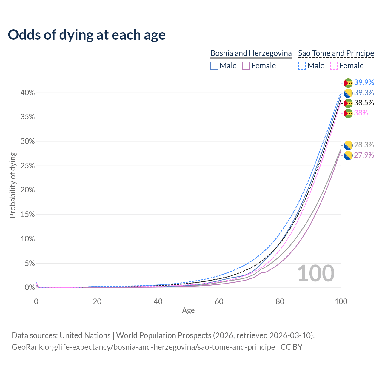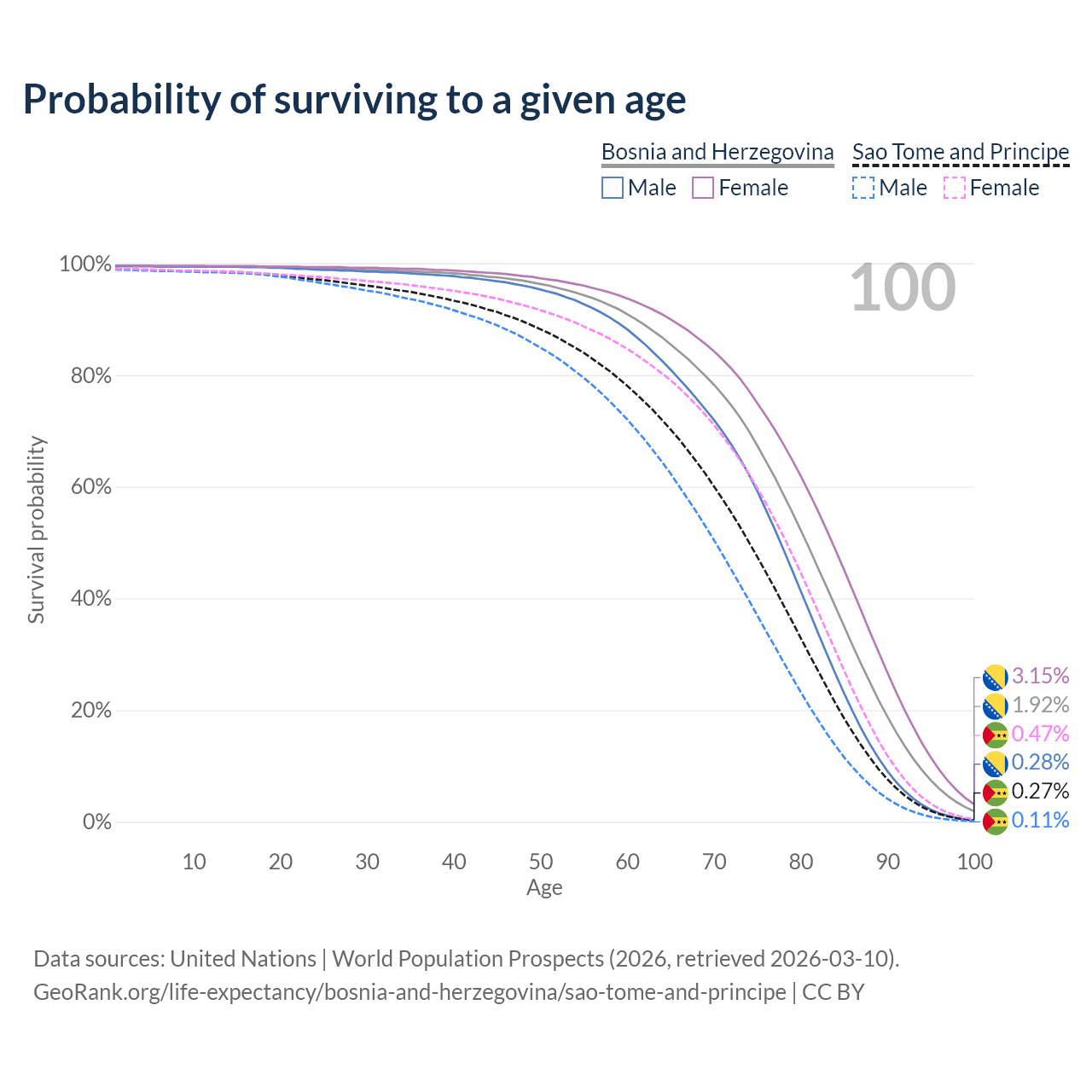 This life expectancy calculator shows the odds of living to 100, 95, 90, and below based on current age for both males and females in Bosnia and Herzegovina and Sao Tome and Principe, along with mean and median age of death. The calculations are based on the 2026 life tables (actuarial tables) from the UN World Population Prospects.